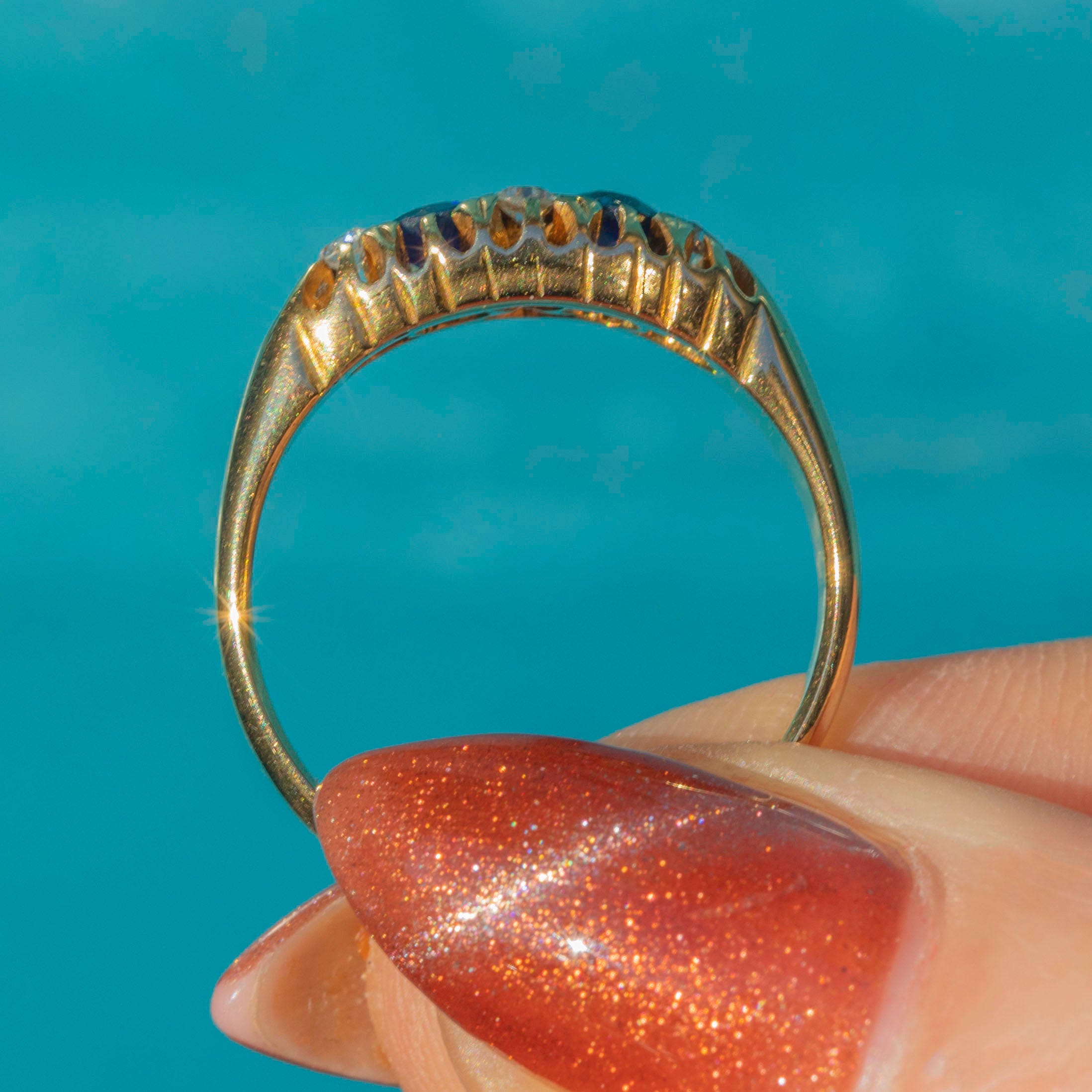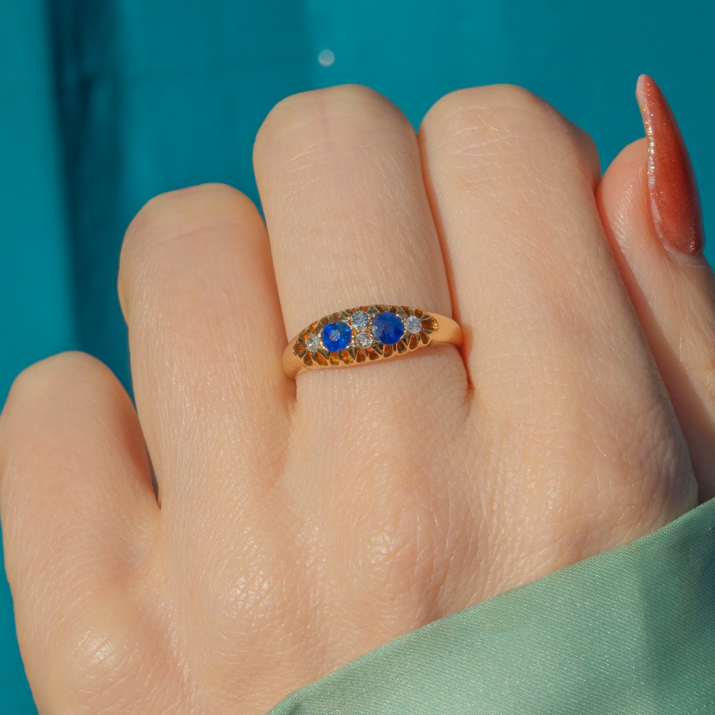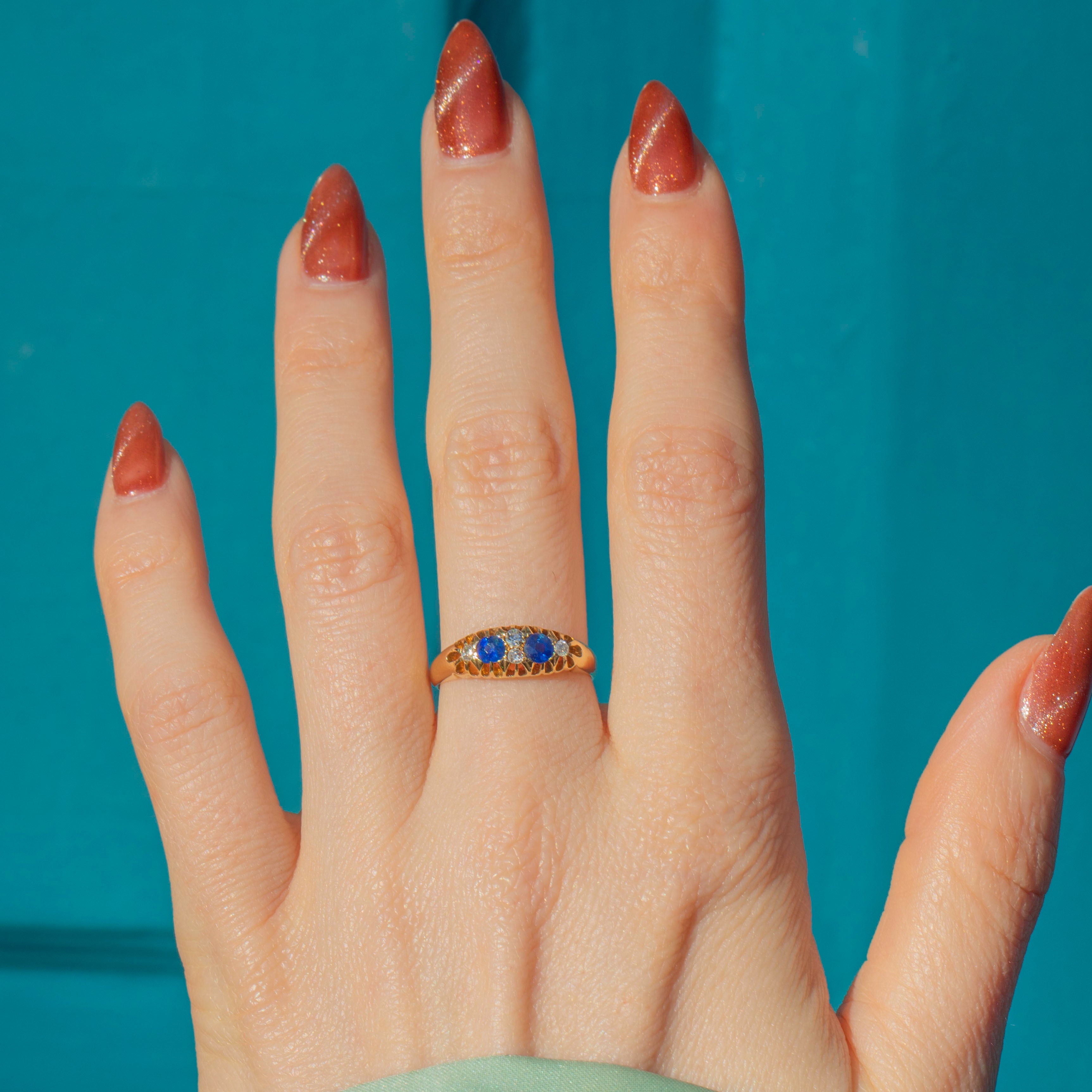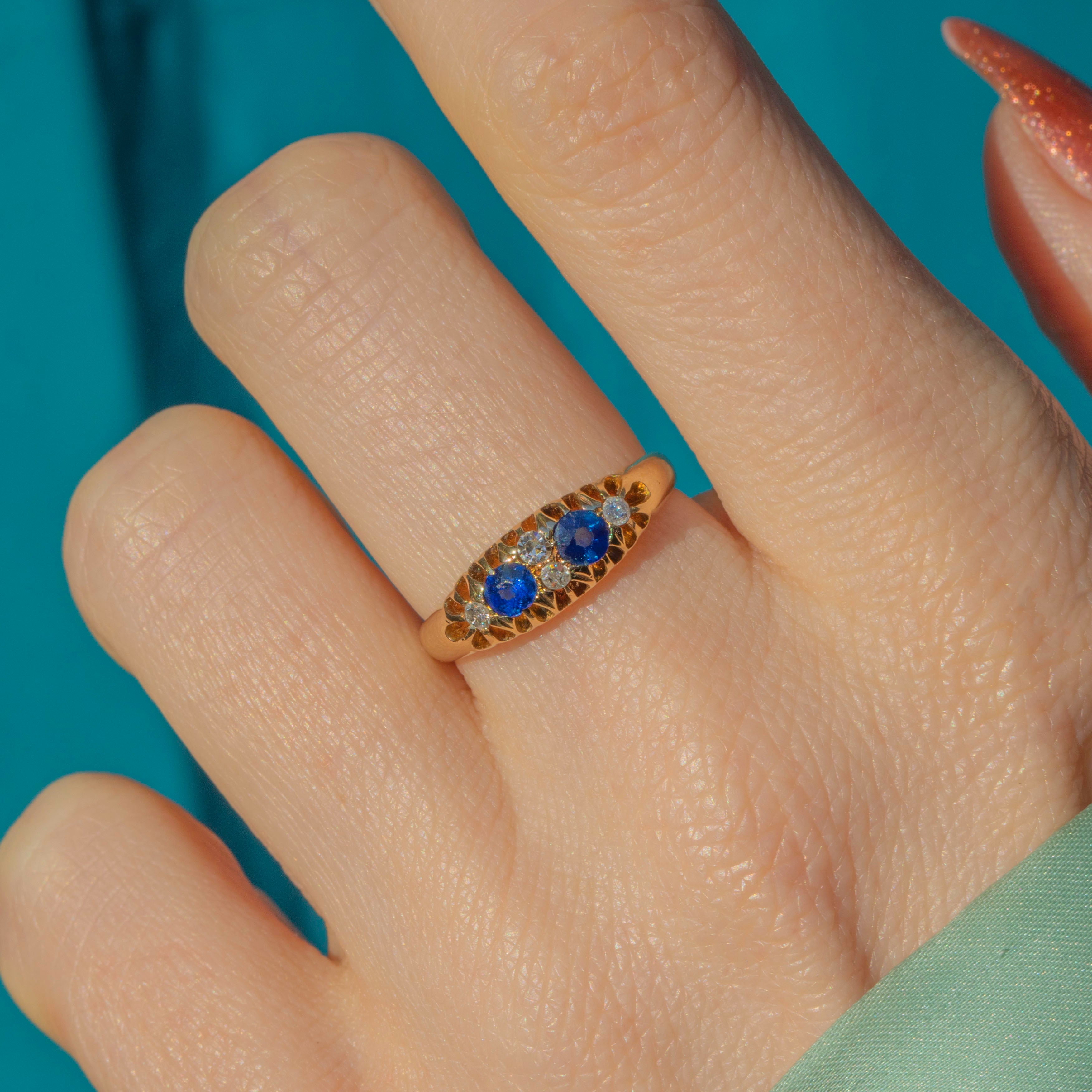 The band is crafted from saturated and luxurious 18ct Gold, the perfect backdrop for the sweet Sapphires and dazzling Diamonds. With a full set of English hallmarks dating to 1913, this antique Sapphire Diamond ring will make a coveted addition to your collection!