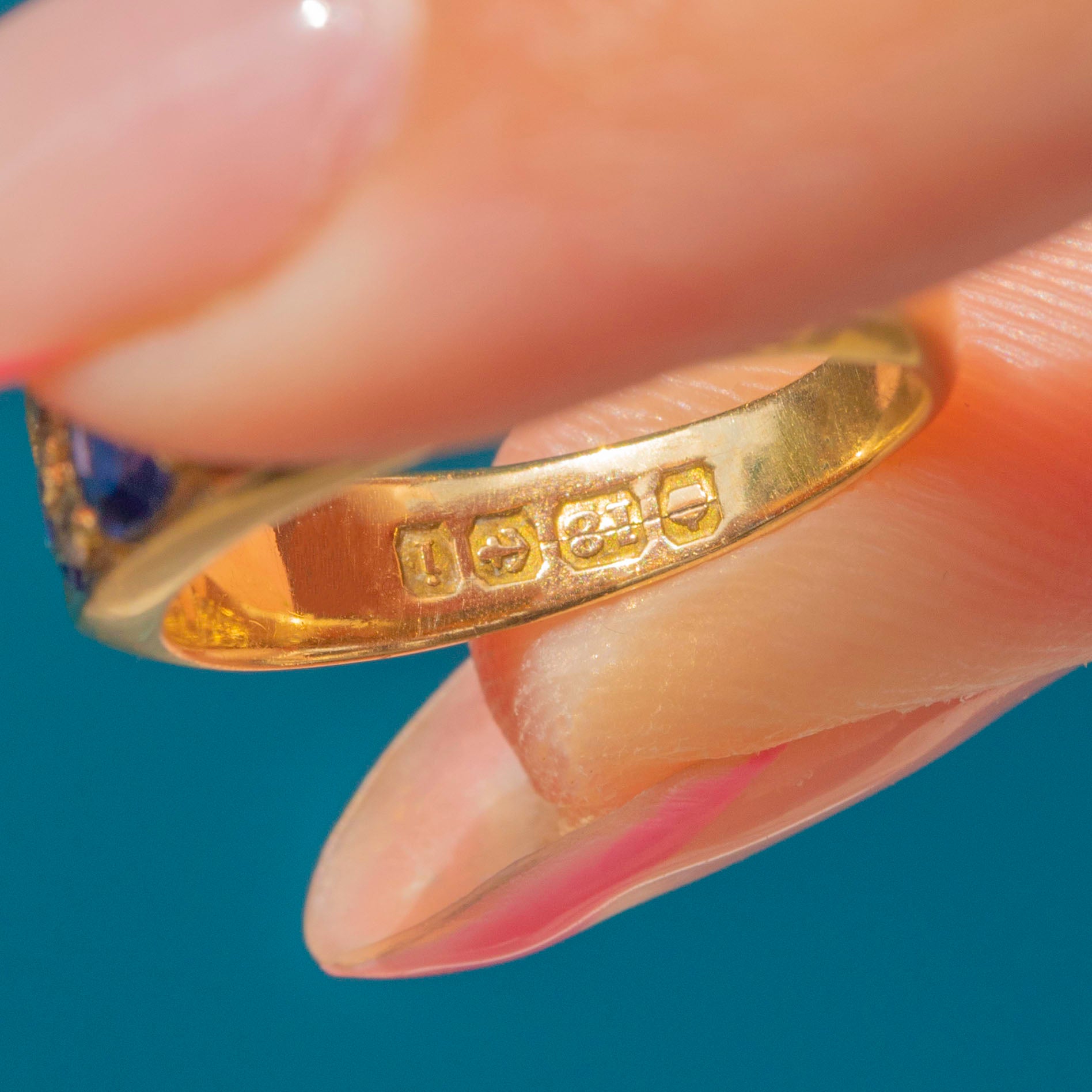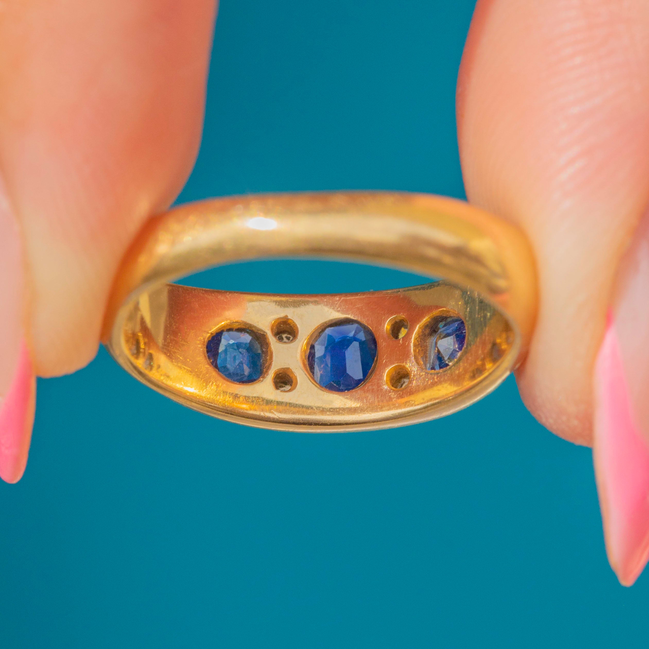 This antique 18ct Gold Natural Sapphire Diamond boat ring is a classy and timeless treasure! The chubby 18ct Gold band feels luxurious and robust, boasting a full set of English hallmarks dating to 1908 inside.