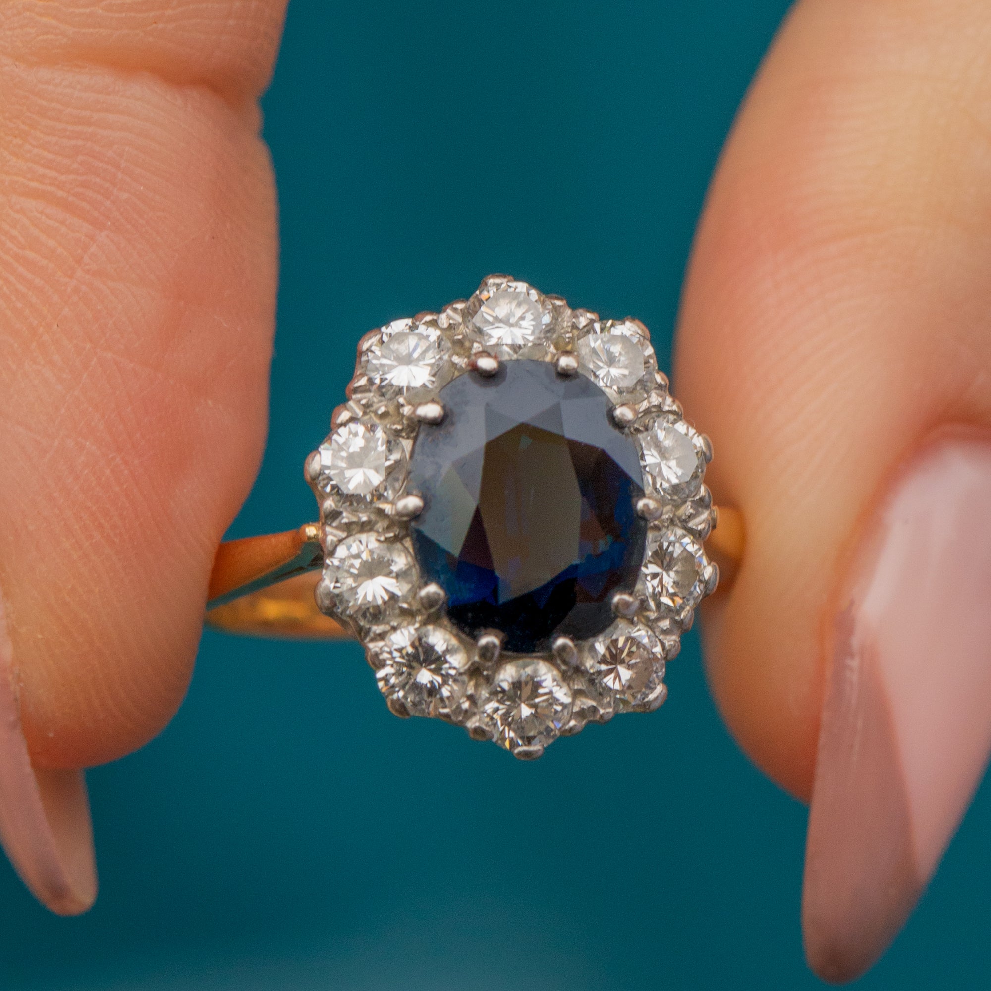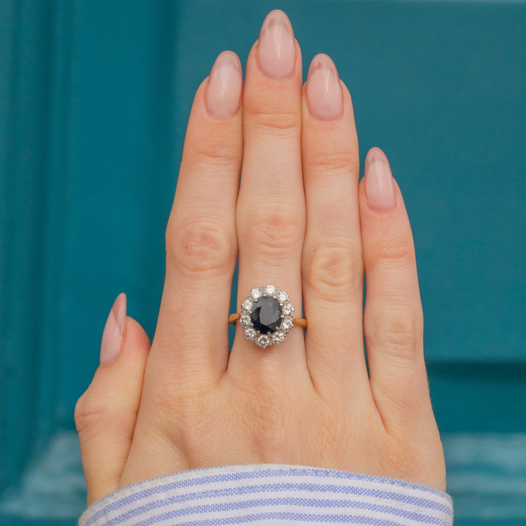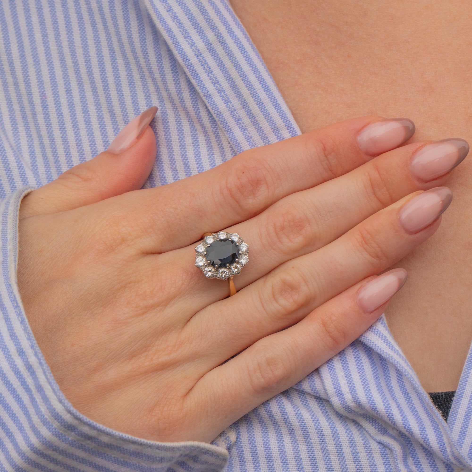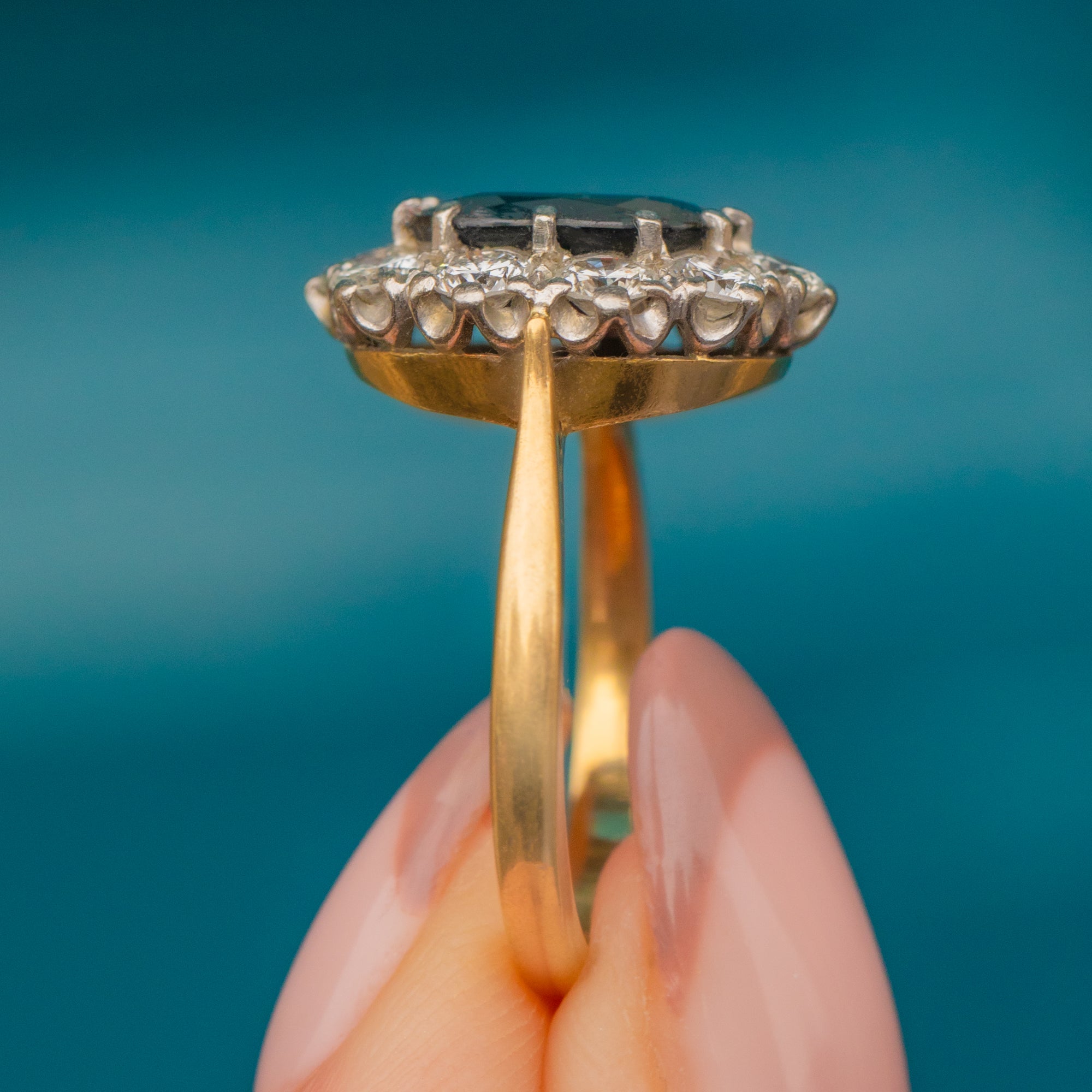 Antique 18ct Gold Natural Sapphire Diamond Cluster Ring, 2.17ct Sapphire