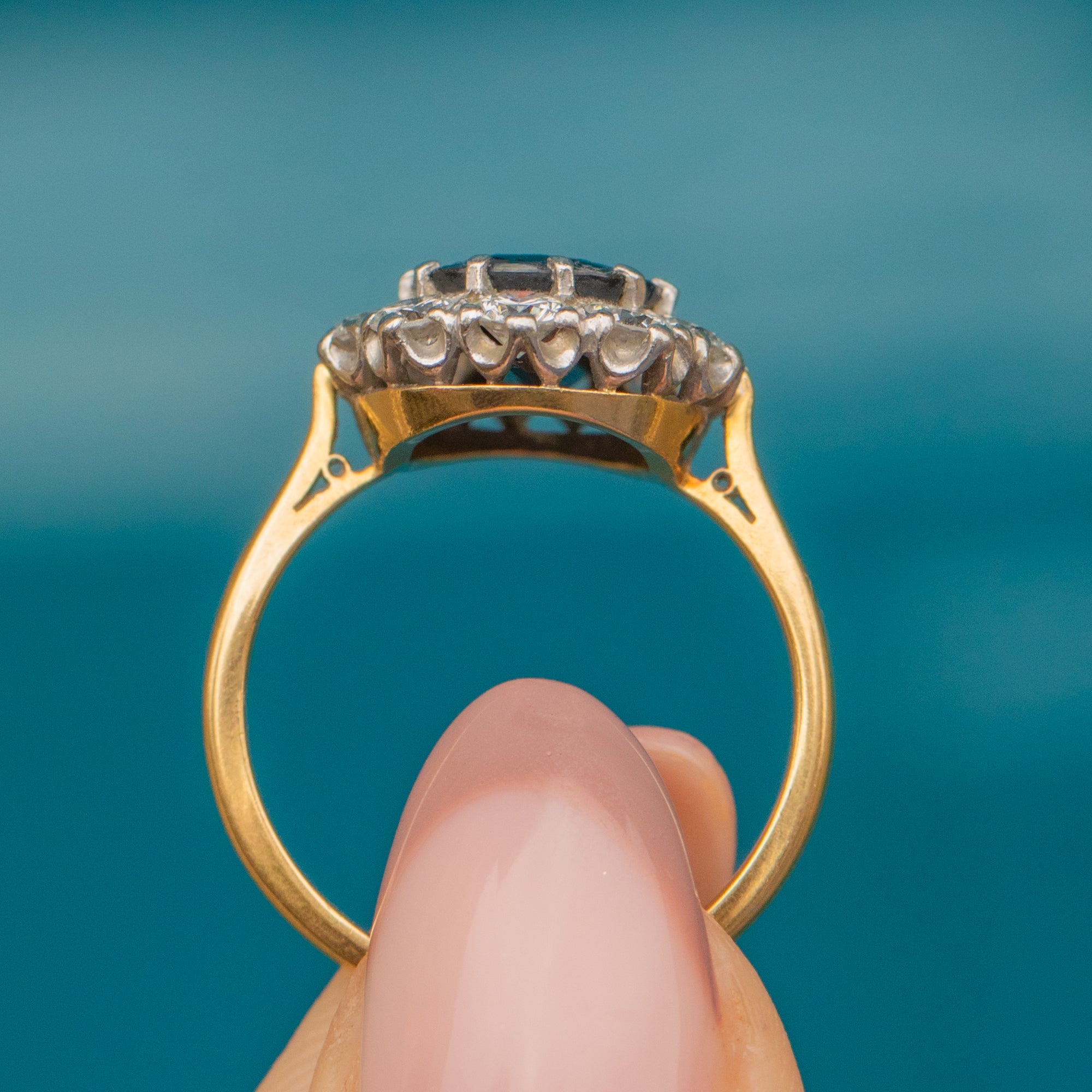 EXCELLENT. This antique 18ct Gold Natural Sapphire Diamond cluster ring is in excellent condition. The natural Sapphire and Diamonds are all original to the piece and are all free from chips or abrasions. The 18ct Gold band is sumptuous and smooth with chunky antique stamps inside. The Platinum is lustrous and holds the gemstone cluster securely. This antique Sapphire Diamond ring is a wonderful investment piece that can be passed down the generations to come!