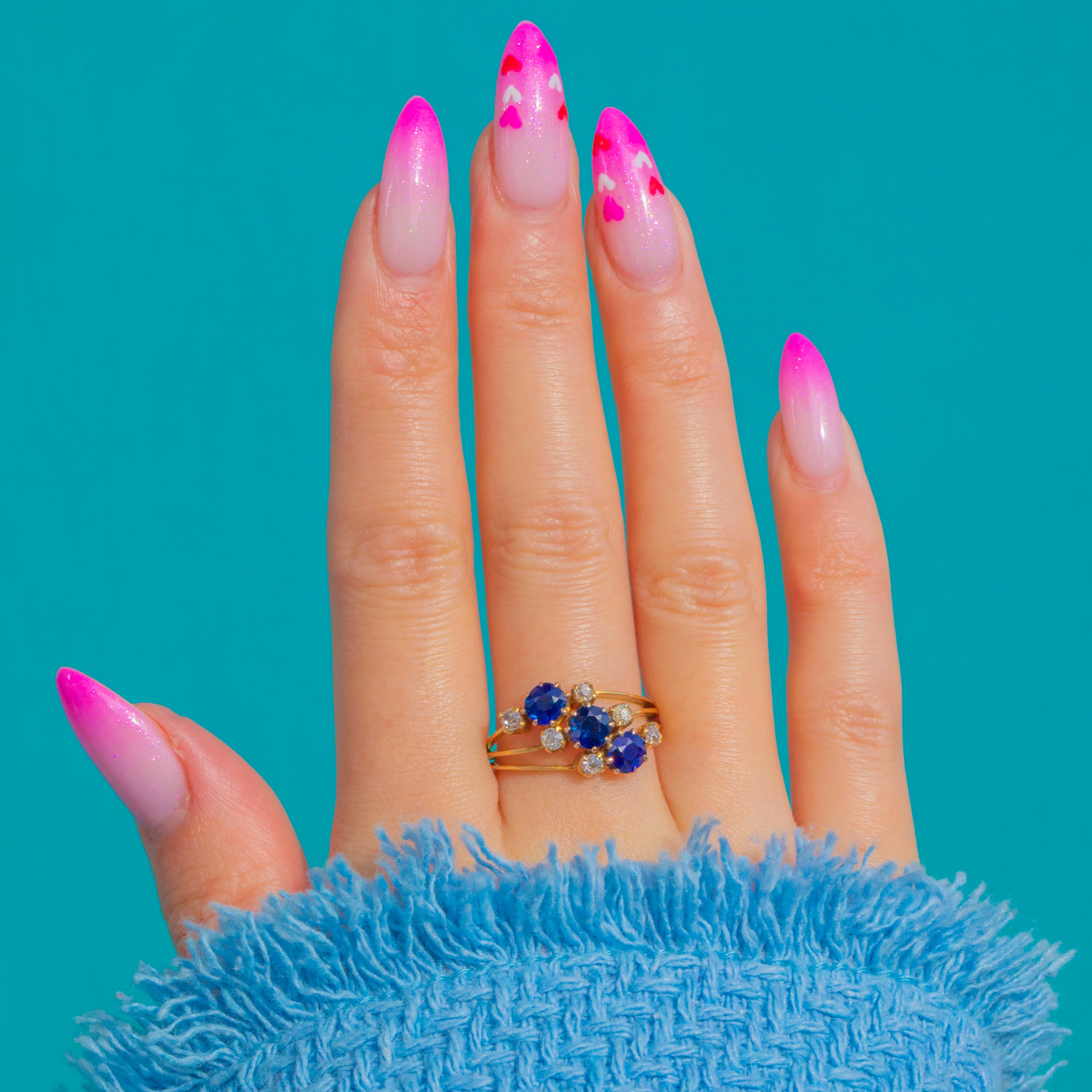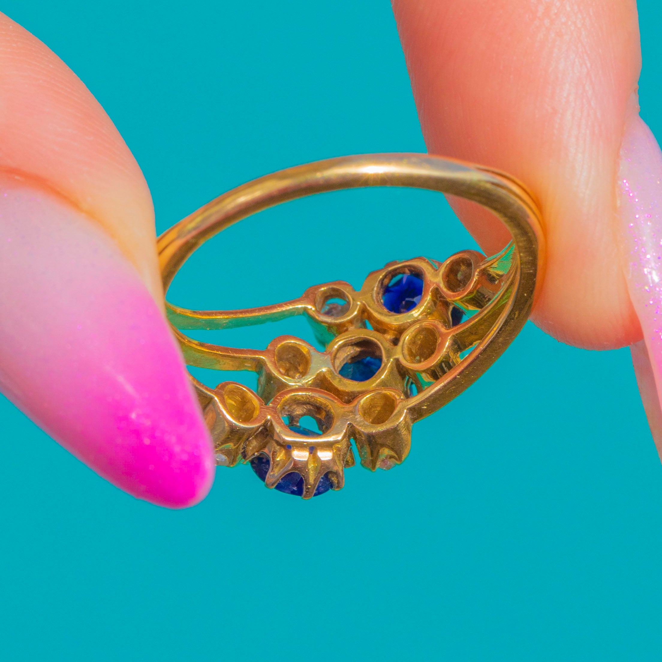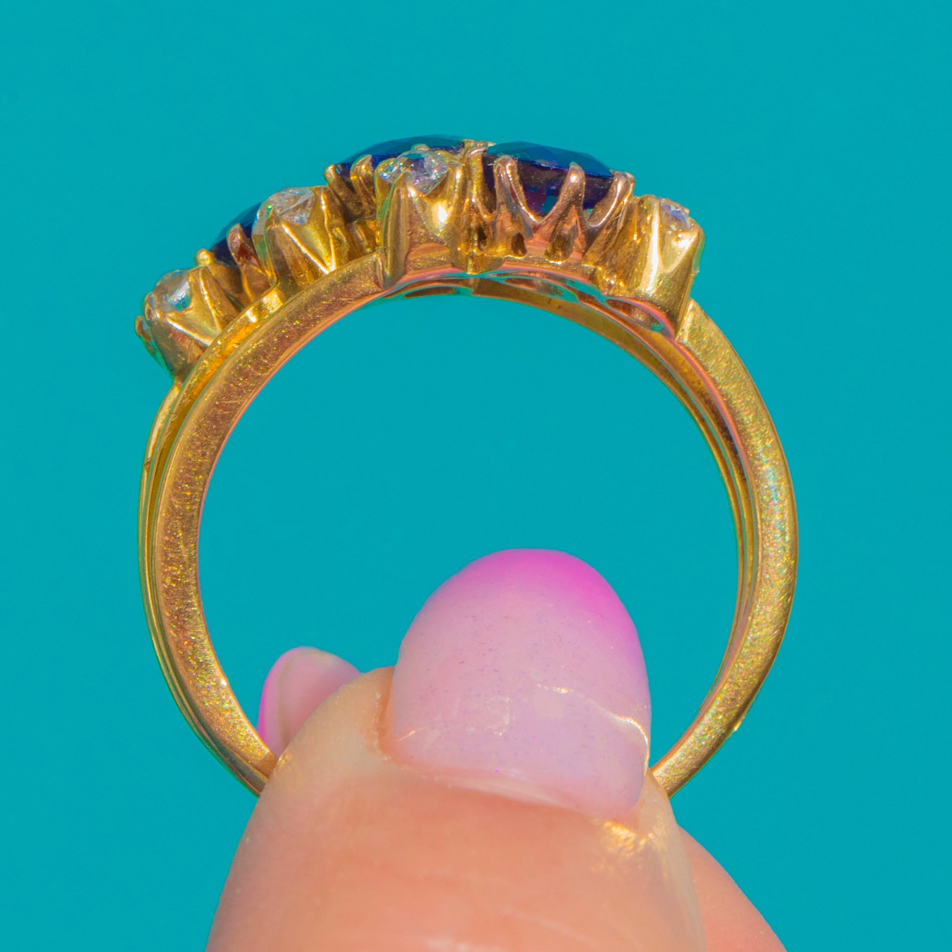 A glowing Victorian “Hareem” ring in rich 18ct Gold, set with a trilogy of deep blue Sapphires framed by six scintillating old mine-cut Diamonds. The 1.50cts natural Sapphires offer a saturated, velvety midnight hue, beautifully lifted by the Diamonds’ antique sparkle for a refined, romantic presence on the hand.