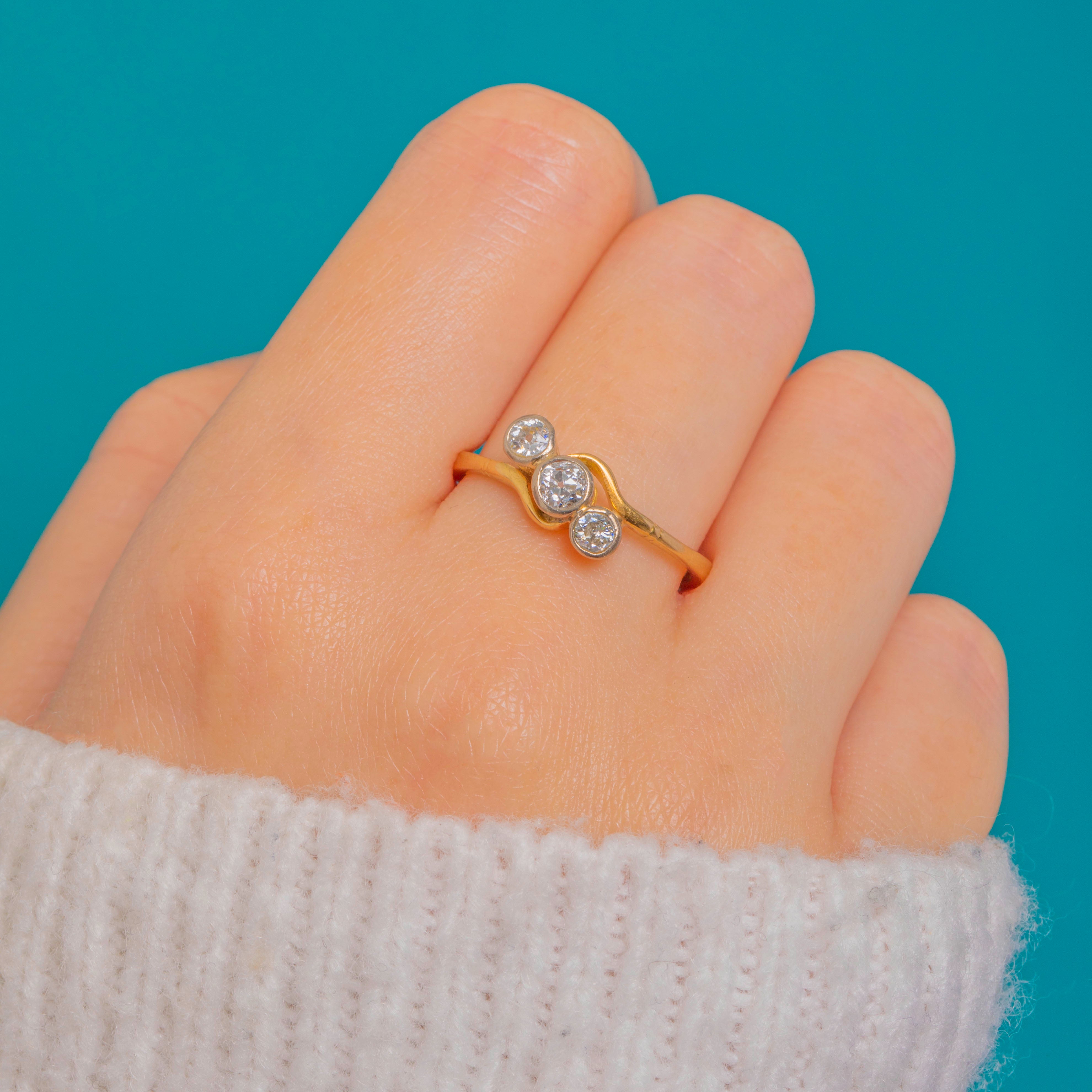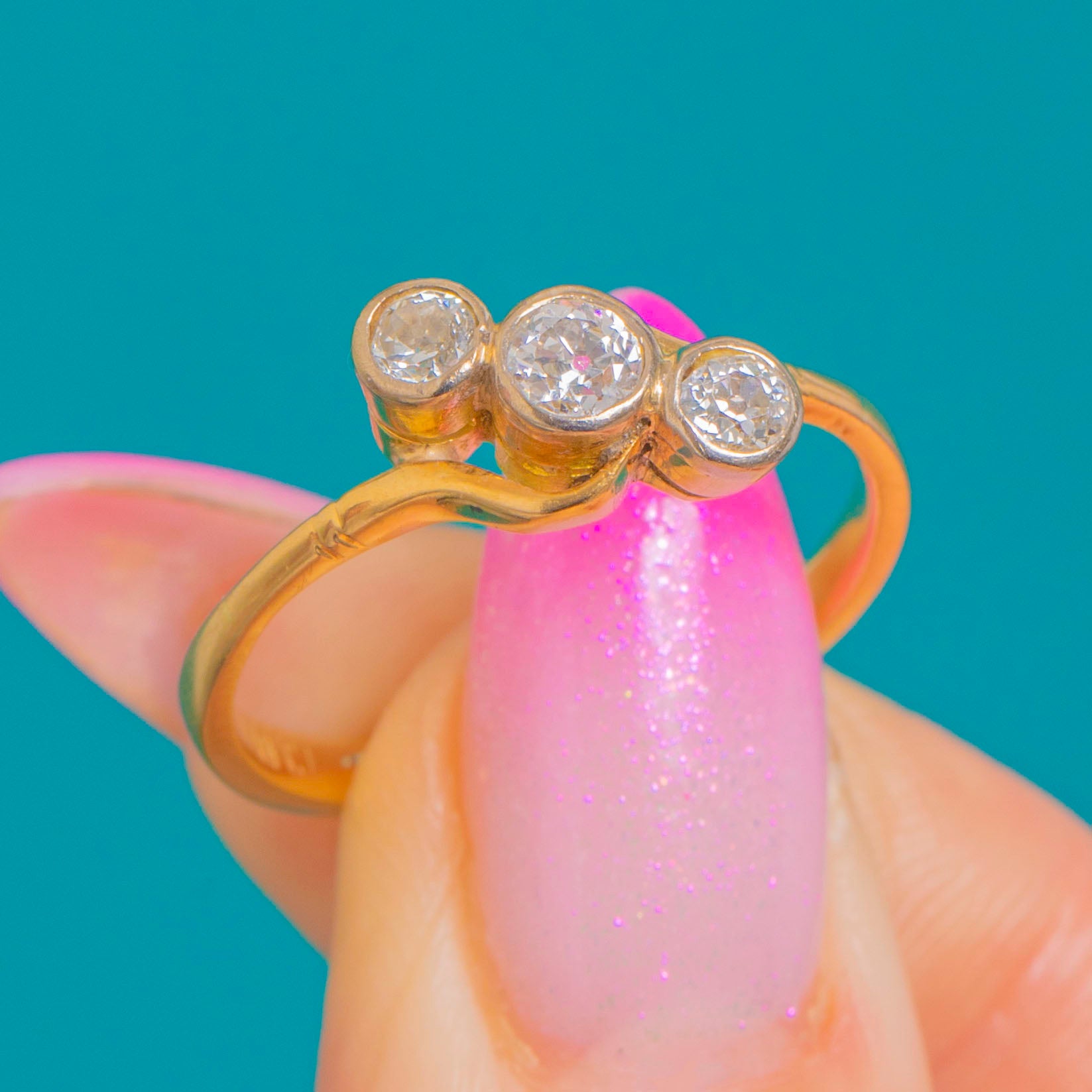 A refined Edwardian three-stone ring set with charming Old Mine Cut Diamonds in smooth rub-over bezel settings. The central Diamond sits slightly prouder between two petite companions, creating a graceful trilogy across a slender 18ct Gold band with subtly undulating shoulders.