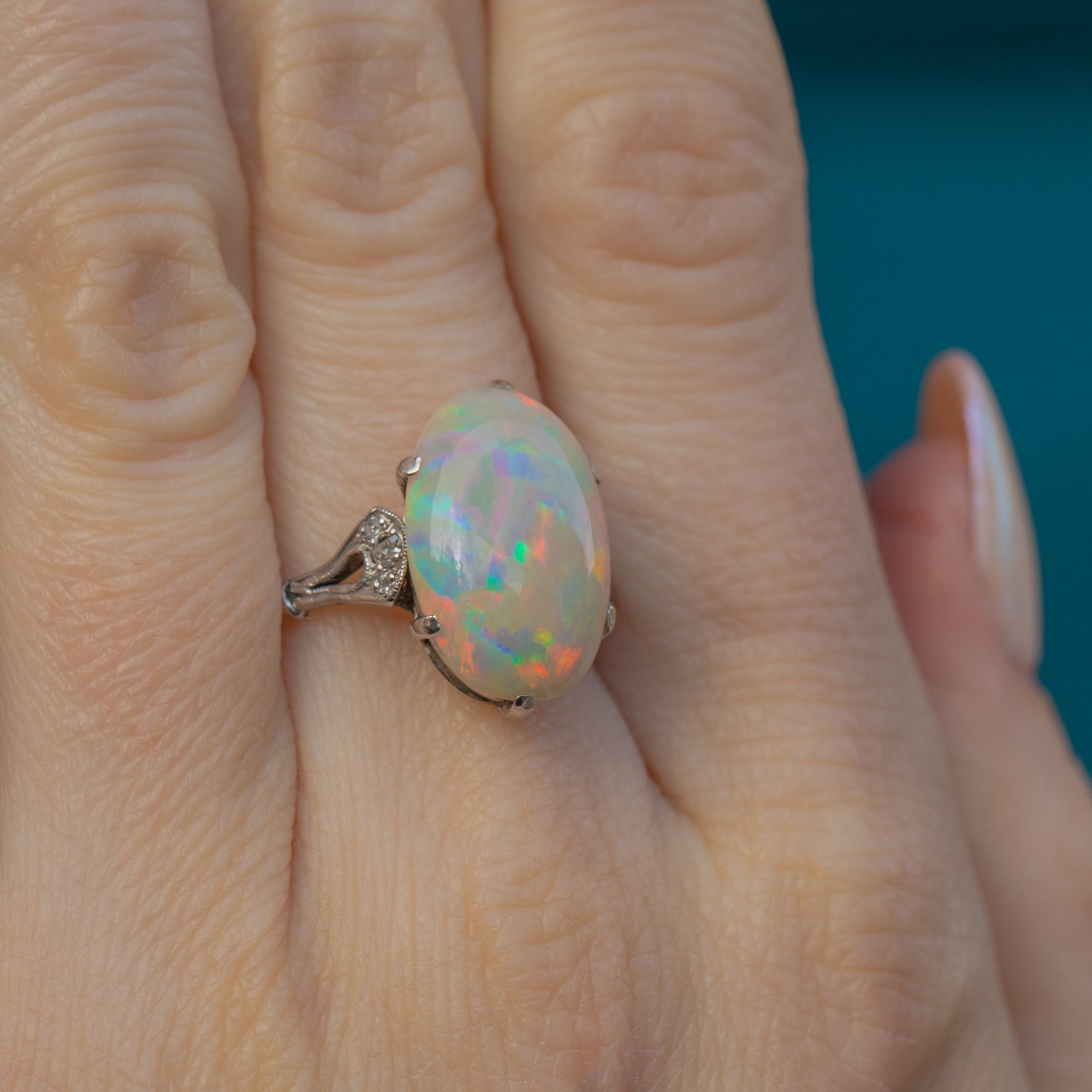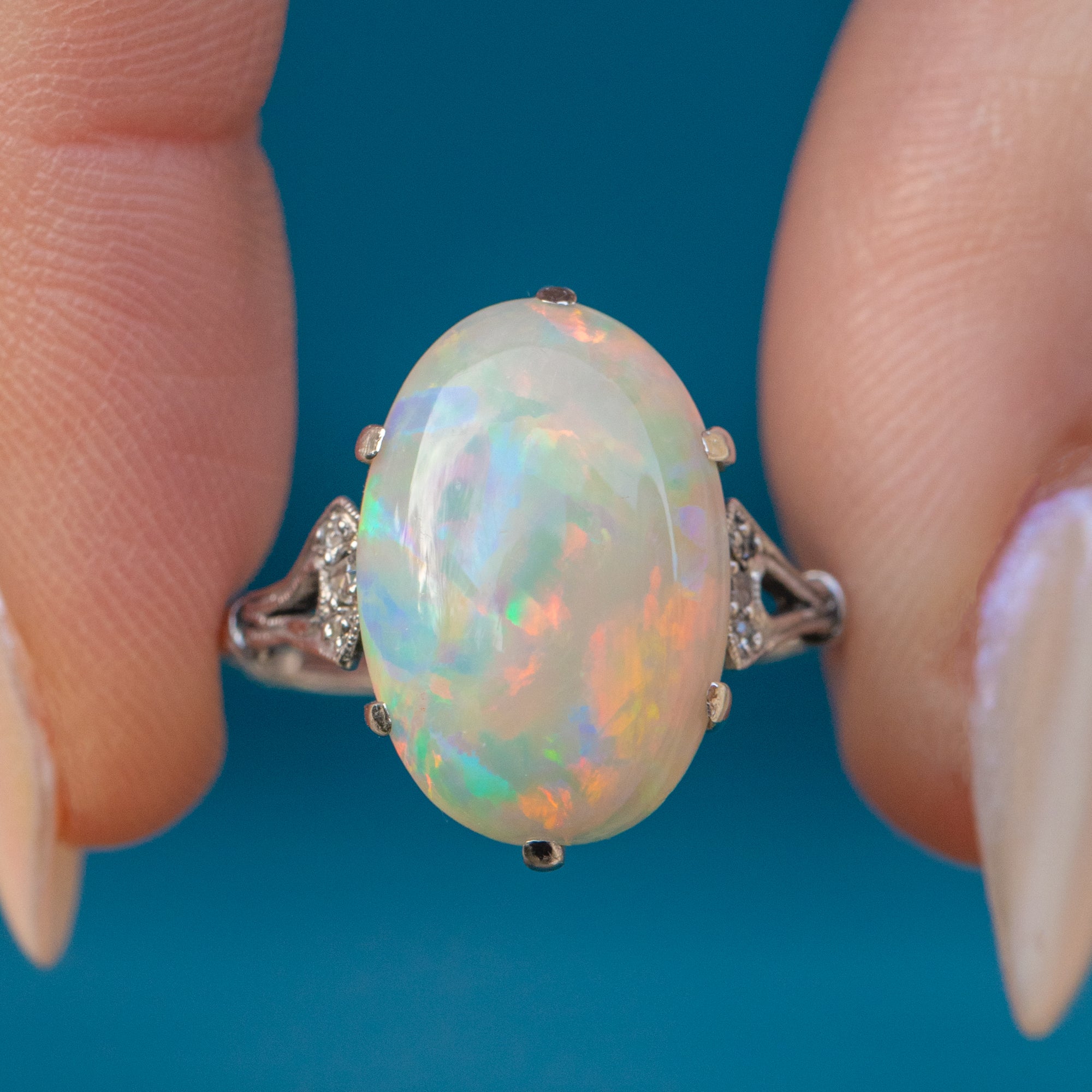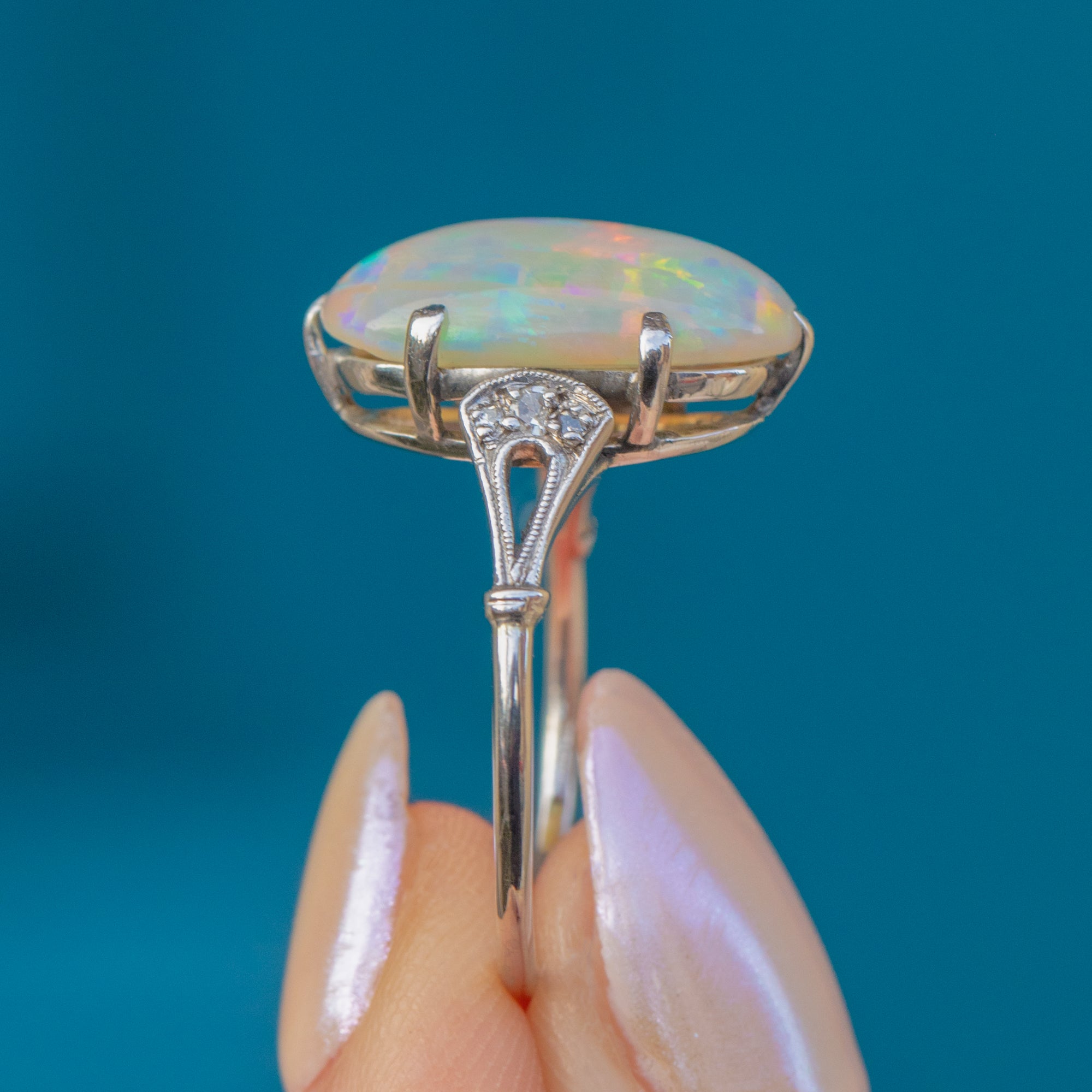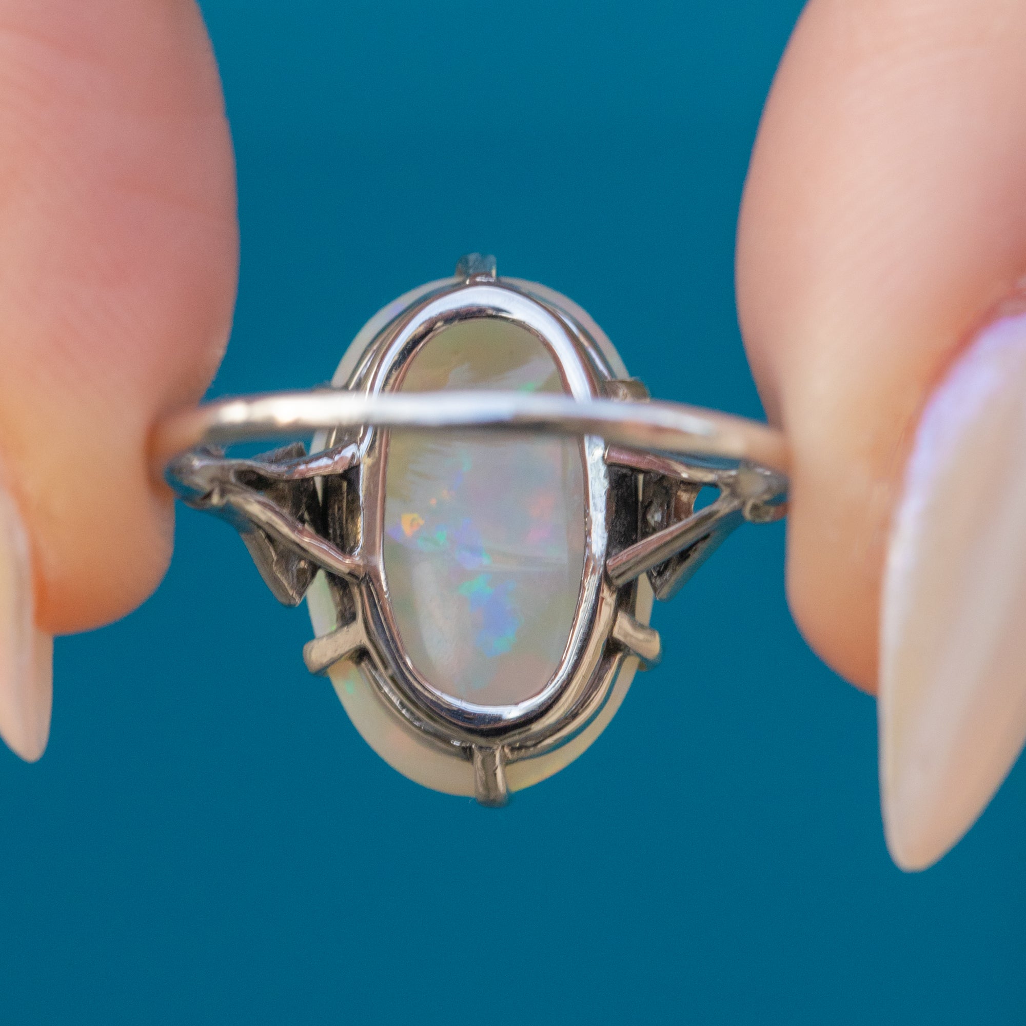MATERIALS: Tests as 18ct White Gold shank, Platinum settings, Natural Solid Opal (4.15ct), Antique Diamonds.