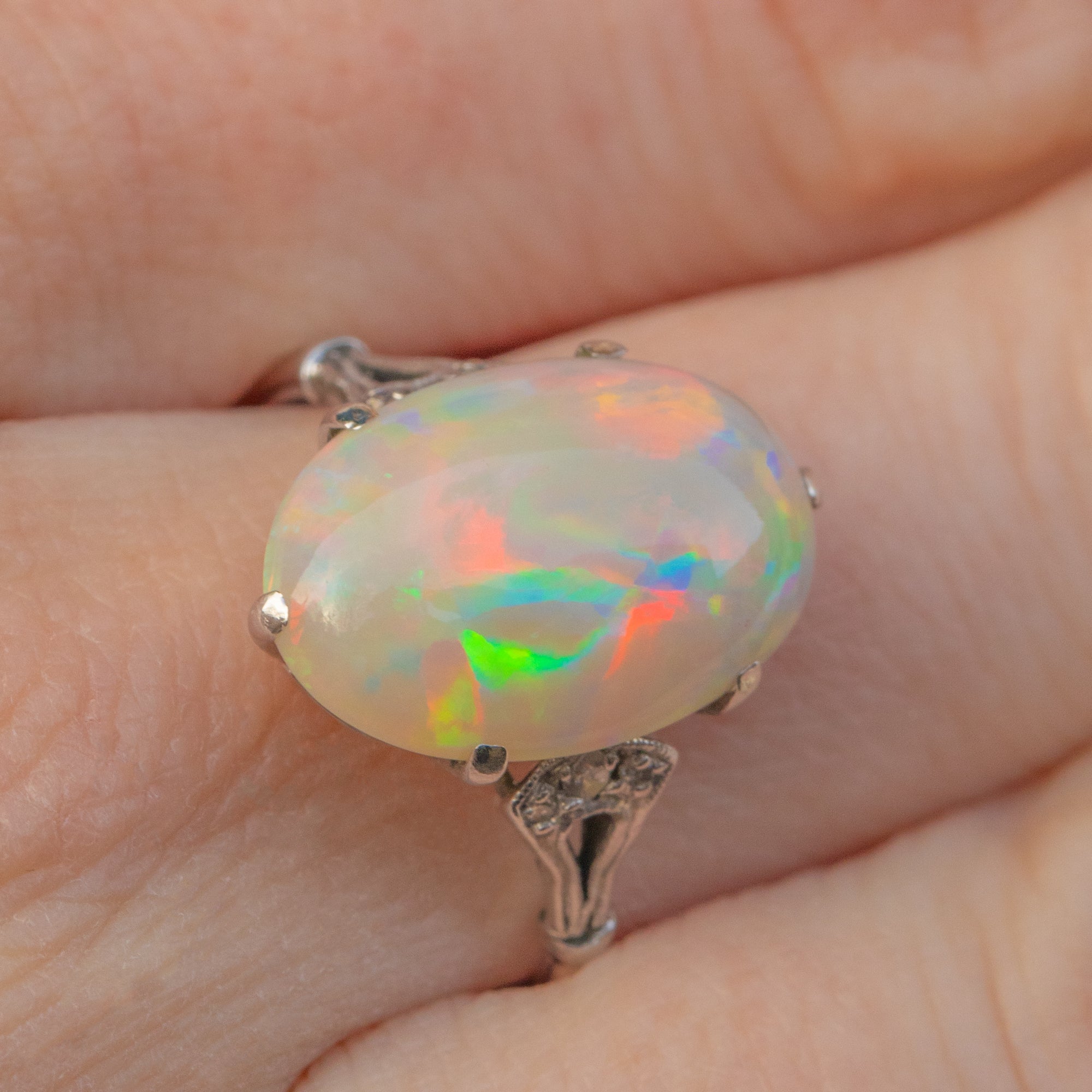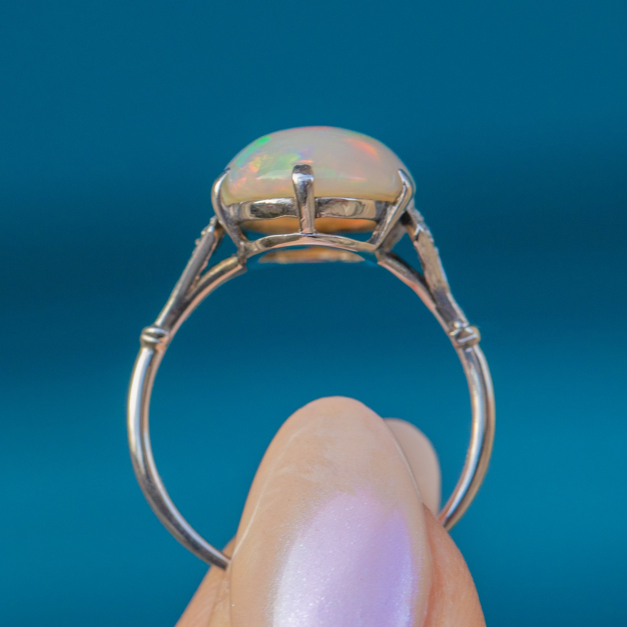This antique 18ct White Gold Opal dress ring is simply superb! As though carved from the aurora borealis, the Opal exhibits an enchanting display of iridescent hues, with flashes of neon green and yellow as she catches the light.