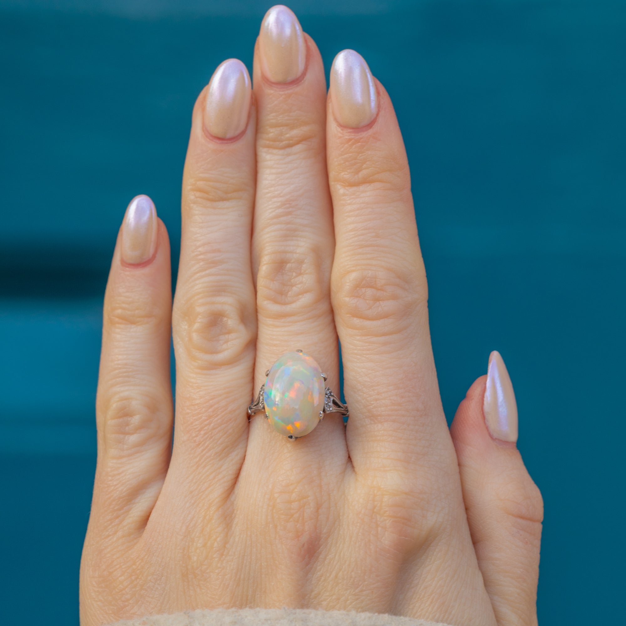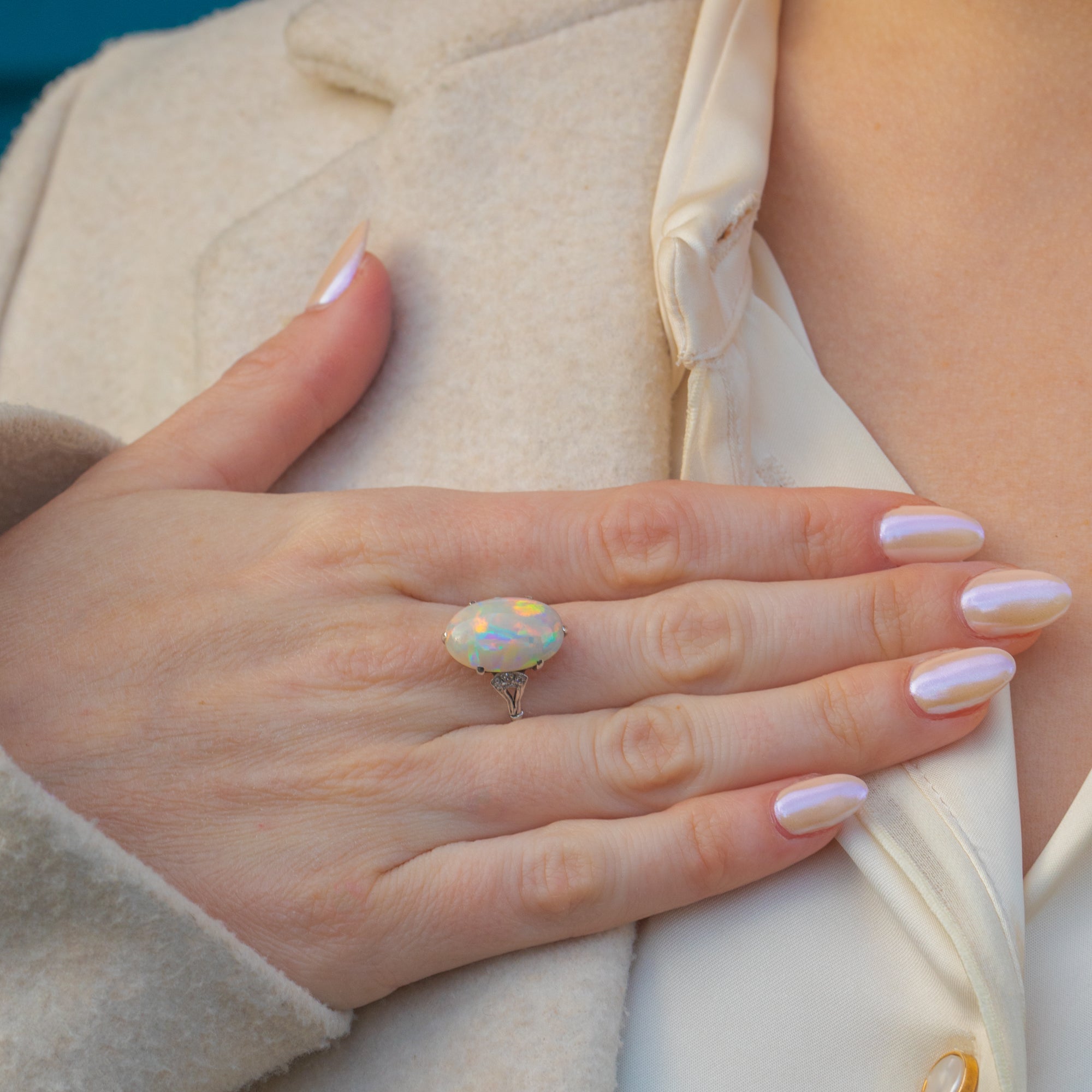 VERY GOOD. This antique 18ct Gold Opal Diamond ring is in very good condition throughout. The surface of the Opal is smooth to the touch and free from any chips or nibbles. There is a small chip on the back of the Opal, but this isn't visible from the front and does not affect the integrity of the piece. The Diamonds are all present and securely set and the 18ct White Gold band has retained its form impeccably over the years. This spectacular Edwardian Opal ring will take pride of place in your jewellery collection!