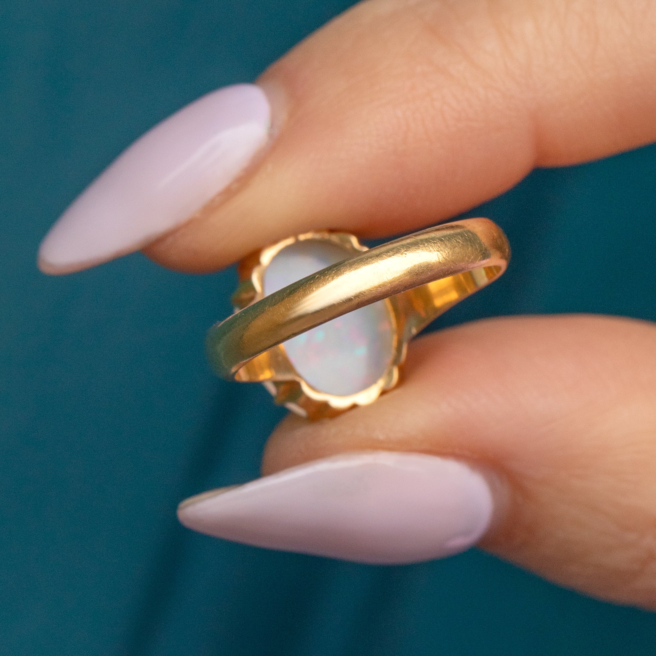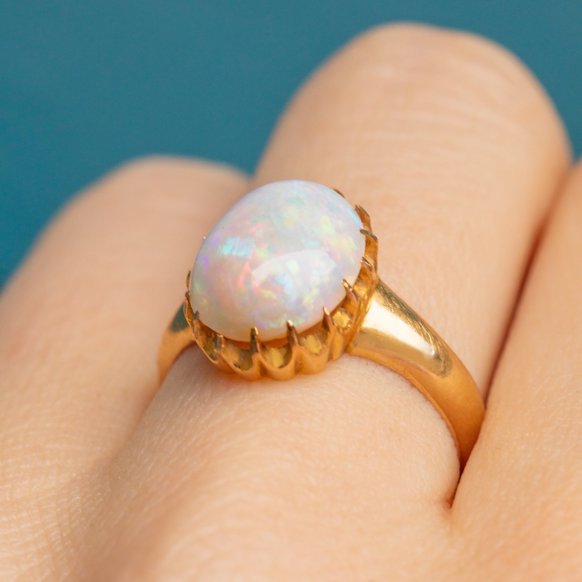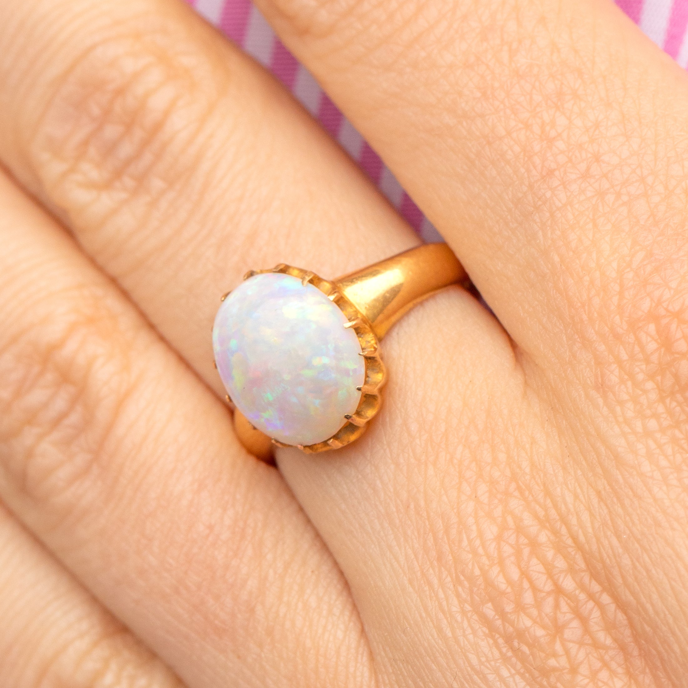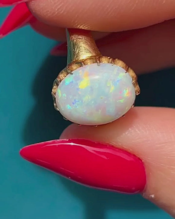 This mesmerising antique 18ct Gold Opal cabochon ring will instantly grab your attention! The 1.78ct Opal reveals a confetti display of rainbow hues that come to life under the light, displayed within pretty scalloped claw settings for a refined finish.