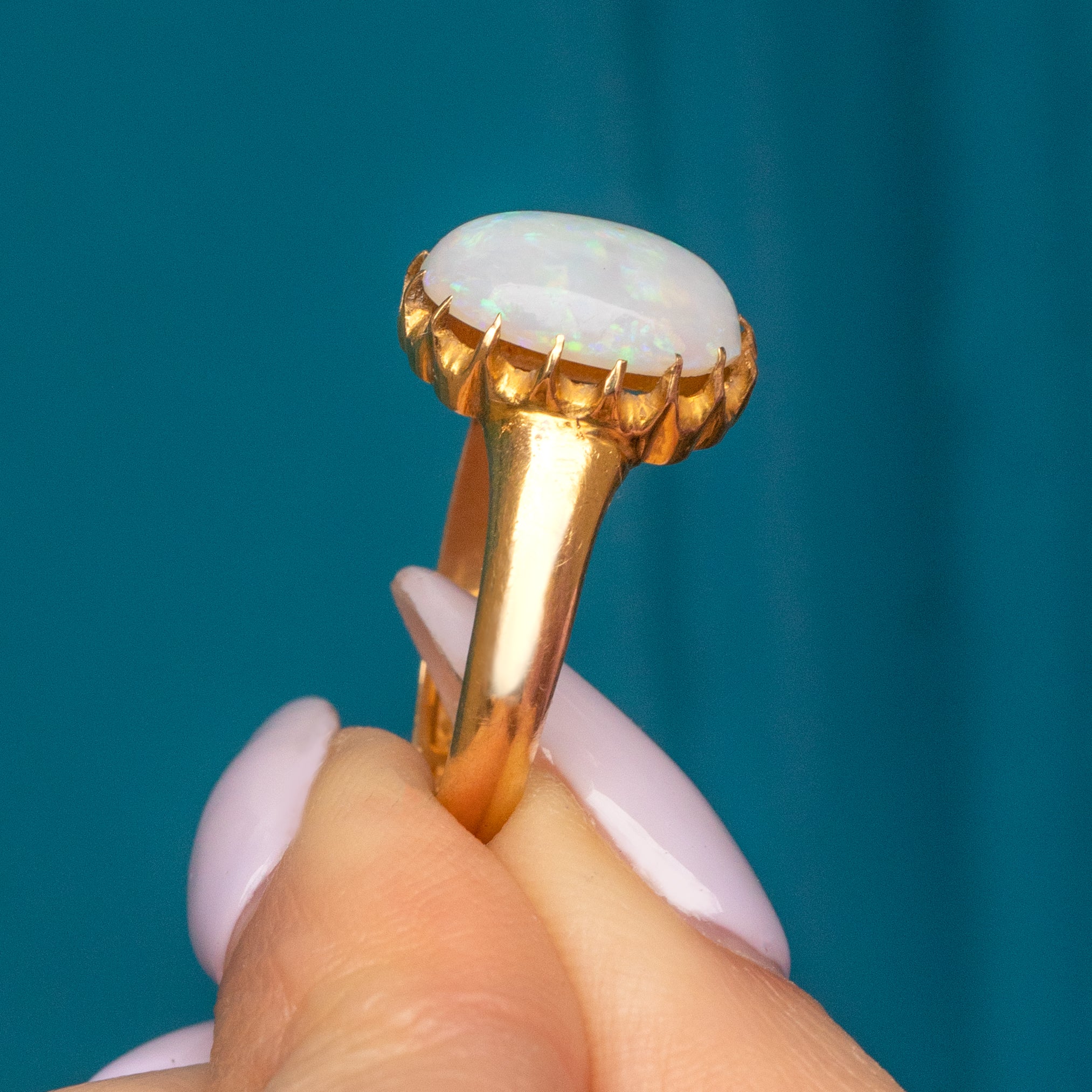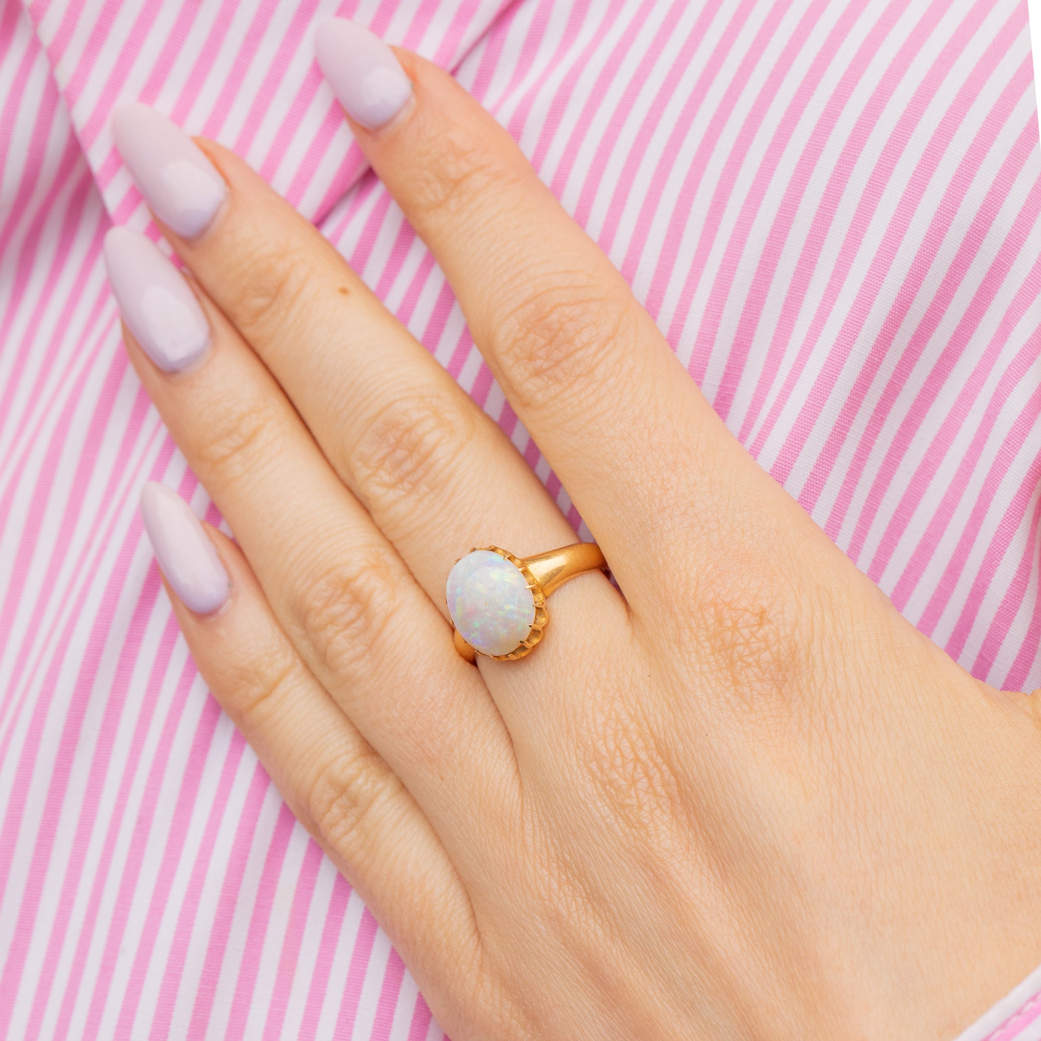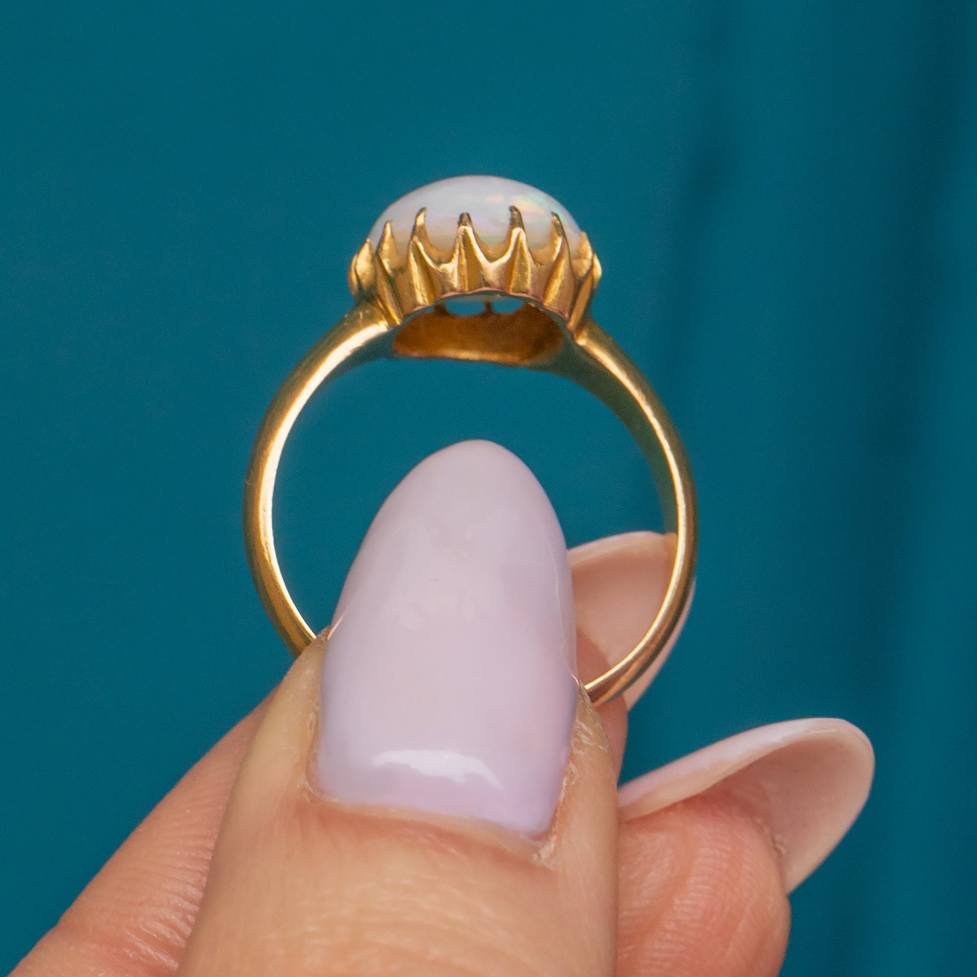 This mesmerising antique 18ct Gold Opal cabochon ring will instantly grab your attention! The 1.78ct Opal reveals a confetti display of rainbow hues that come to life under the light, displayed within pretty scalloped claw settings for a refined finish.