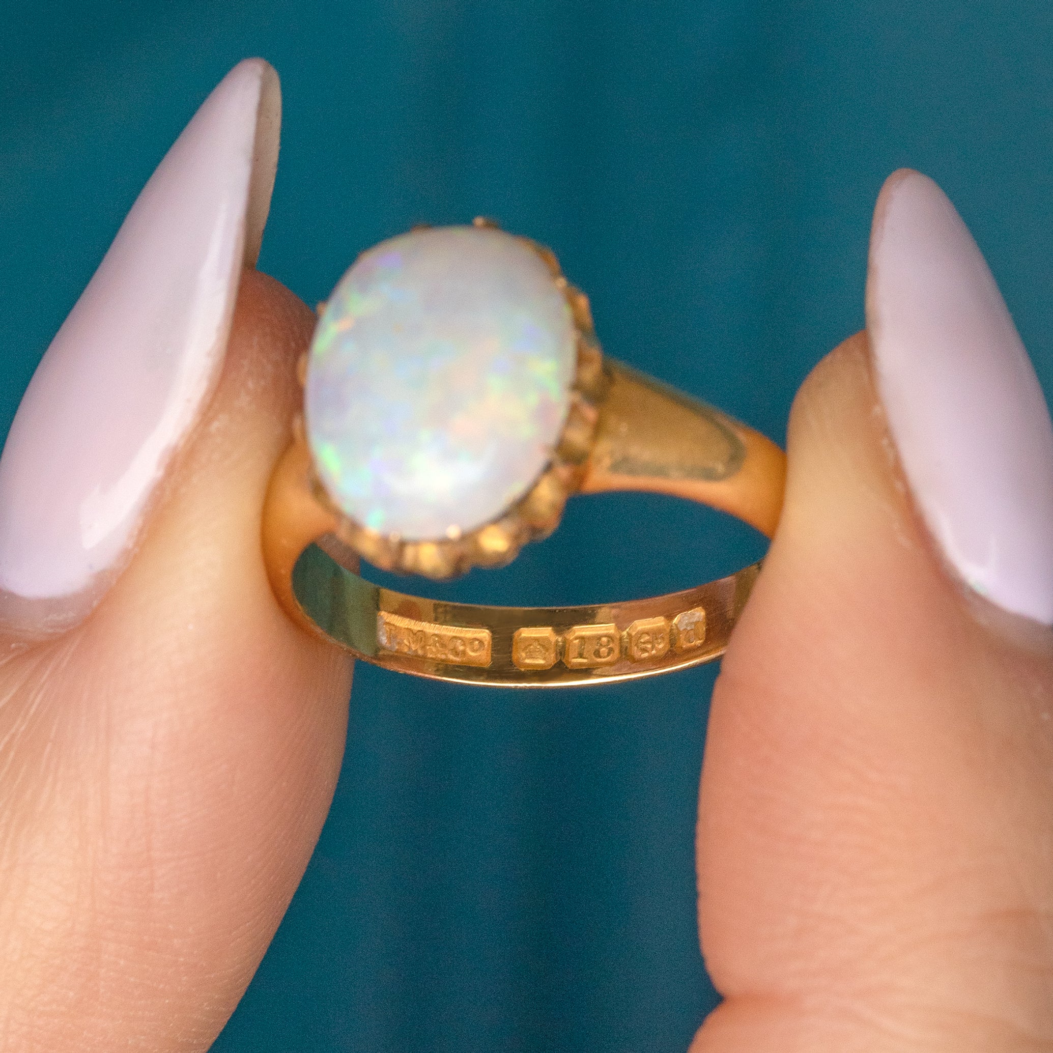 VERY GOOD. This antique 18ct Gold Opal cabochon ring is in wonderful condition! The Opal is smoothly domed and completely free from chips or abrasions, some of the claws have worn down slightly but the Opal has remained securely set. The Gold is brightly saturated with wonderful reflective qualities and boasts a full set of hallmarks on the inside!