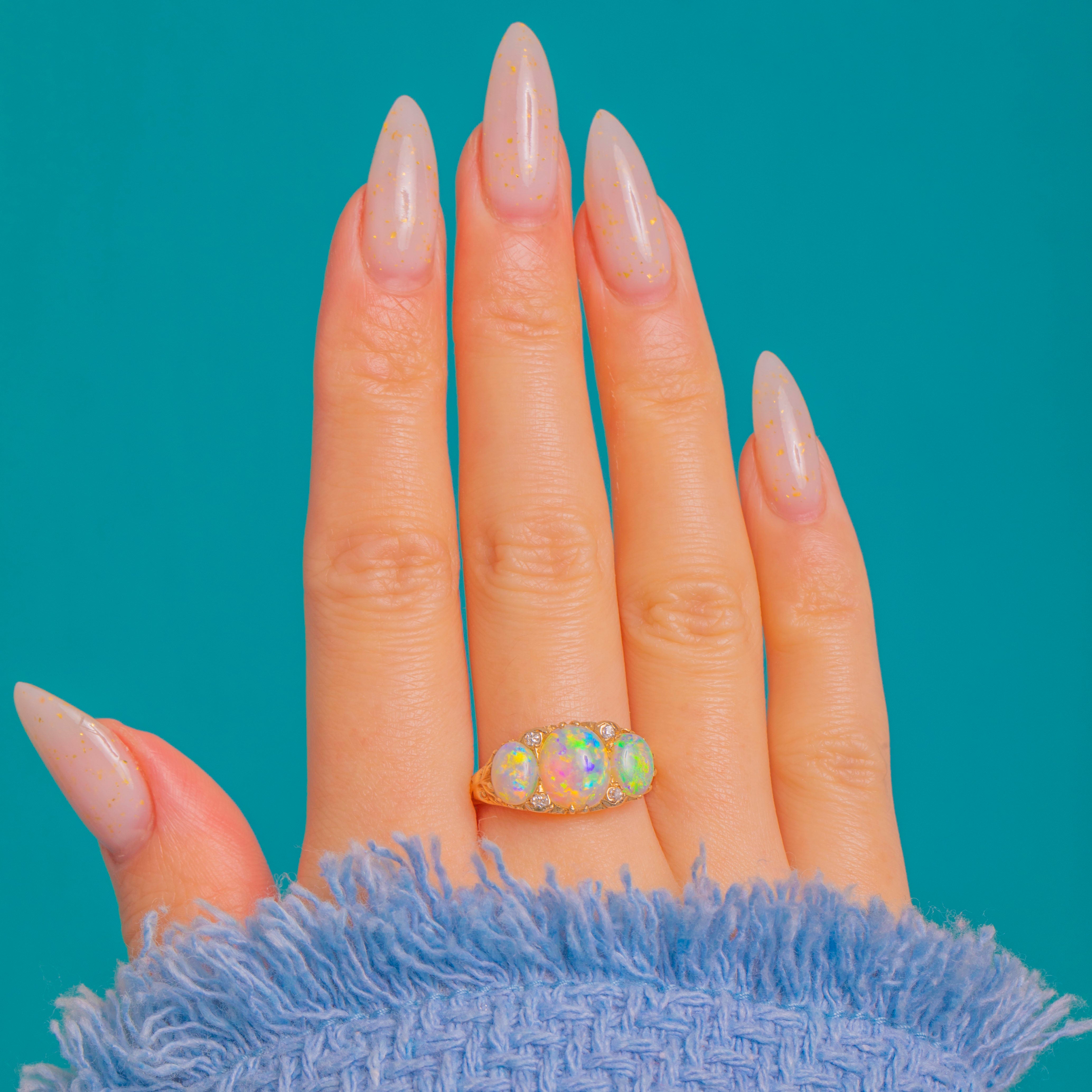 Expertly crafted with open backs and neat claws, the ring tapers to a comfortable shank while keeping all eyes on those vivid Opals. A timeless Victorian treasure with elegant proportions and ornate detailing, perfect for lovers of classic antique glamour.