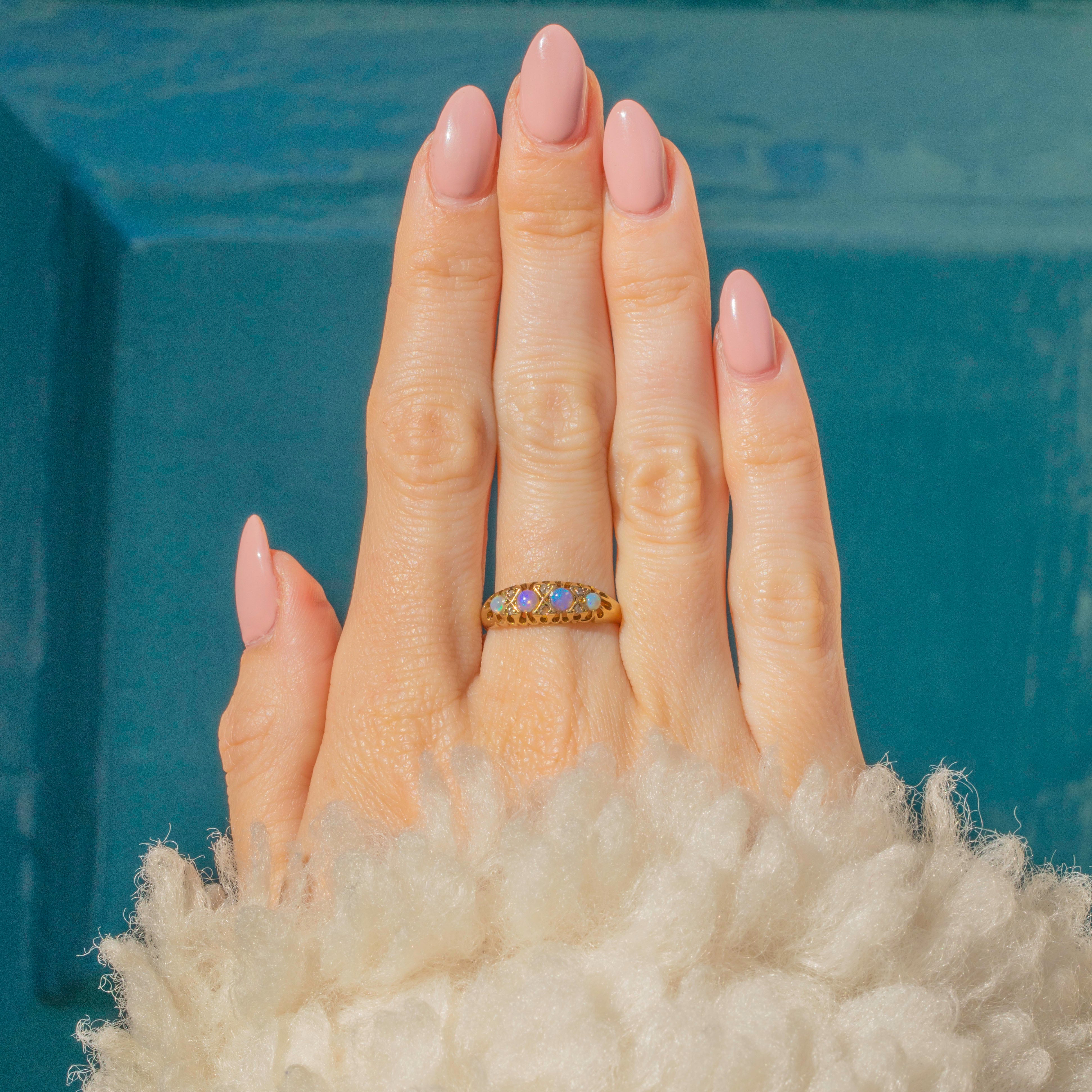 Her iridescent Opals catch the light beautifully, radiating soft hues of greens and blue, through to deep lavender with the occasional flash of orange! These are effortlessly complimented by her surrounding rose-cut Diamonds and supple warm yellow Gold setting.