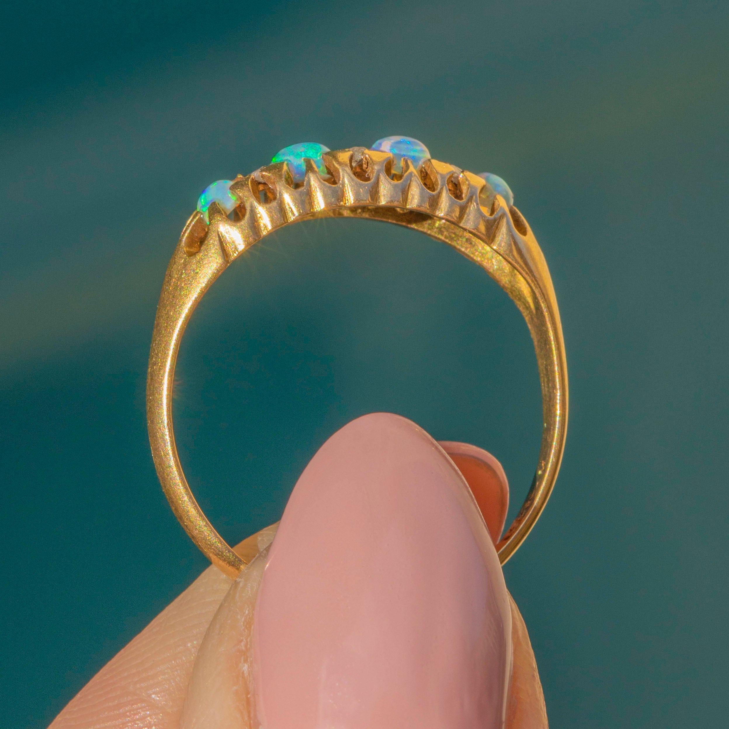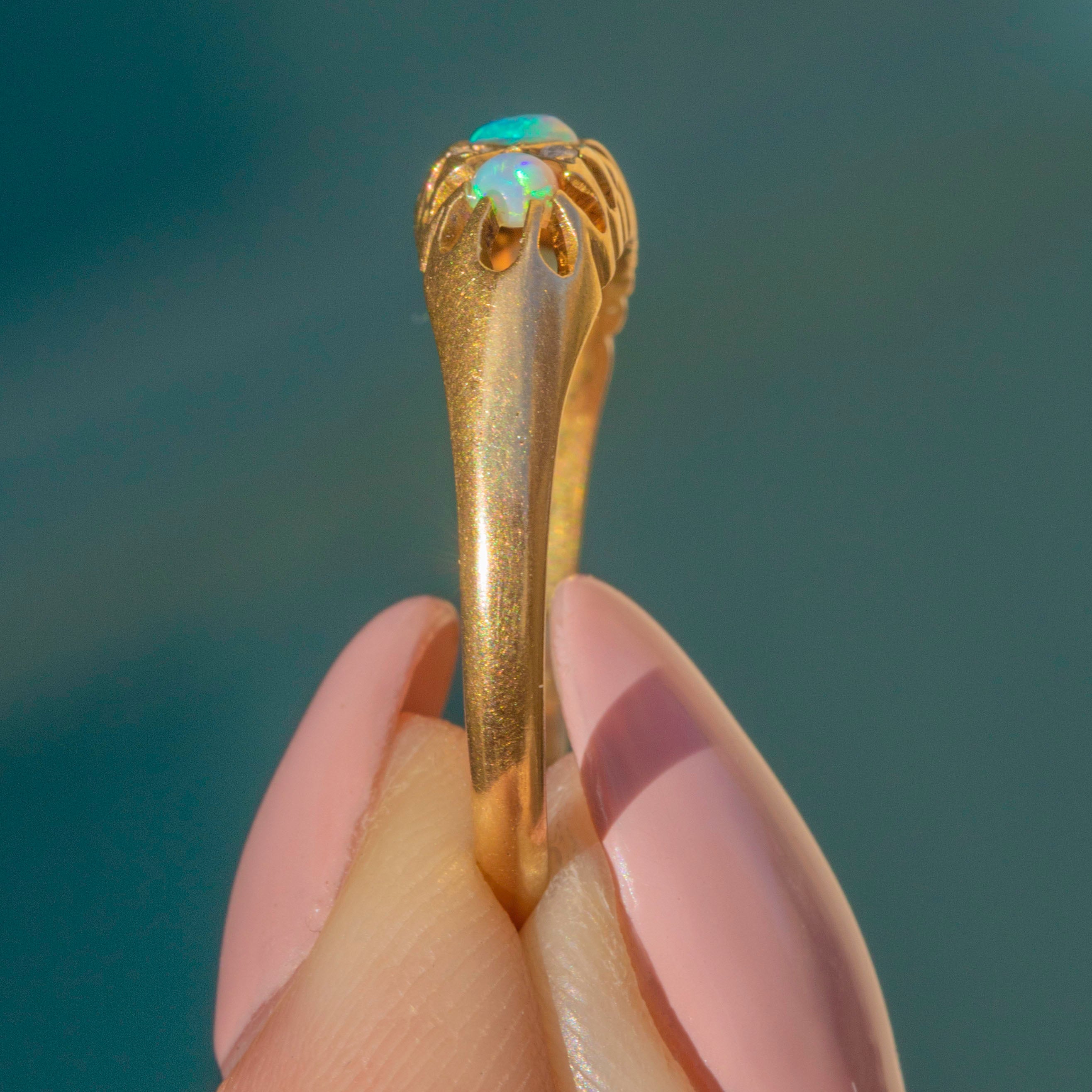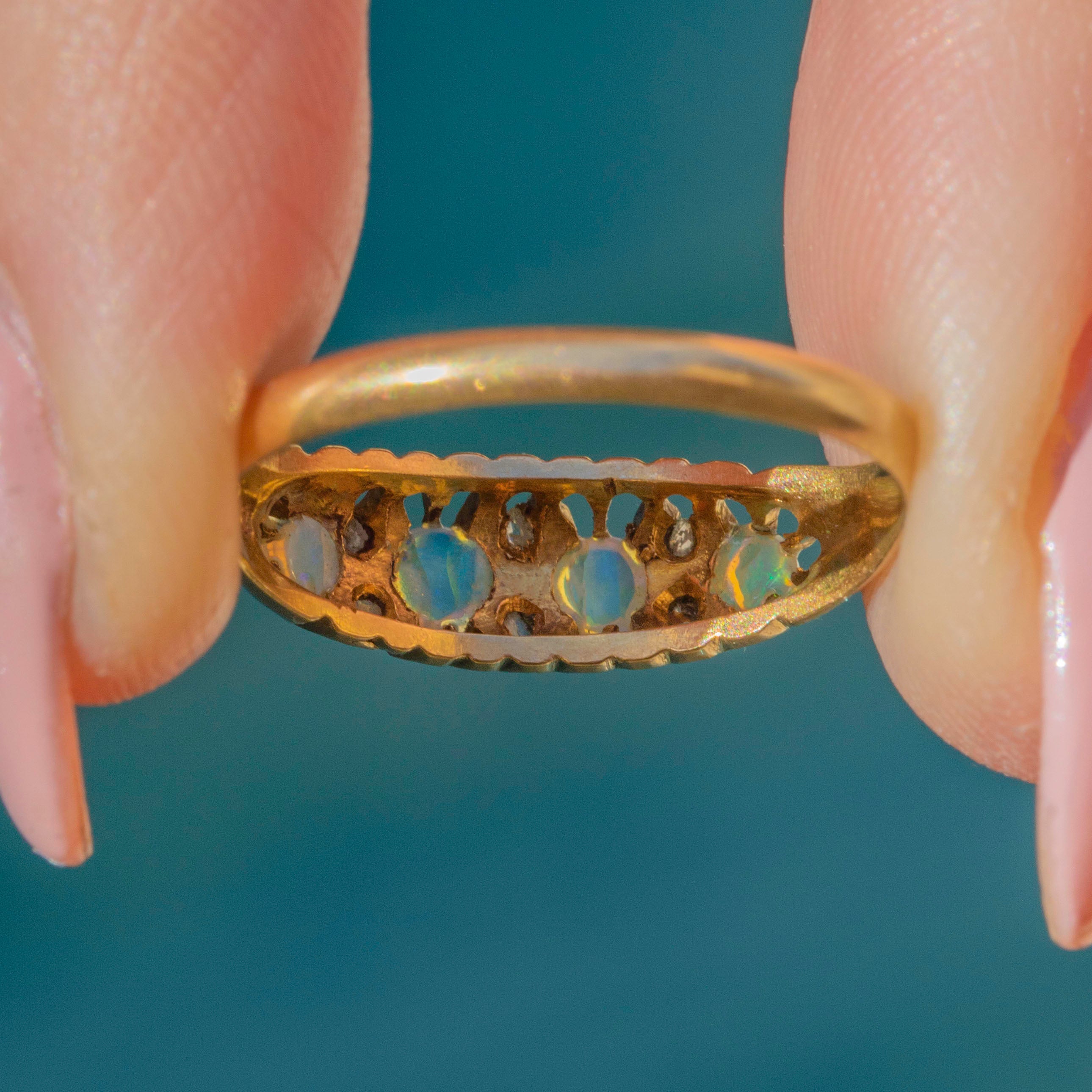 EXCELLENT. This antique 18ct Gold Opal Diamond boat ring is in wonderful condition. Her iridescent Opals look magical in the light, and are free from chips or scuffs, and her surrounding Diamonds are all present. The stones sit securely within a warm 18ct Gold setting and band, free from any visible signs of wear. In such superb condition, this Victorian ring is a must-have!