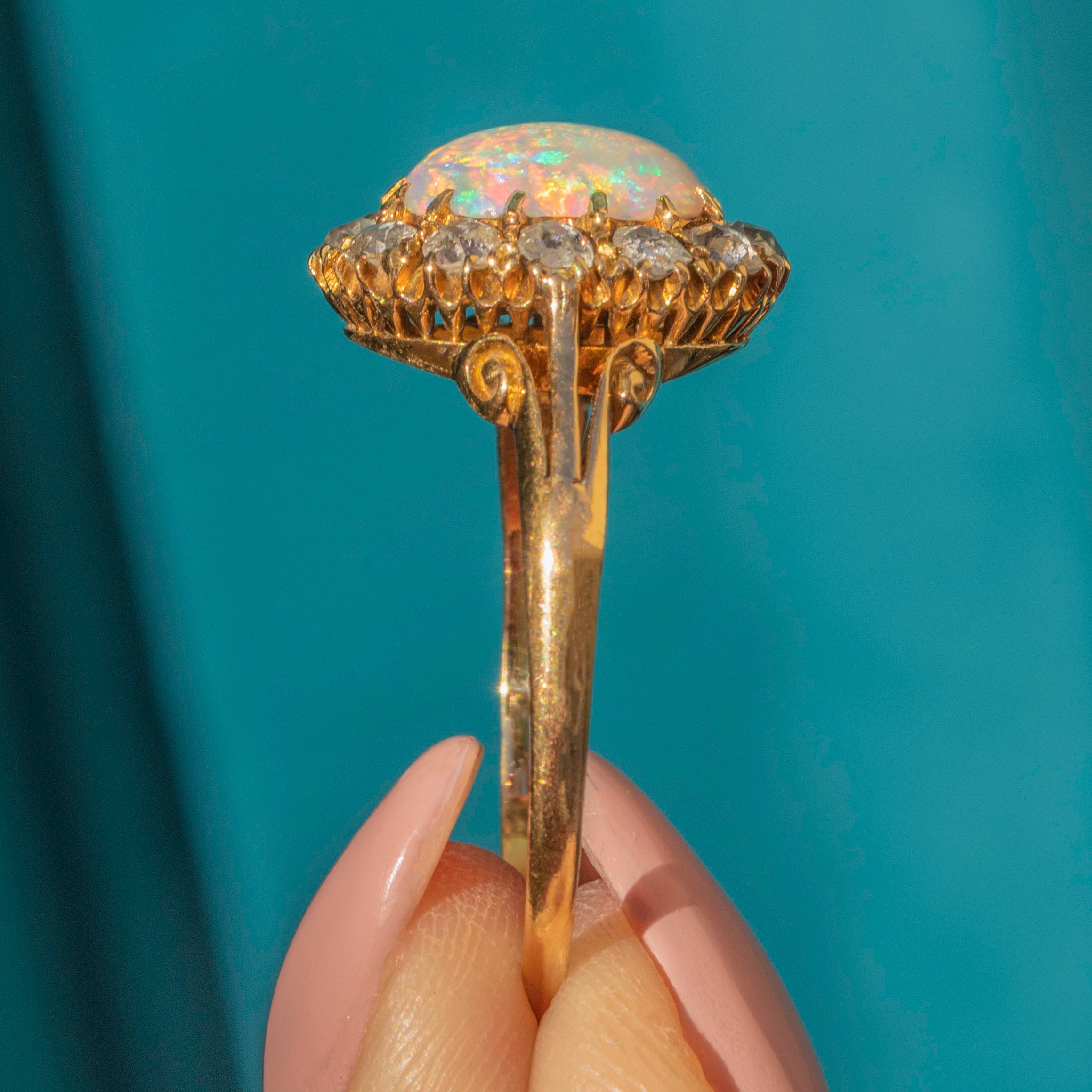 This phenomenal antique 18ct Gold Opal Diamond cluster ring will bring the wow factor to any ensemble! The vivid 1.21ct Opal cabochon takes centrestage, boasting an eye-catching sky blue core with flashes of neon green and a peachy undertone that come to life in the light.