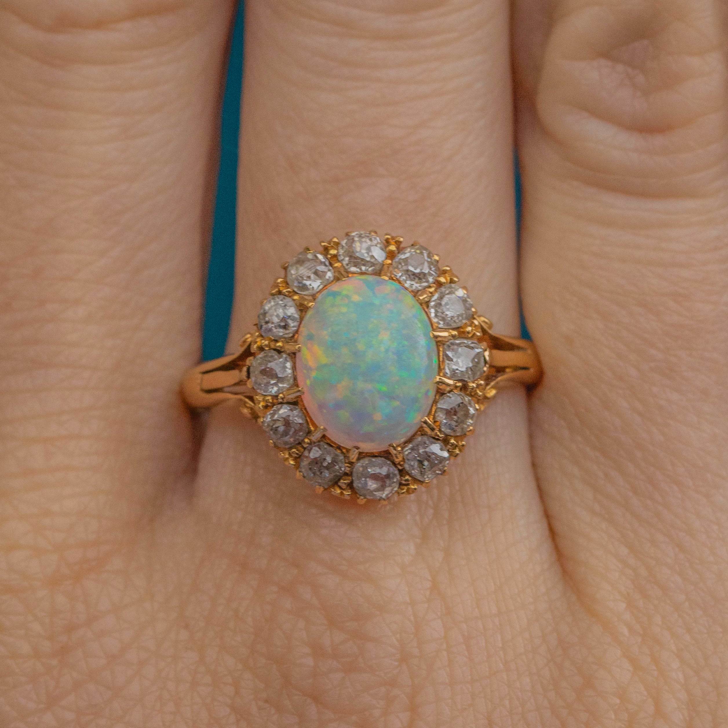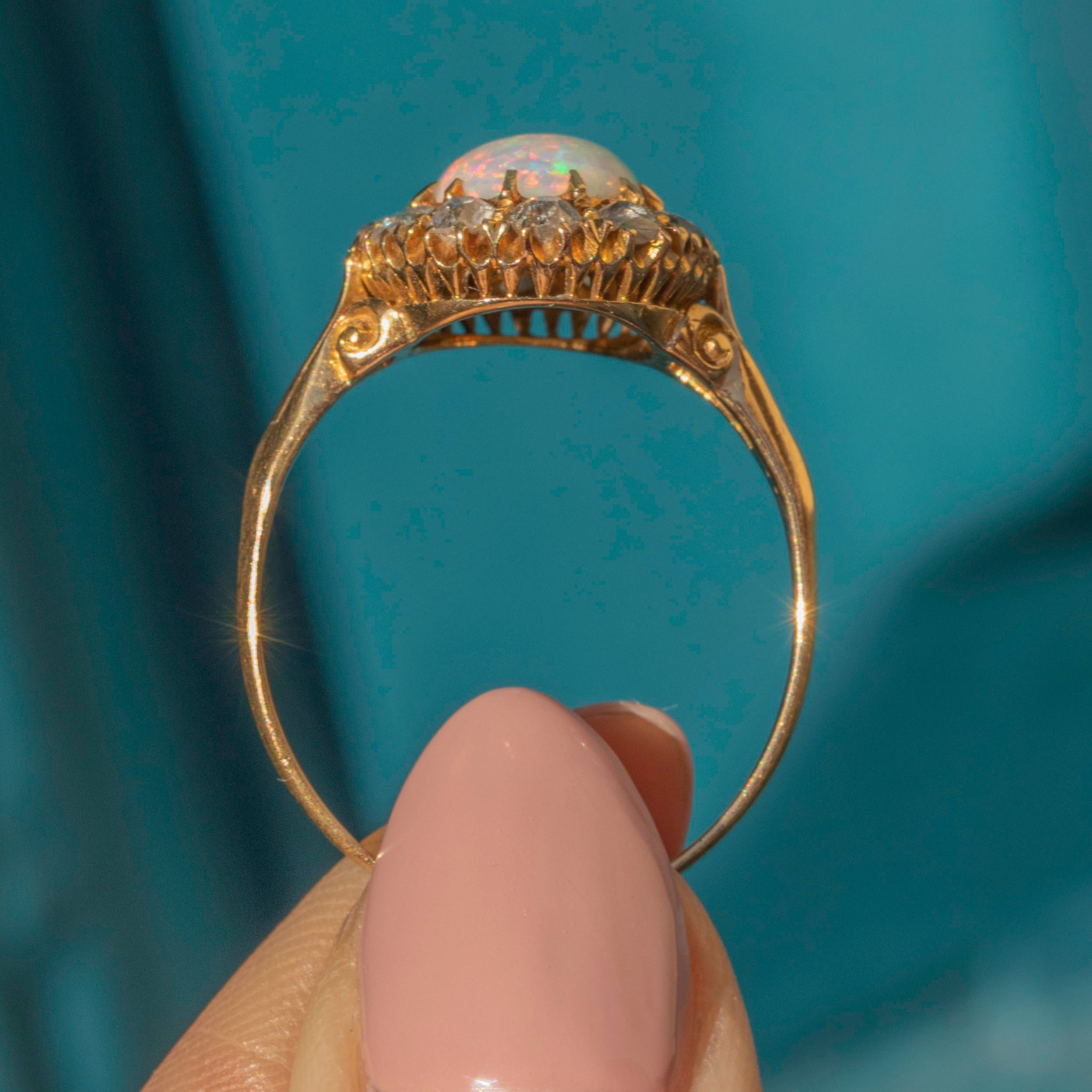 EXCELLENT. This antique 18ct Gold Opal Diamond cluster ring is in excellent condition. The Opal is smooth and free from signs of wear, securely held within its claw settings. The Diamonds are all present and free from fleabites, providing this antique ring with ample sparkle. The 18ct Gold has an even saturation throughout and the ring band has remained robust allowing you to wear this Victorian Opal Diamond ring with absolute confidence. With many more years of wear in her, this splendid piece of Victorian jewellery would make a fabulous heirloom to be passed down the generations!