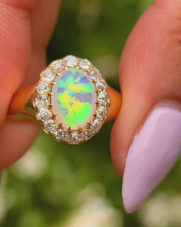 Antique 18ct Gold Opal Diamond Cluster Ring, 2.50ct Opal.