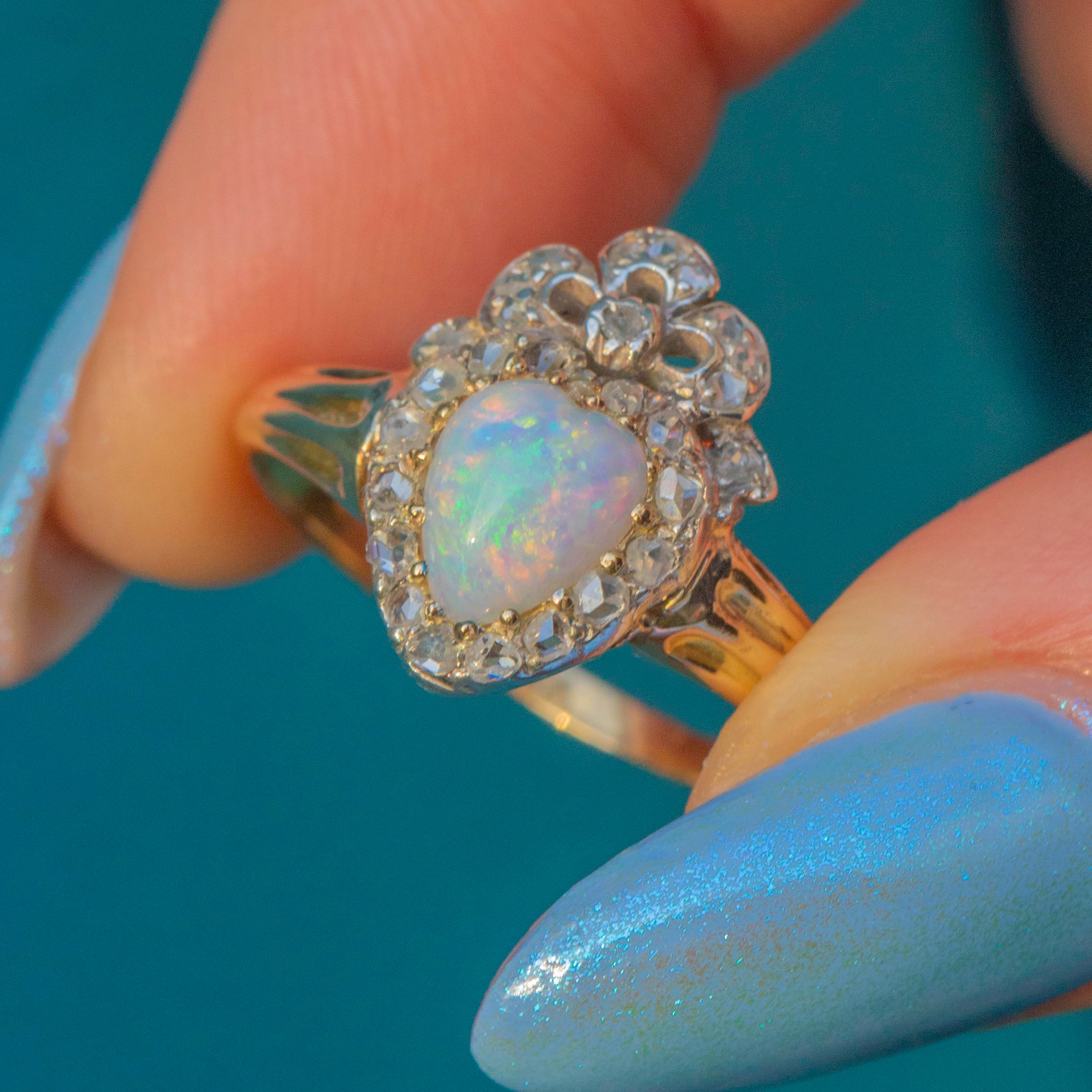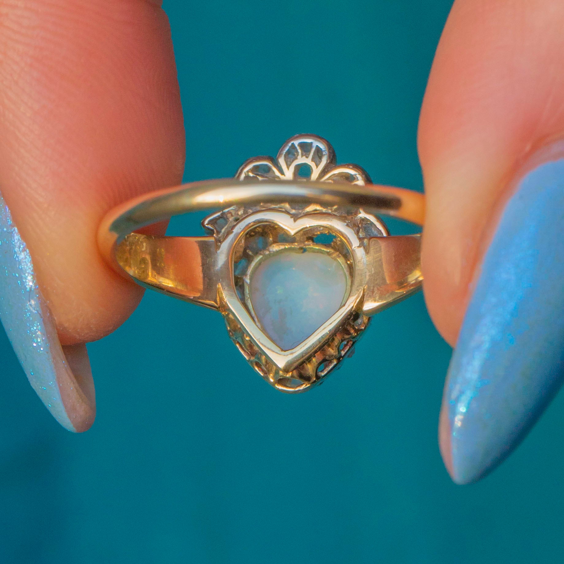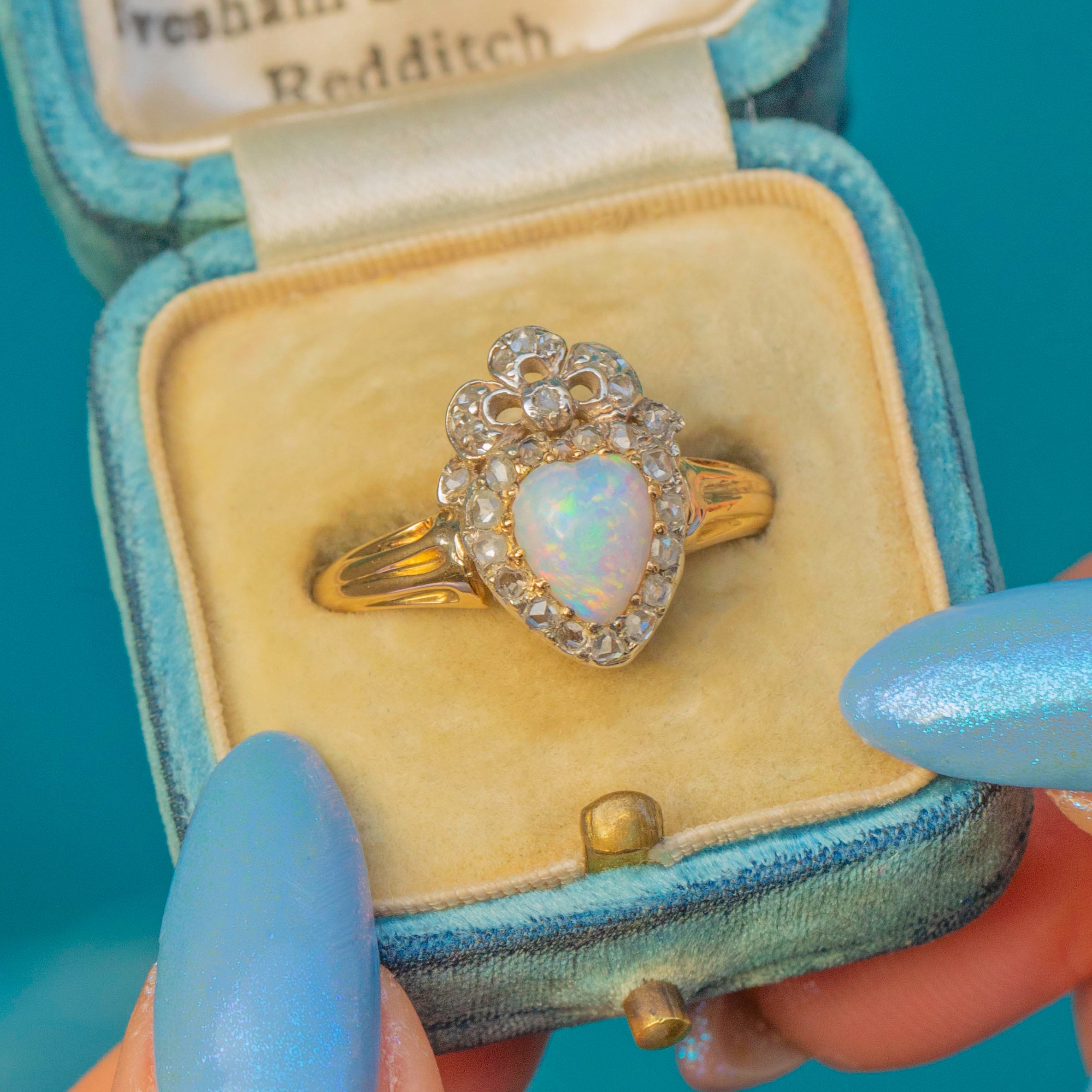 EXCELLENT. This antique 18ct Gold Opal Diamond crowned heart ring is in immaculate condition, with no visible signs of wear or damage. The heart-shaped cabochon Opal retains her vibrant play of colour, while the rose-cut Diamonds are securely set, exhibiting their original brilliance. A delightful piece!
