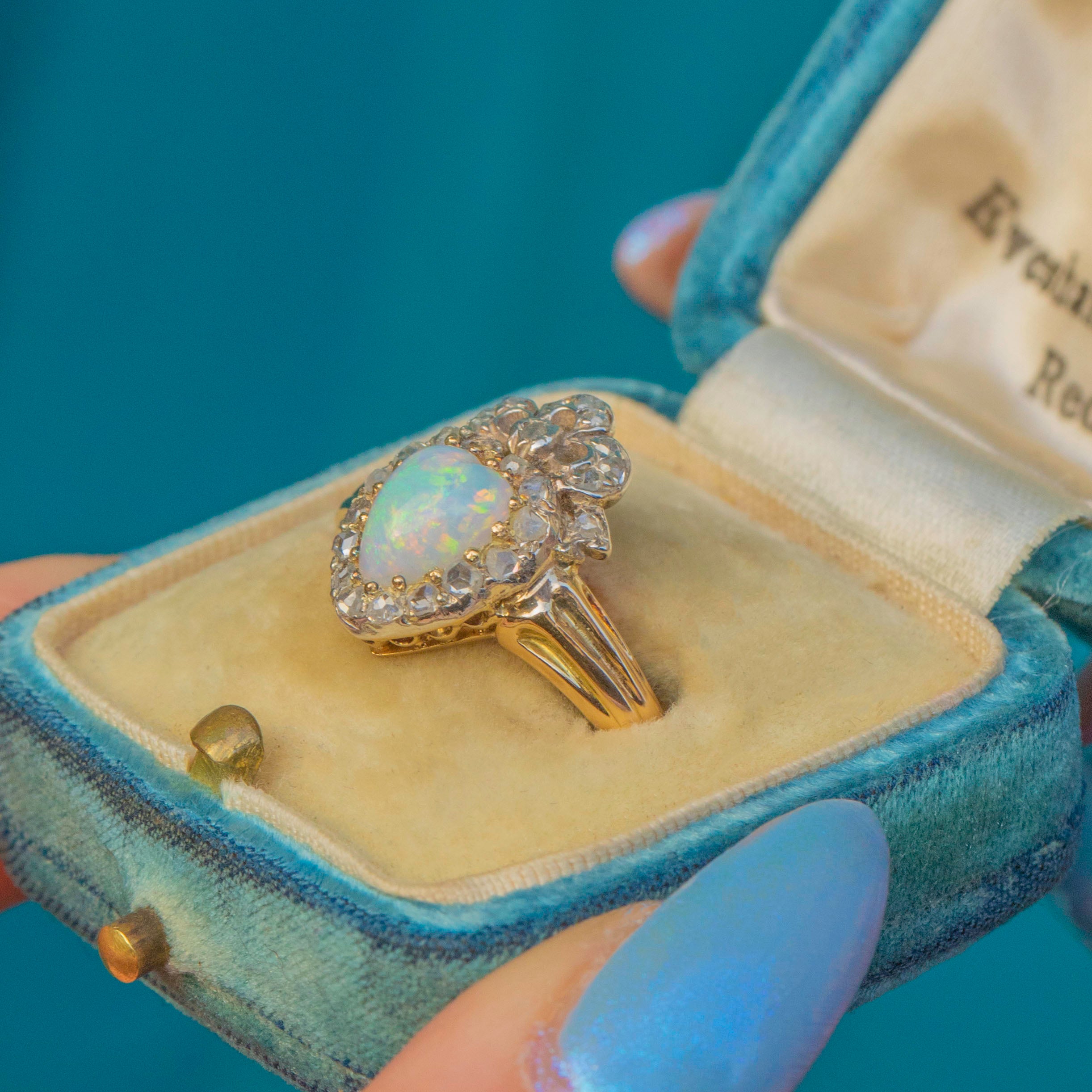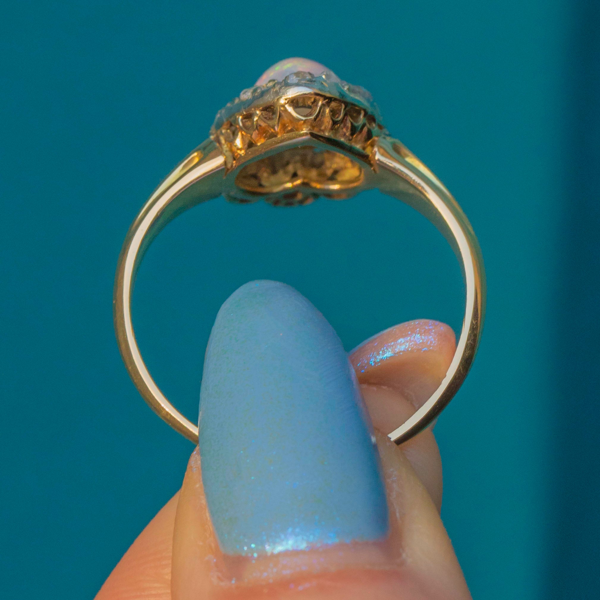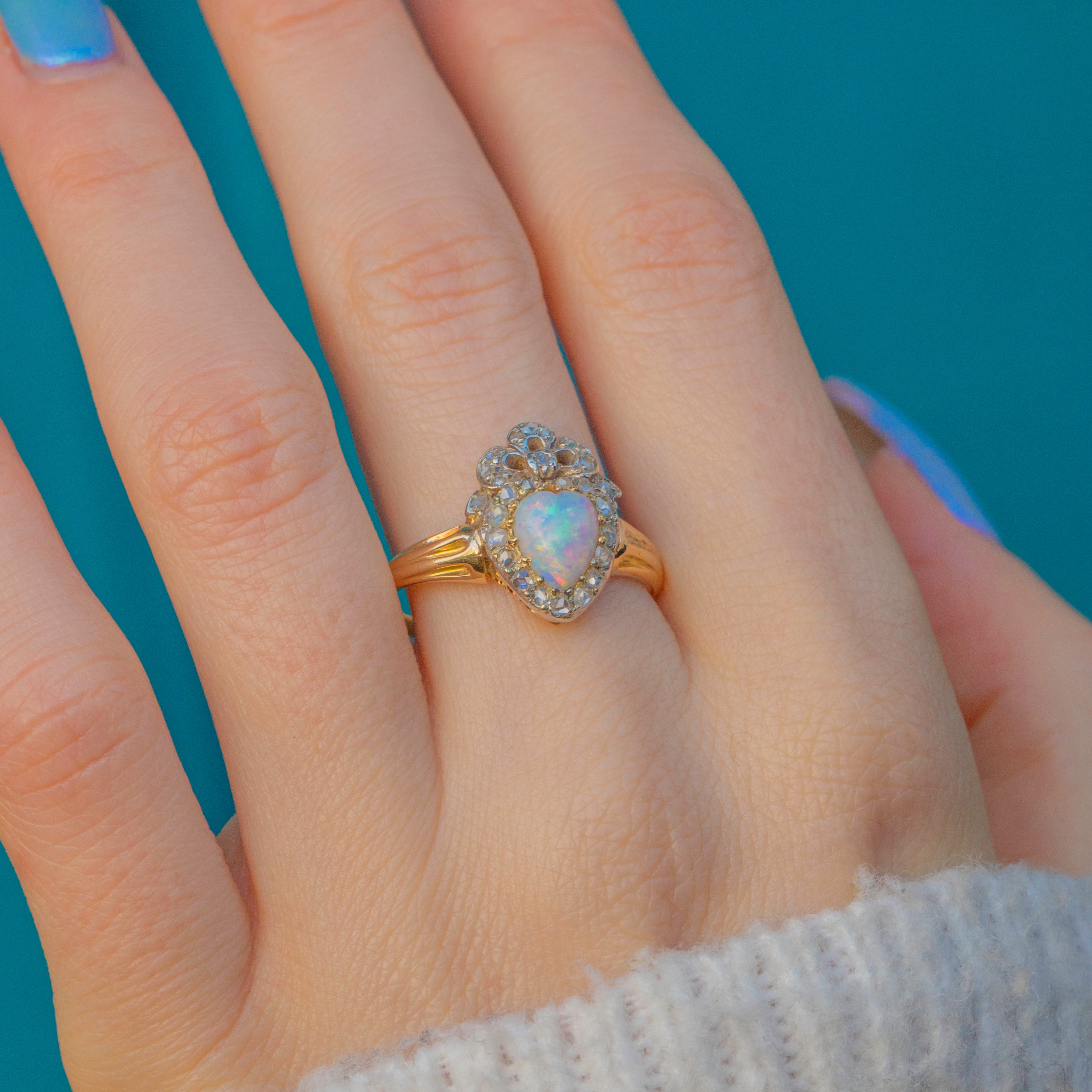 EXCELLENT. This antique 18ct Gold Opal Diamond crowned heart ring is in immaculate condition, with no visible signs of wear or damage. The heart-shaped cabochon Opal retains her vibrant play of colour, while the rose-cut Diamonds are securely set, exhibiting their original brilliance. A delightful piece!