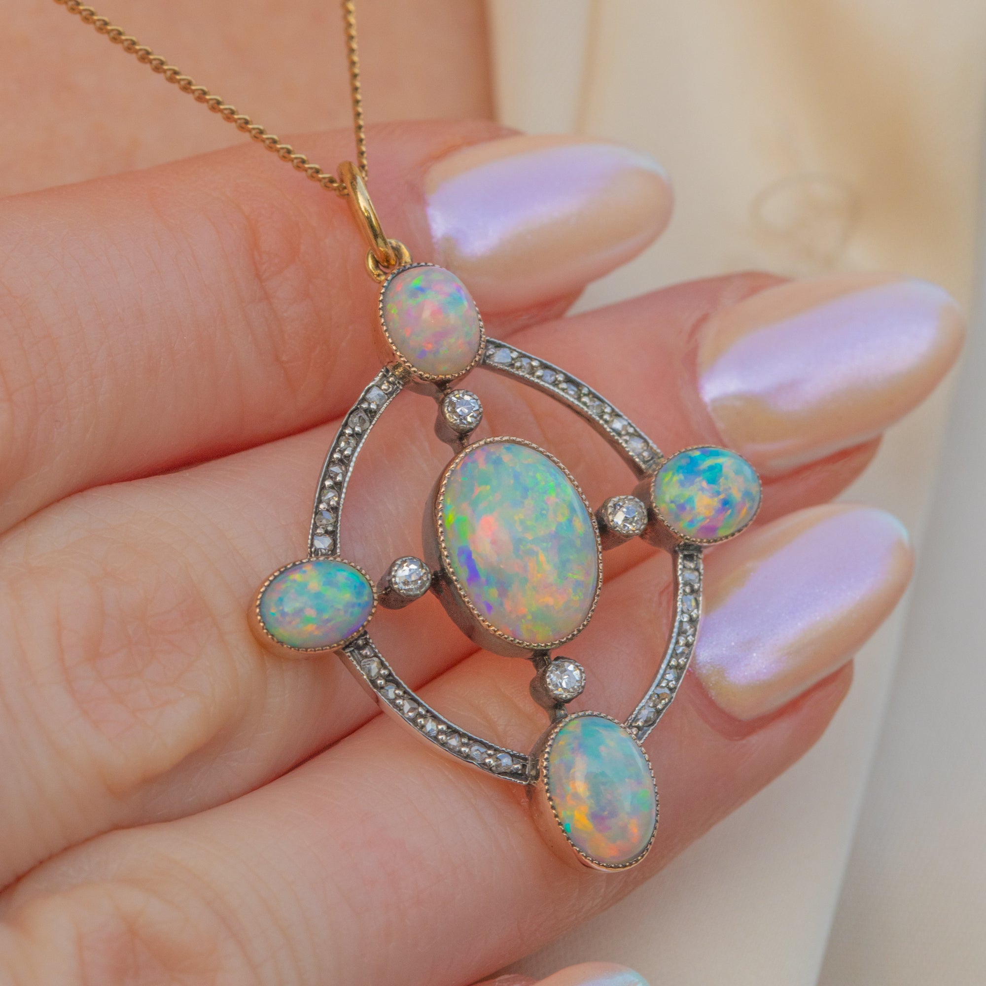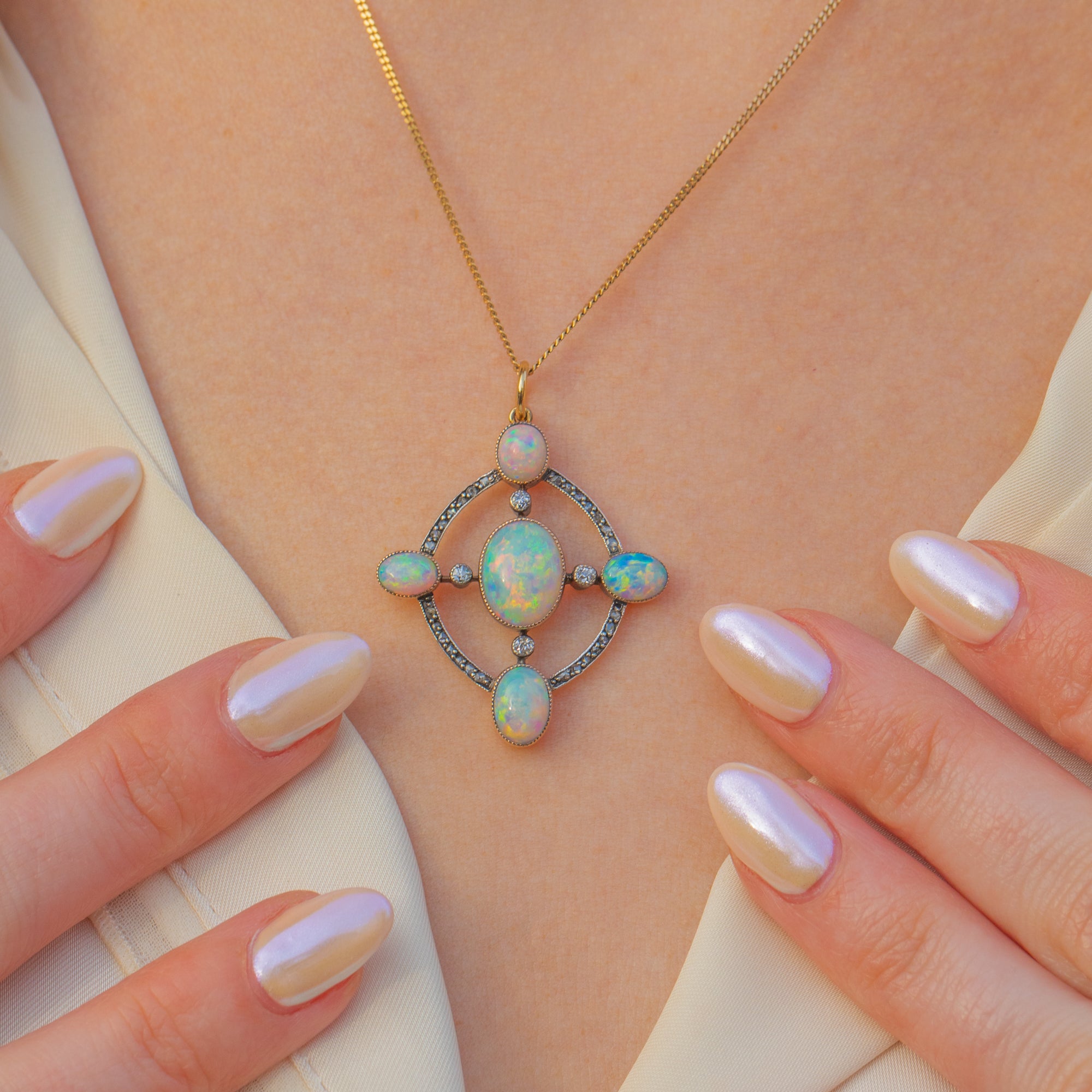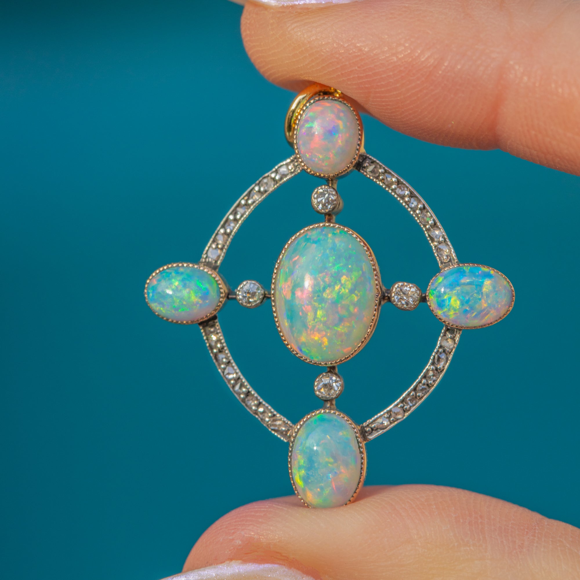 This antique 18ct Gold Opal Diamond pendant is simply stunning! She features five plump Opals, each capturing the light wonderfully and radiating a kaleidoscope of soft blues, purples, and pinks, adorned by a halo of twinkling rose-cut Diamonds.