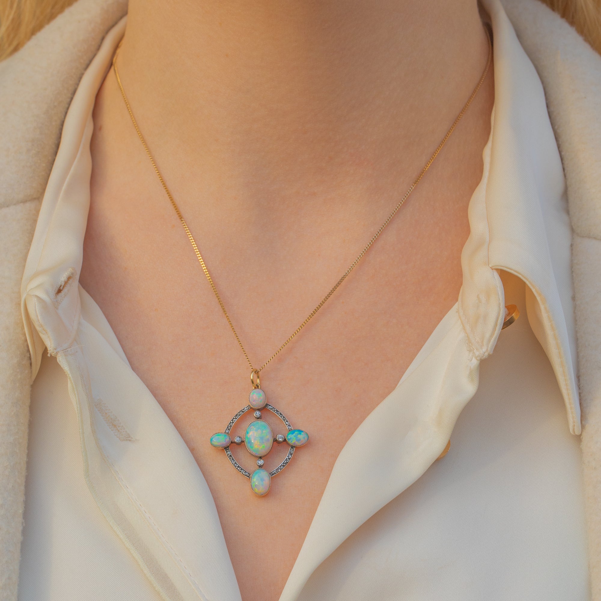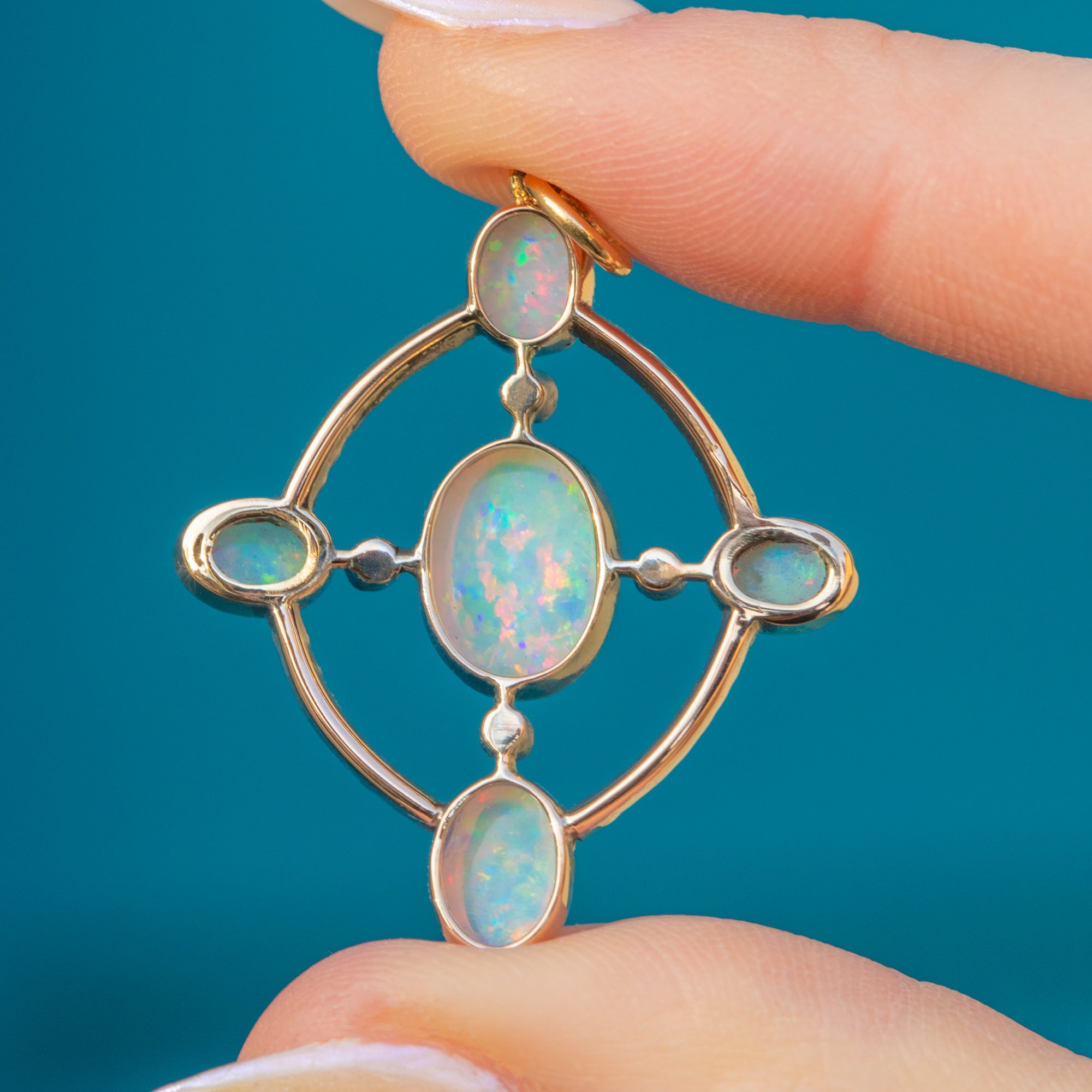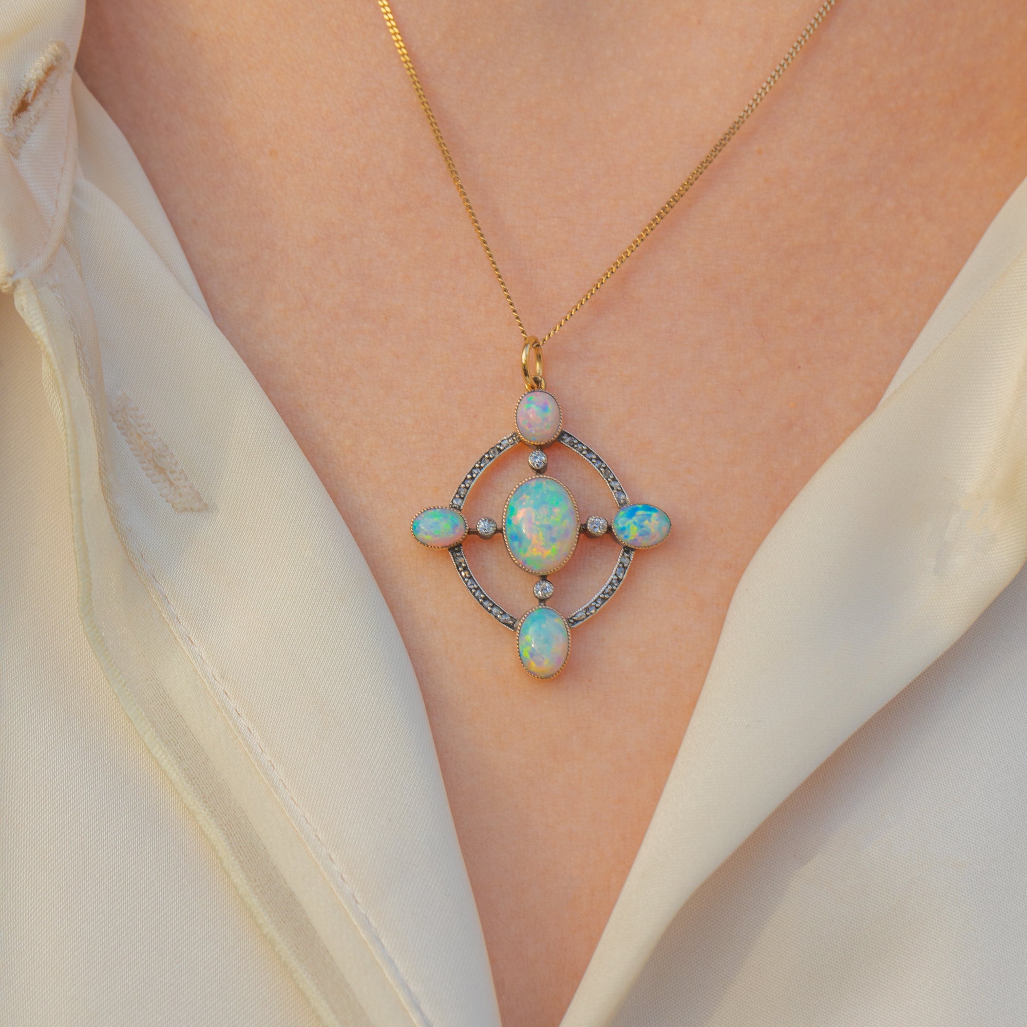 This antique 18ct Gold Opal Diamond pendant is simply stunning! She features five plump Opals, each capturing the light wonderfully and radiating a kaleidoscope of soft blues, purples, and pinks, adorned by a halo of twinkling rose-cut Diamonds.