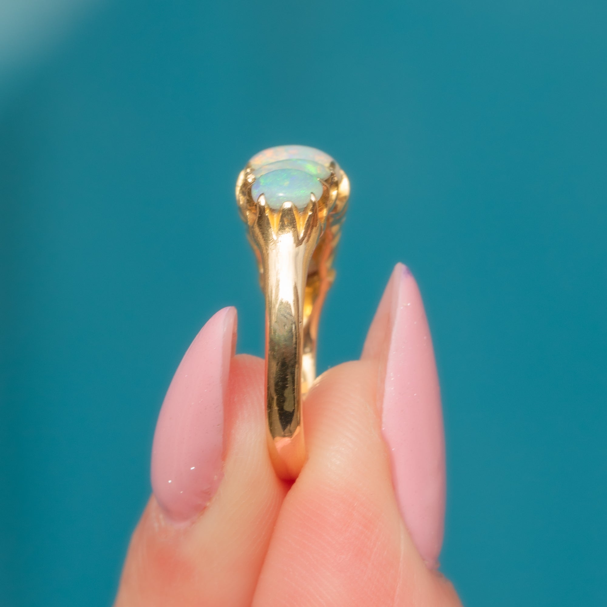 Her 18ct Gold band is buttery and possesses an alluring glow, with settings that provide a perfect throne for the iridescent natural solid Opals. Showcasing a spellbinding confetti display of vibrant greens, soft blues and pinks, each Opal is whimsical and thrives beneath the light, enchanting anyone who lays eyes on this spectacular Victorian ring!