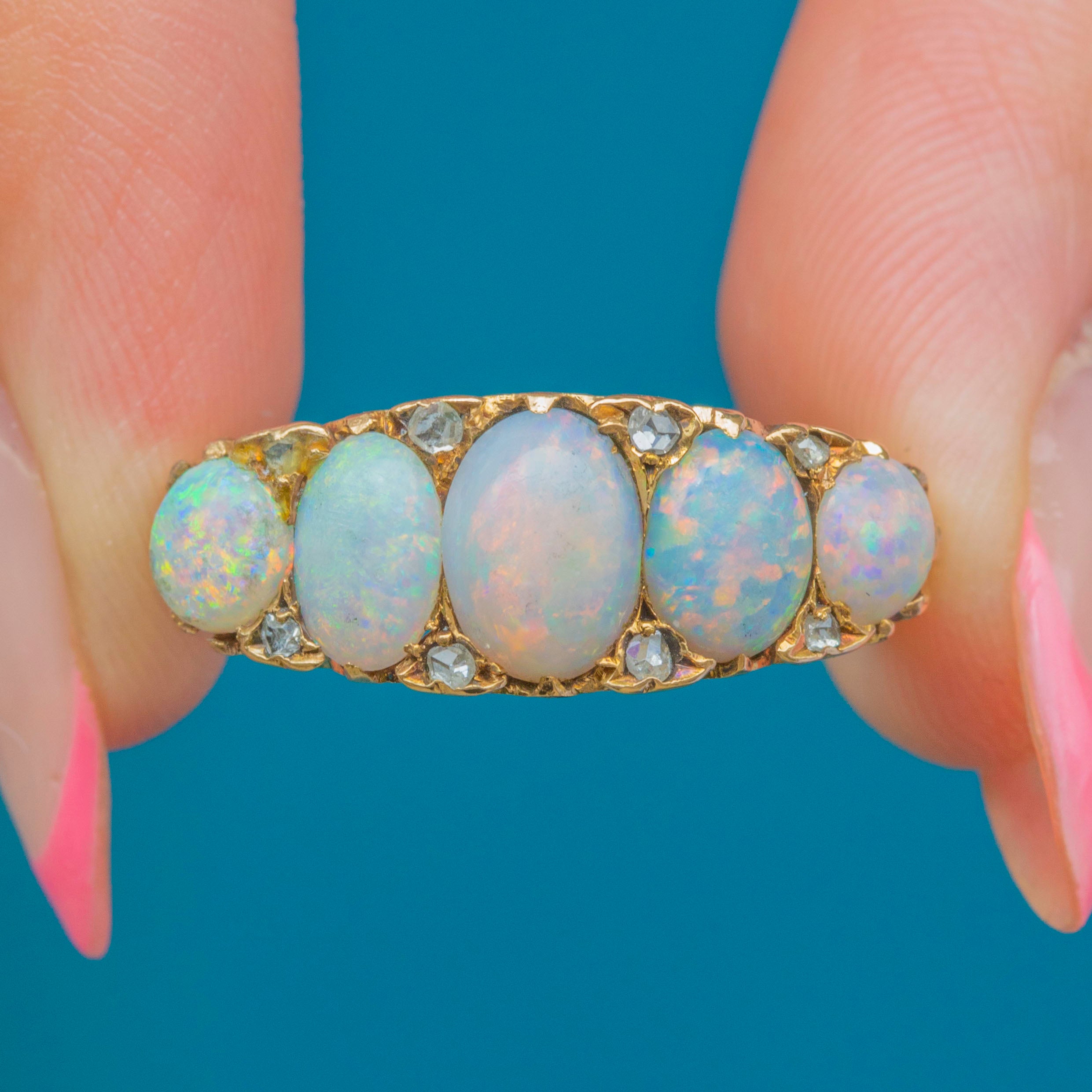 EXCELLENT: This antique 18ct Gold Opal five stone ring is in outstanding condition throughout. The Opals are perfectly smooth, with no chips or scuffs, and their settings keep them securely held in place. The Diamonds are bright with no chips. The Gold has an even saturation, and the gallery has no signs of wear. A superb piece of Victorian jewellery ready to be worn and appreciated for generations to come!
