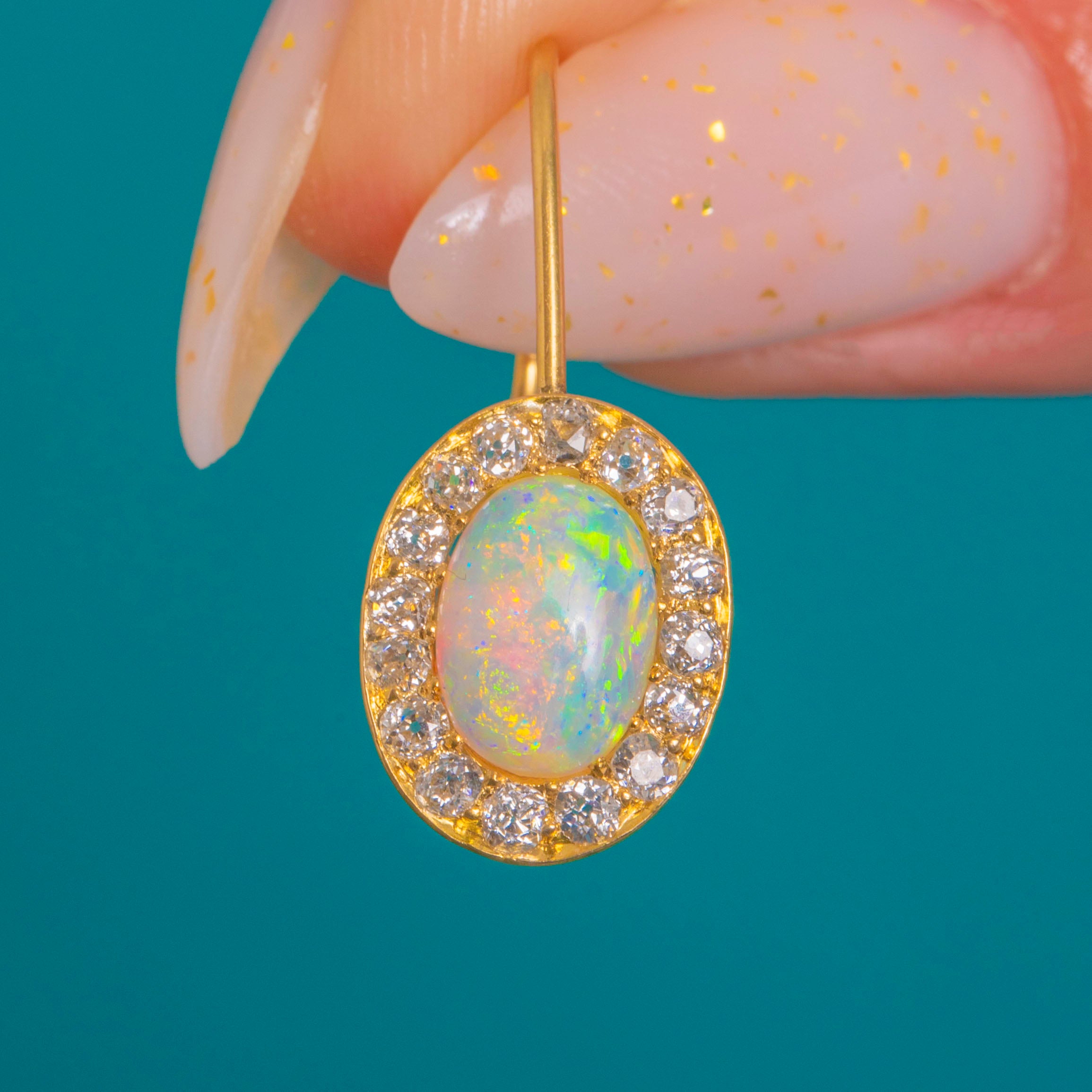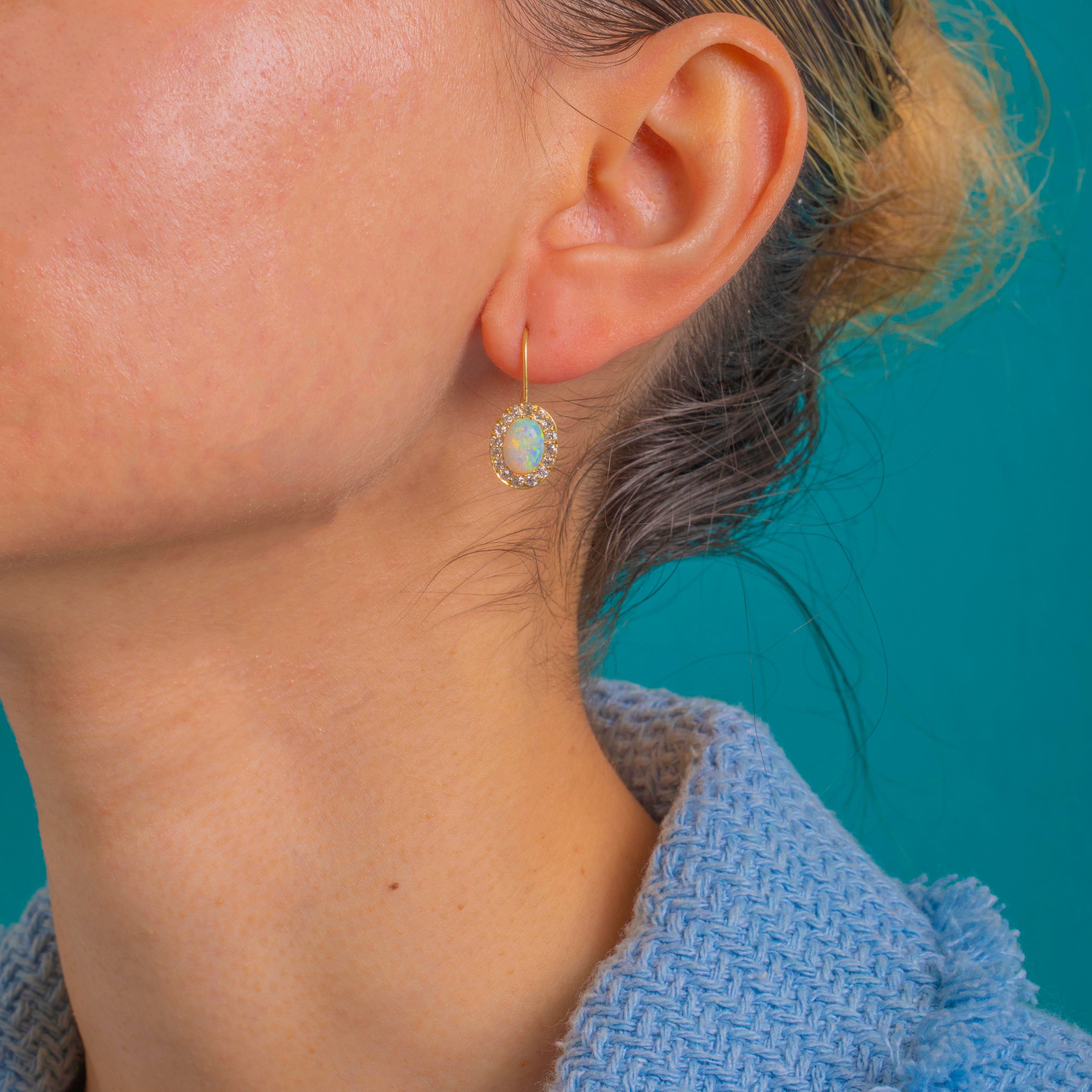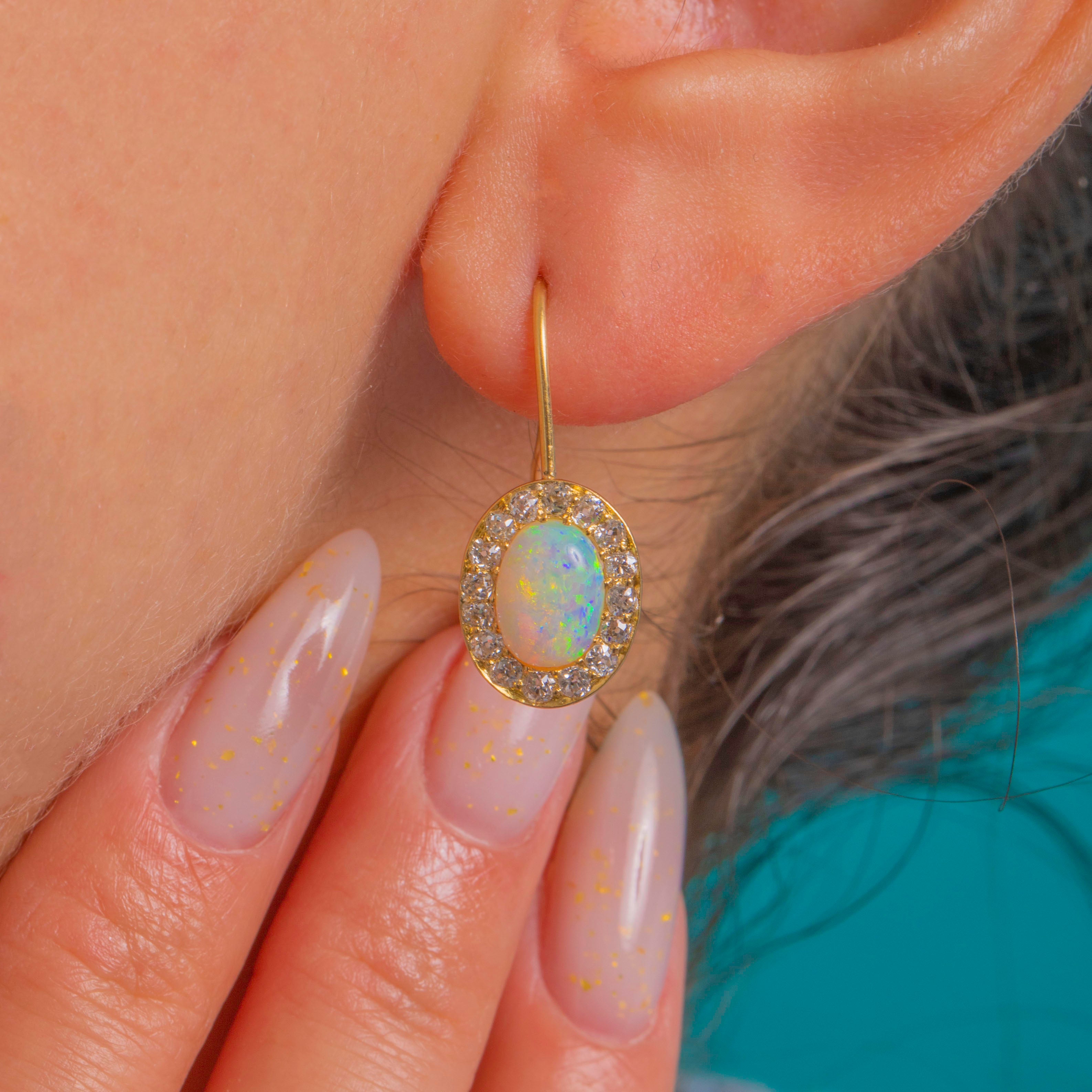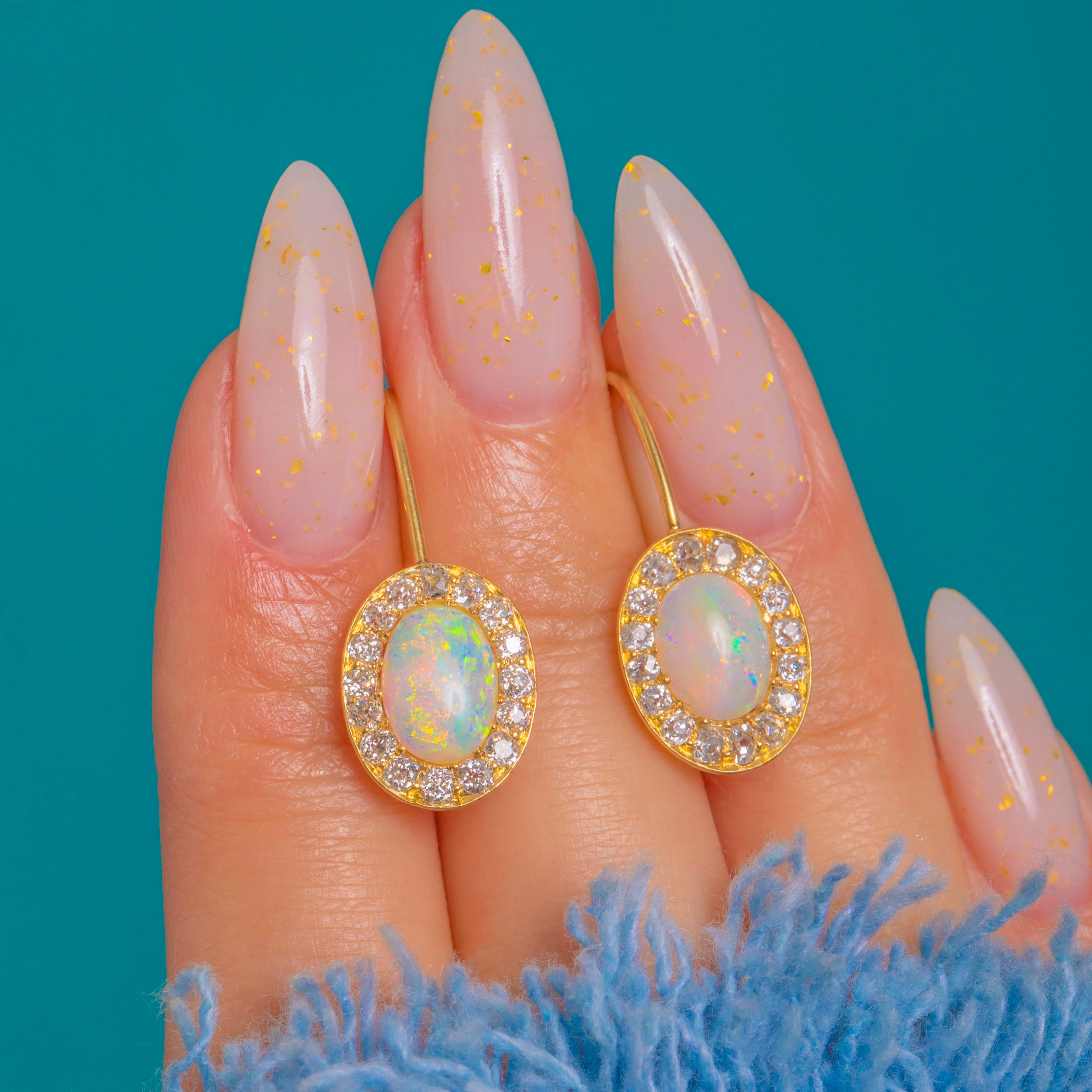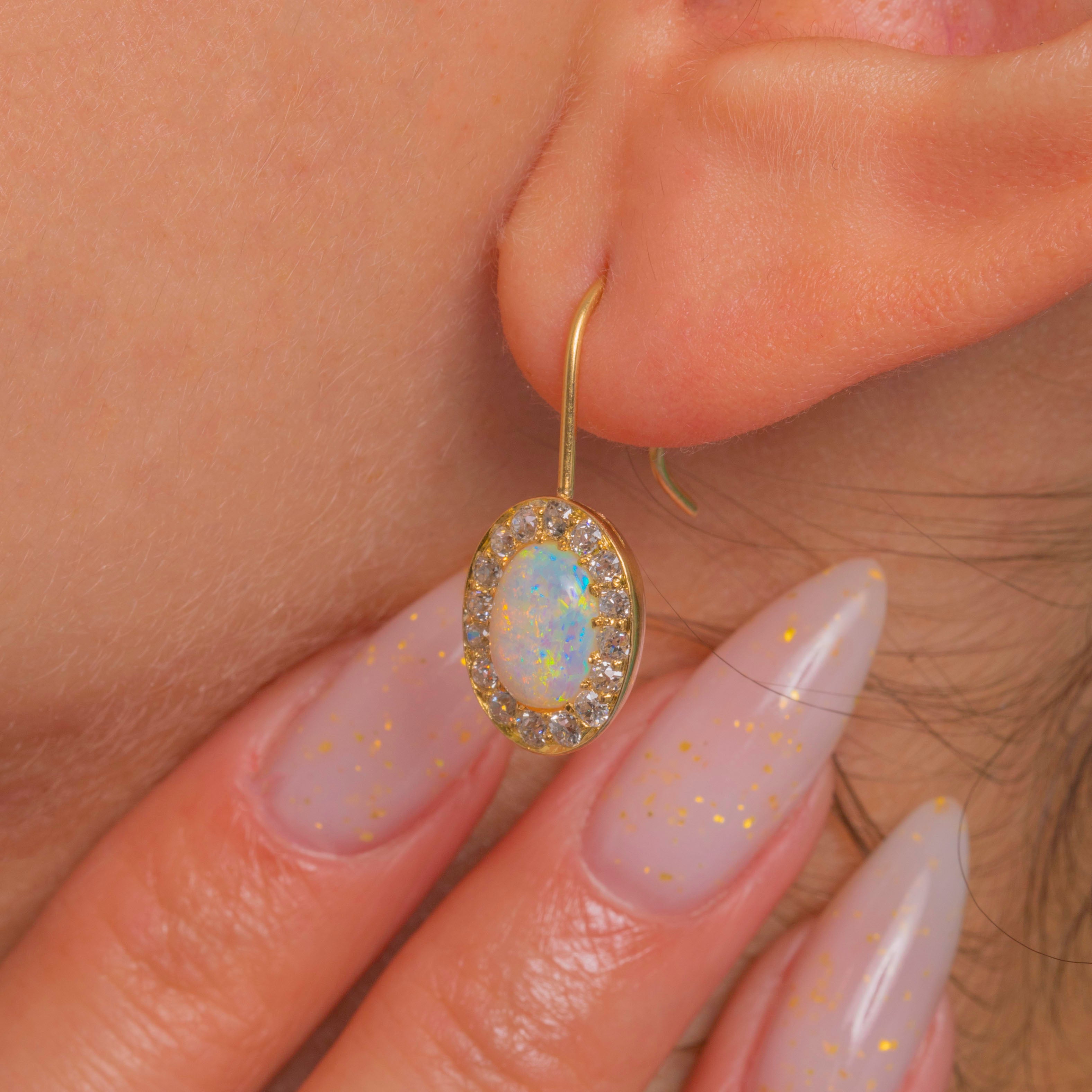 Elegant Victorian charm meets kaleidoscopic colour in these 18ct Gold Opal and Diamond cluster drops. Each earring centres a natural solid Opal cabochon alive with vivid flashes of green, blue, orange and yellow, framed by a scintillating halo of antique Old Mine Cut Diamonds for a classic, luminous finish.