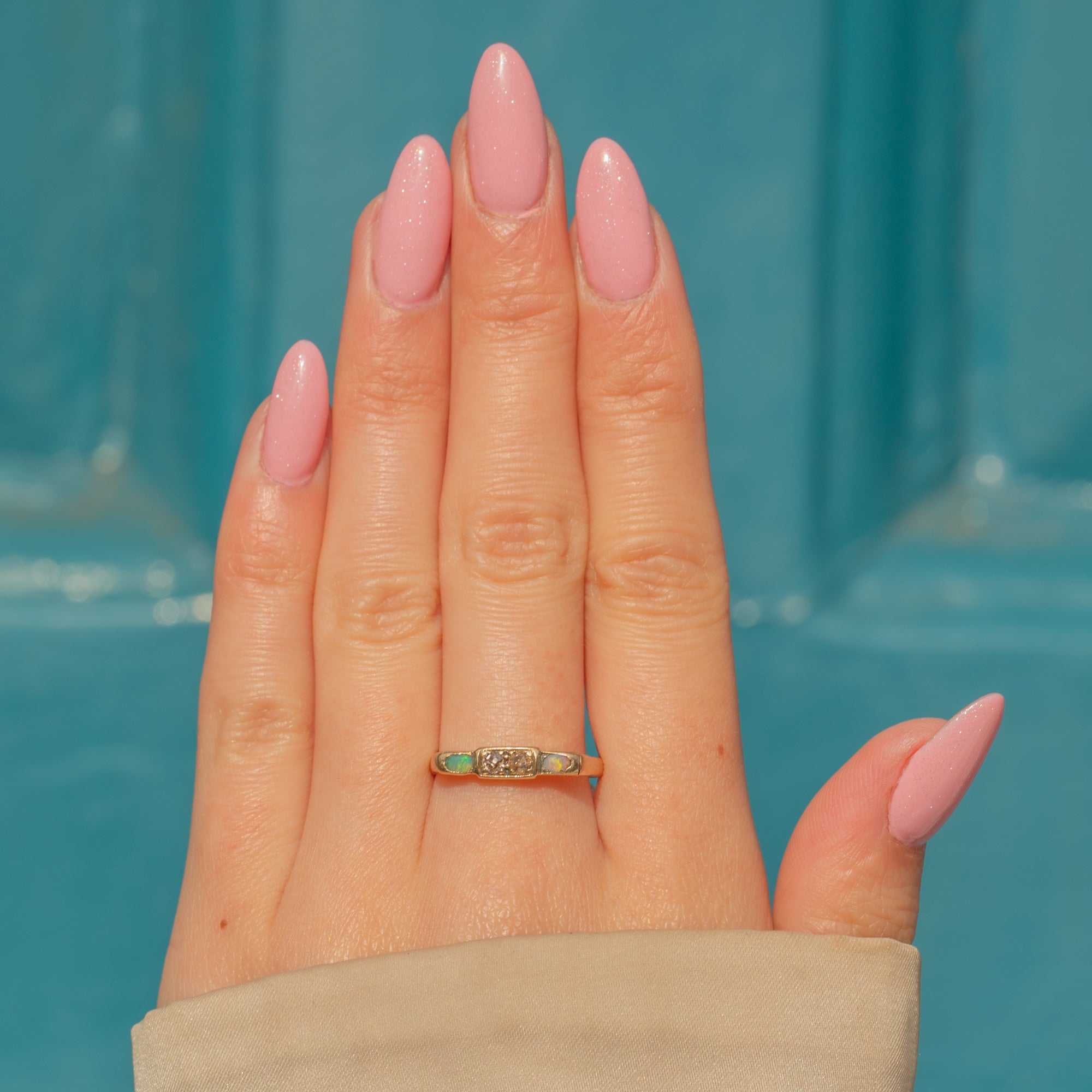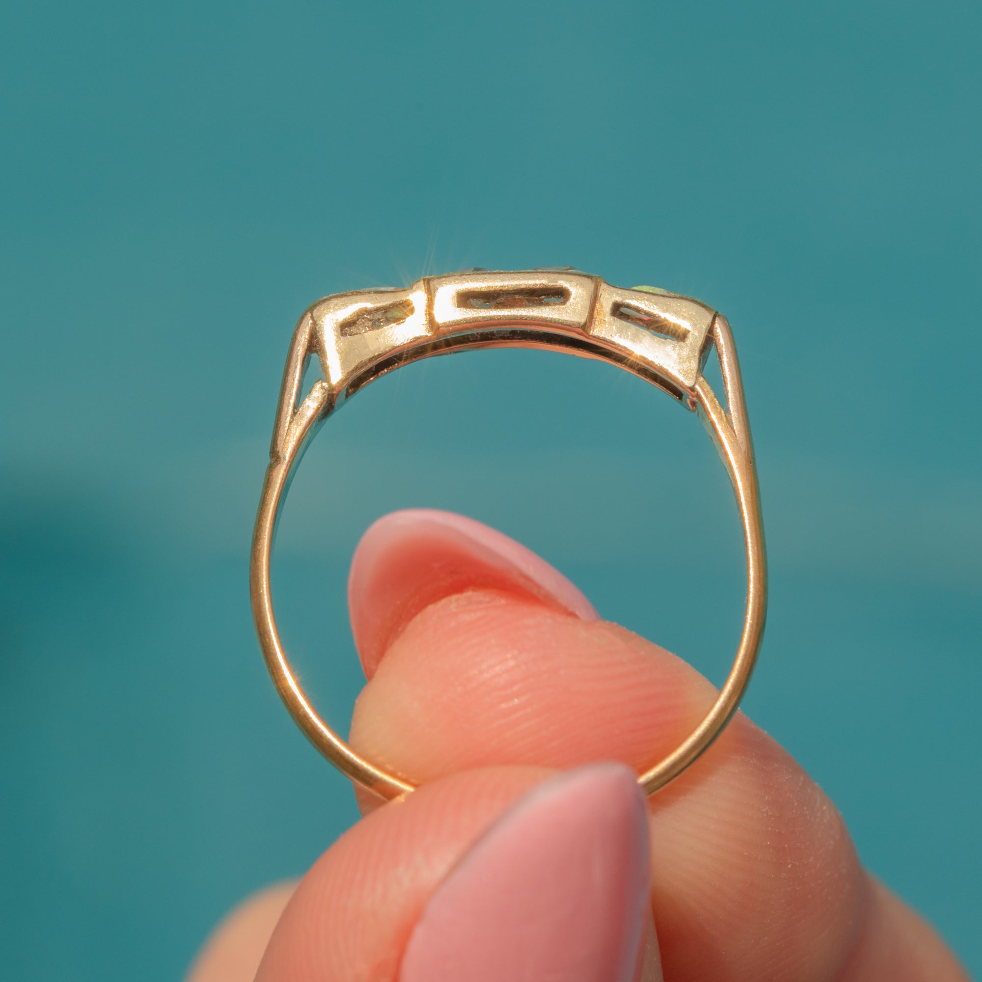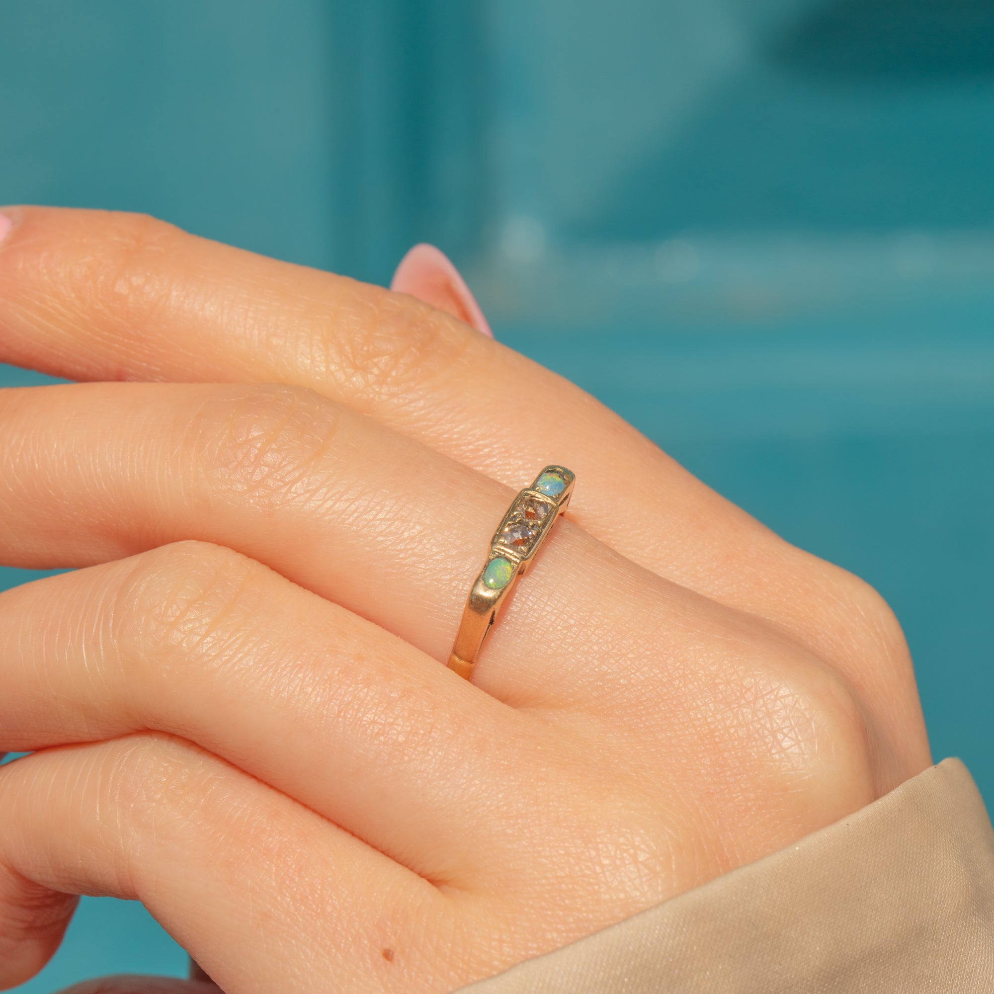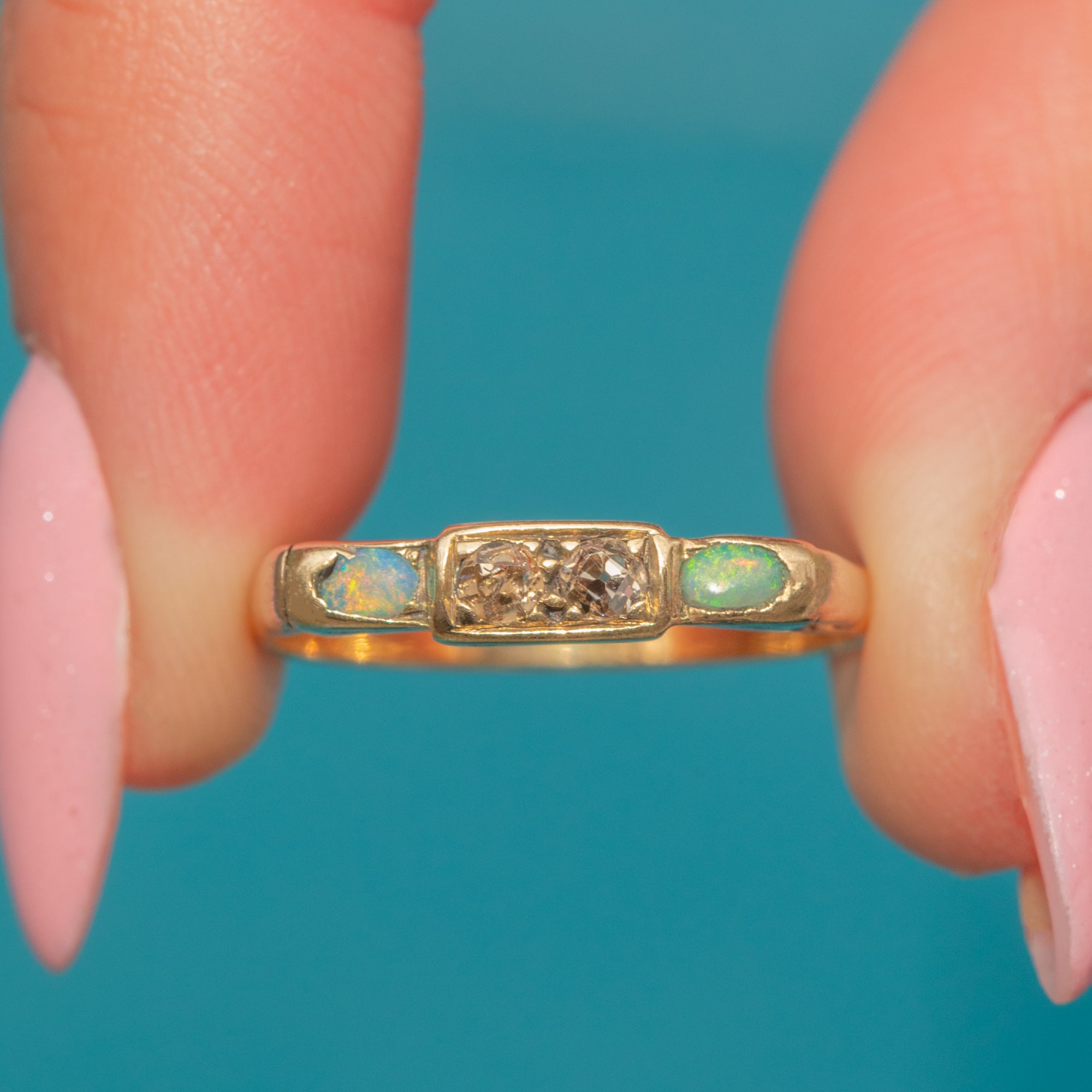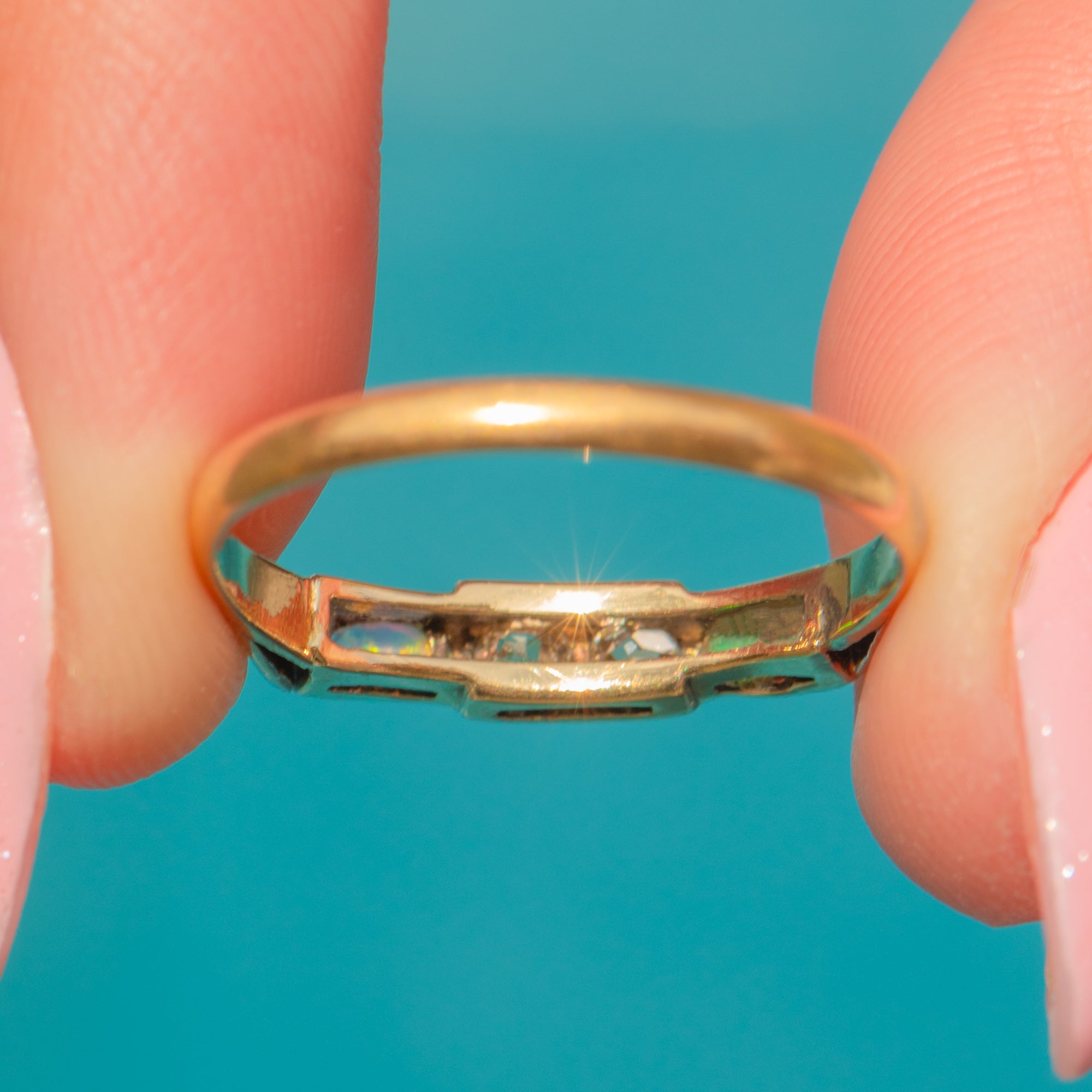 This antique 18ct Gold Opal rose-cut Diamond stacking ring is a sweet and wearable piece! The vibrant Opals and twinkling Diamonds span the width of your finger, set into saturated 18ct Gold for a luxurious finish.