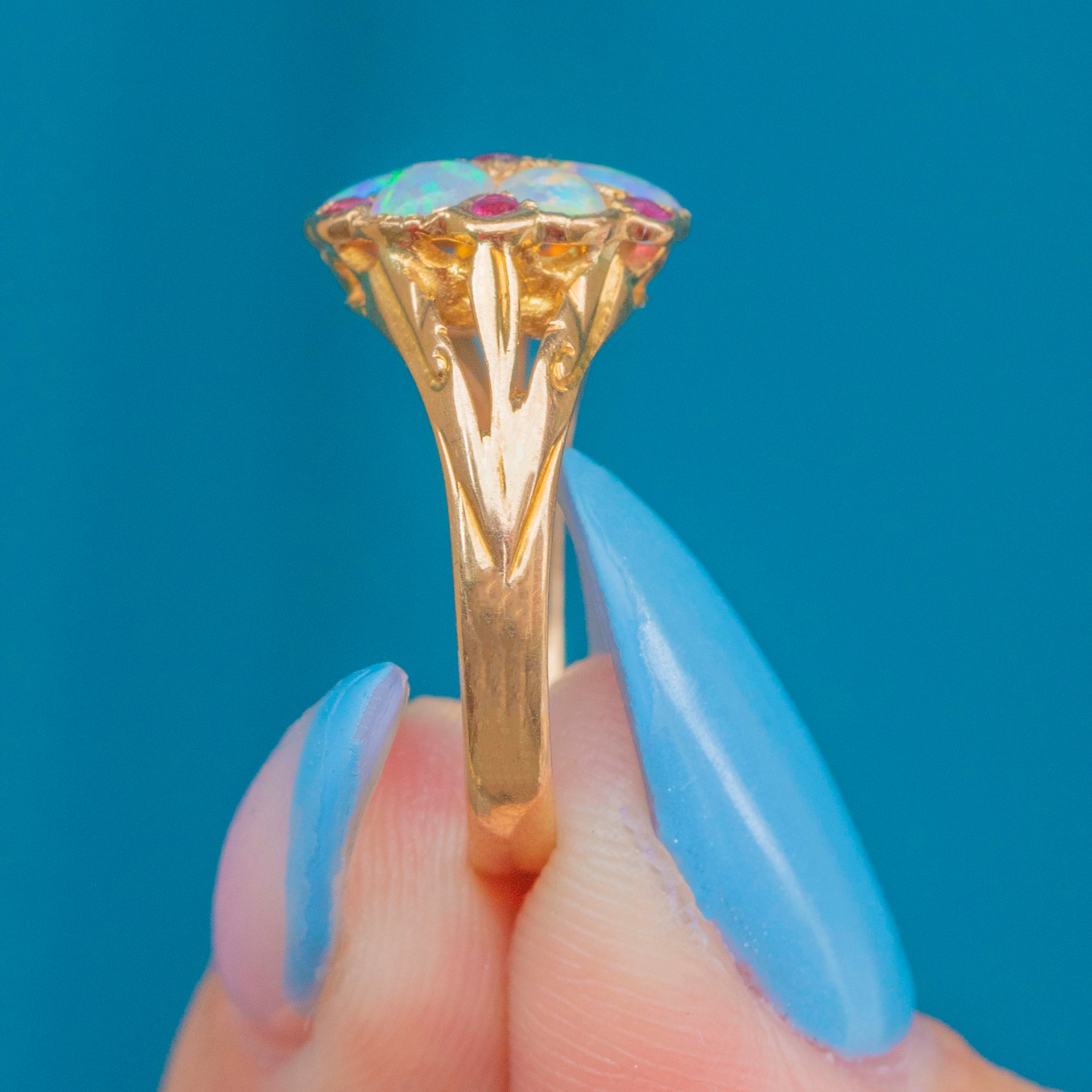 This lively antique ring is crafted from solid 18ct Gold and has a spectacular display of vibrant Opals and fuchsia Rubies arranged into a charming flower cluster. Each Opal cabochon shimmers with ethereal blues and grees, with specks of orange and pink revealed as they move in the light.
