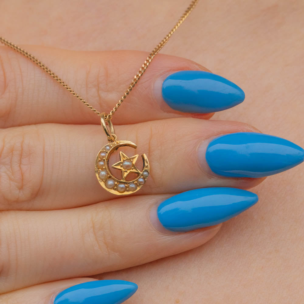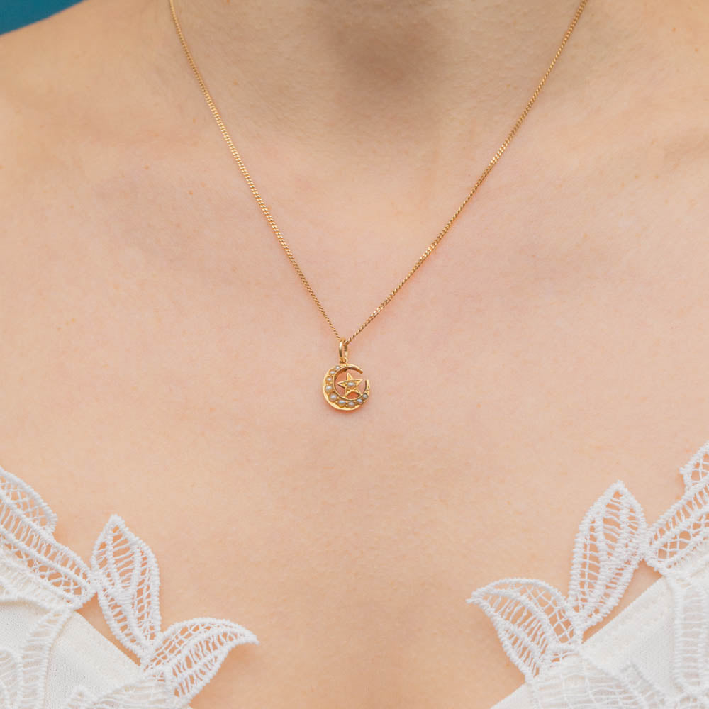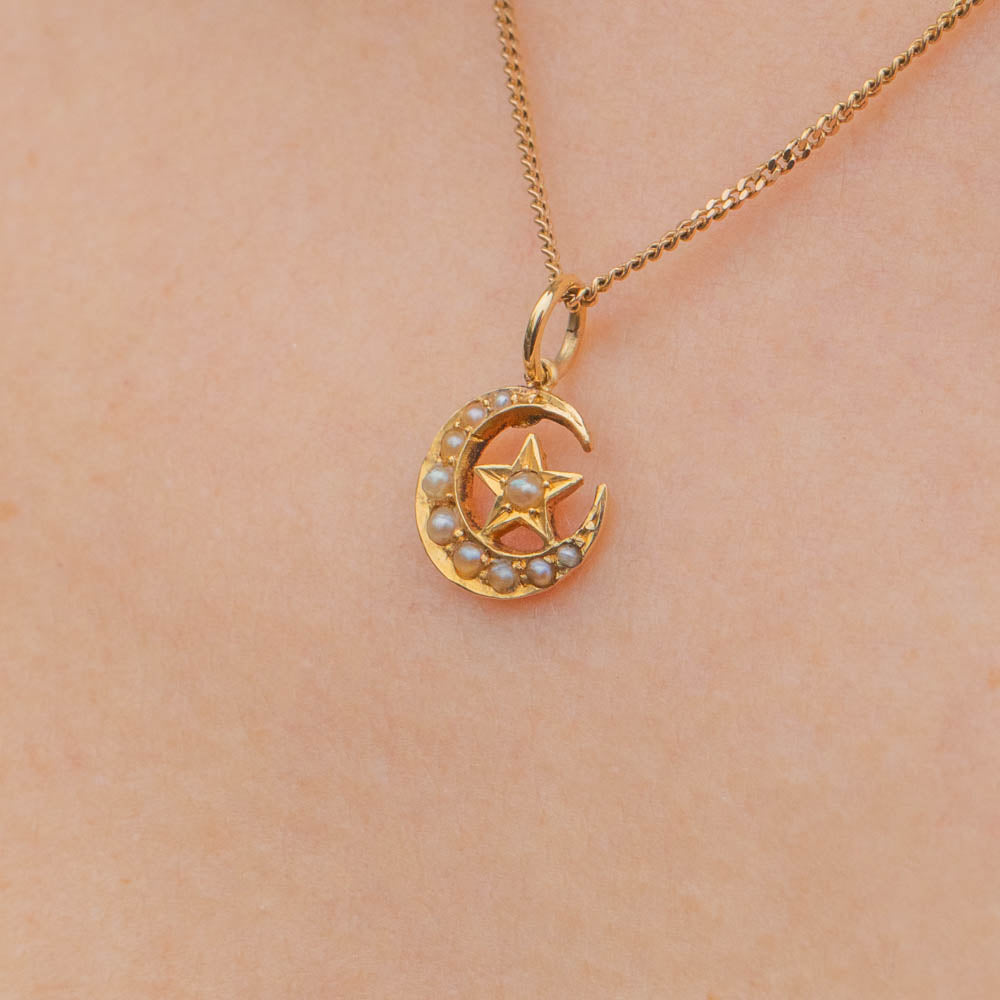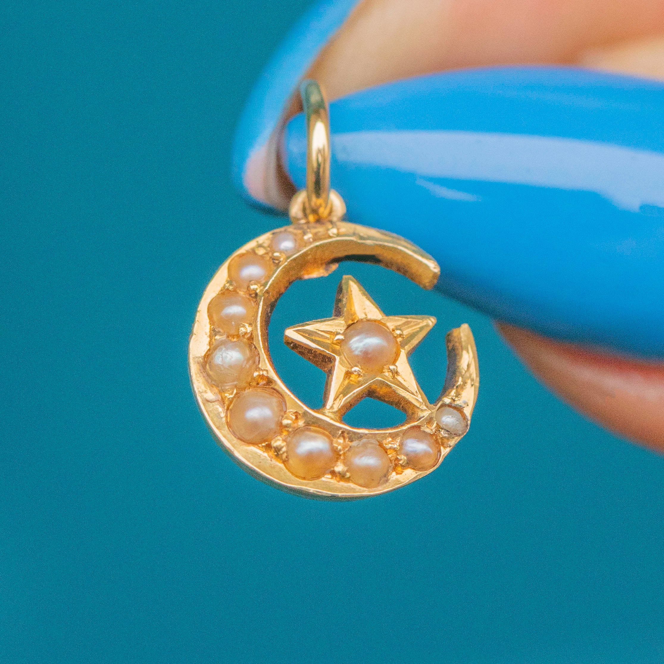 Antique 18ct Gold Pearl Crescent Moon & Star Charm