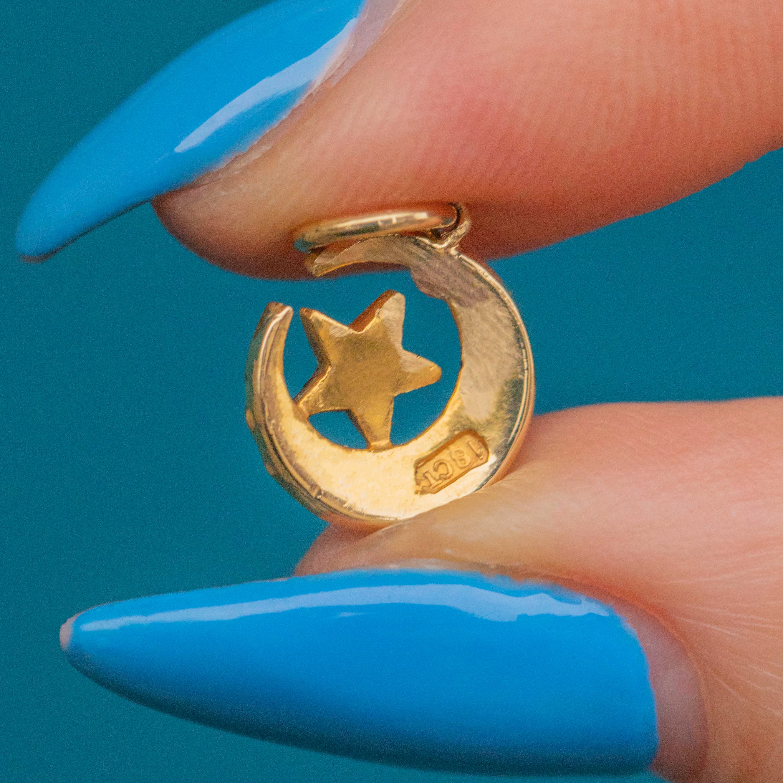 Undeniably striking, this antique 18ct Gold Pearl crescent moon & star charm will inject a touch of celestial allure into your collection! This Victorian charm is studded with lustrous Pearls that seamlessly follow the form of her curvaceous crescent, arching a five-point star at her centre.