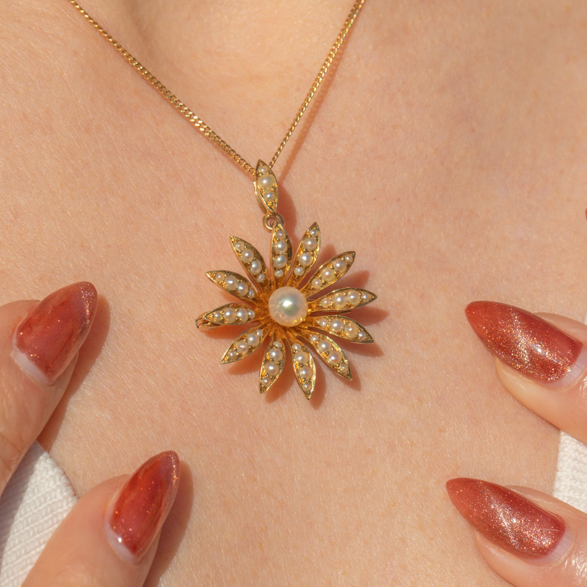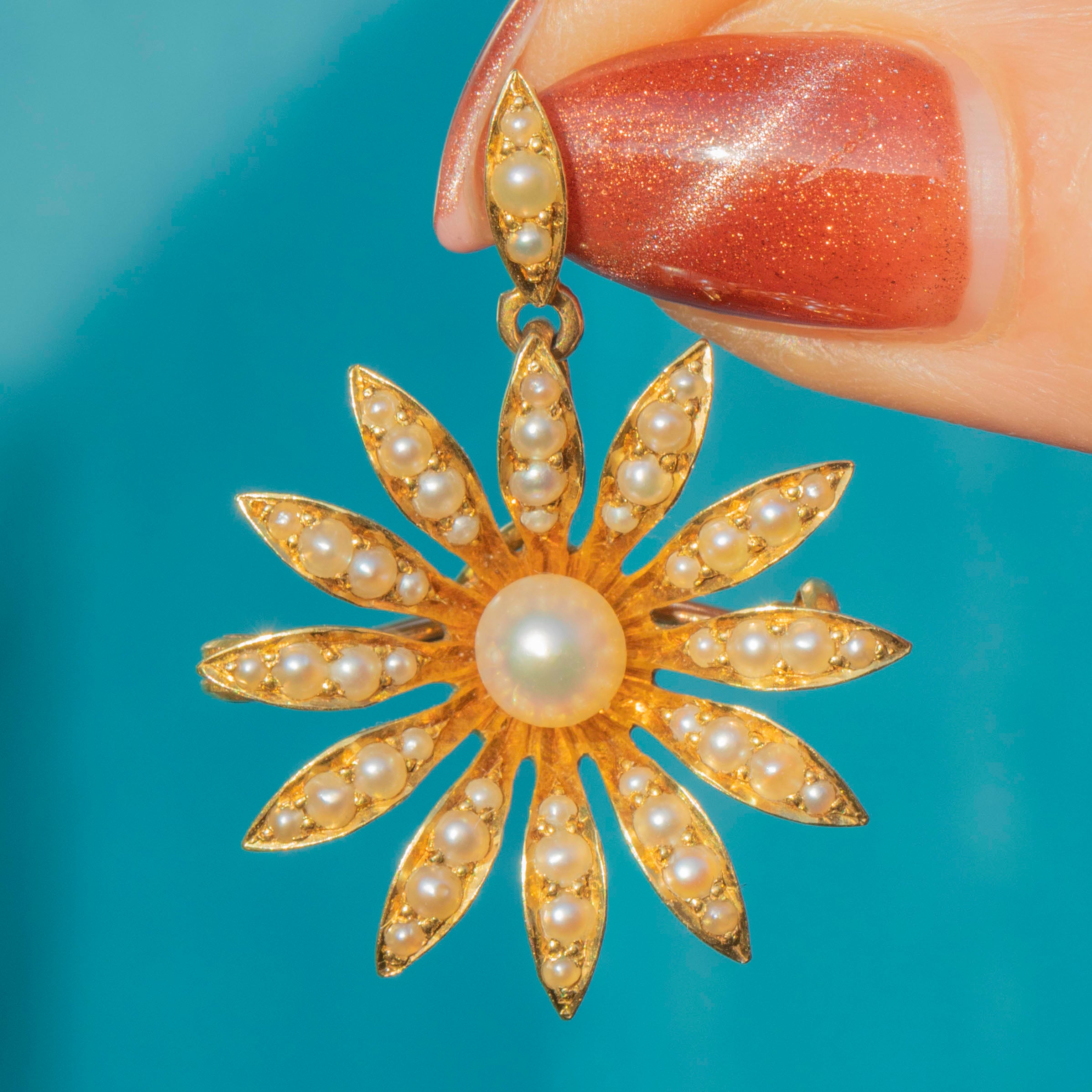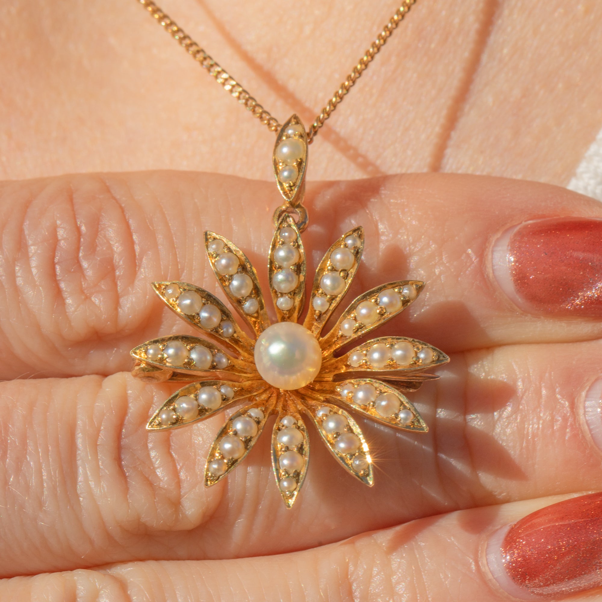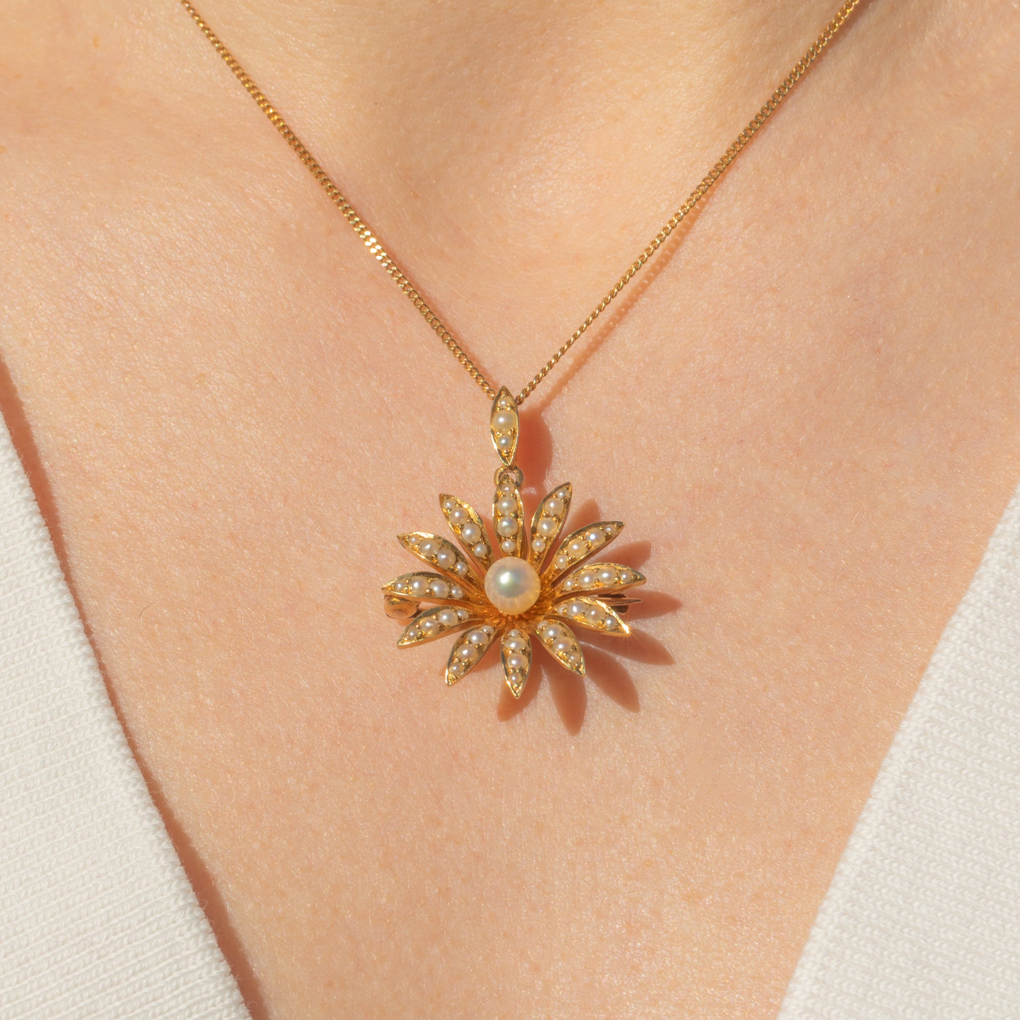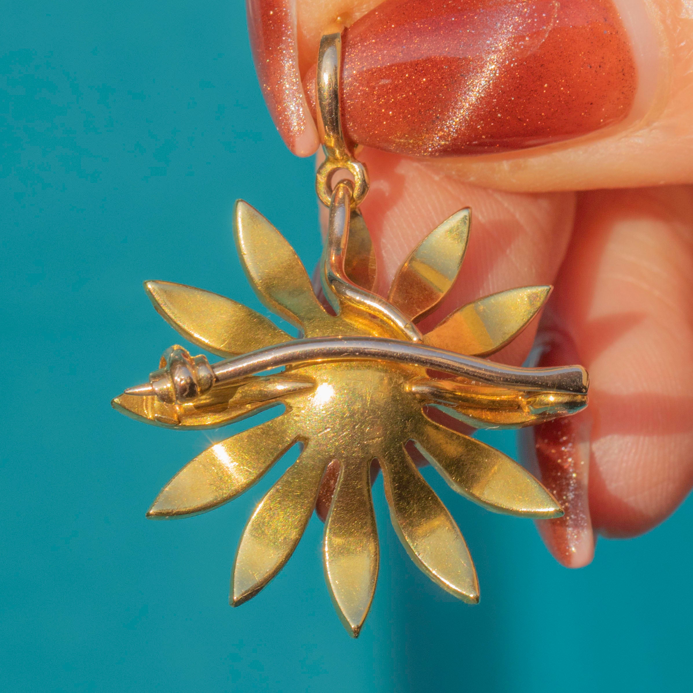 EXCELLENT. This antique 18ct Gold Pearl daisy flower pendant is in excellent condition. The lovely natural Pearl centre has a gorgeous ivory hue and pretty pink, lilac and gold overtones. Although the flower is 18ct Gold and the bale is 15ct, they do make for an incredible matching pair. The two purities of Gold in the pendant are unusual, but it appears original and well-matched. The pin is of lower purity, at 9ct Gold, which is quite typical of the era, and makes for a solid and robust pin. All the components are original and antique, with no damage.