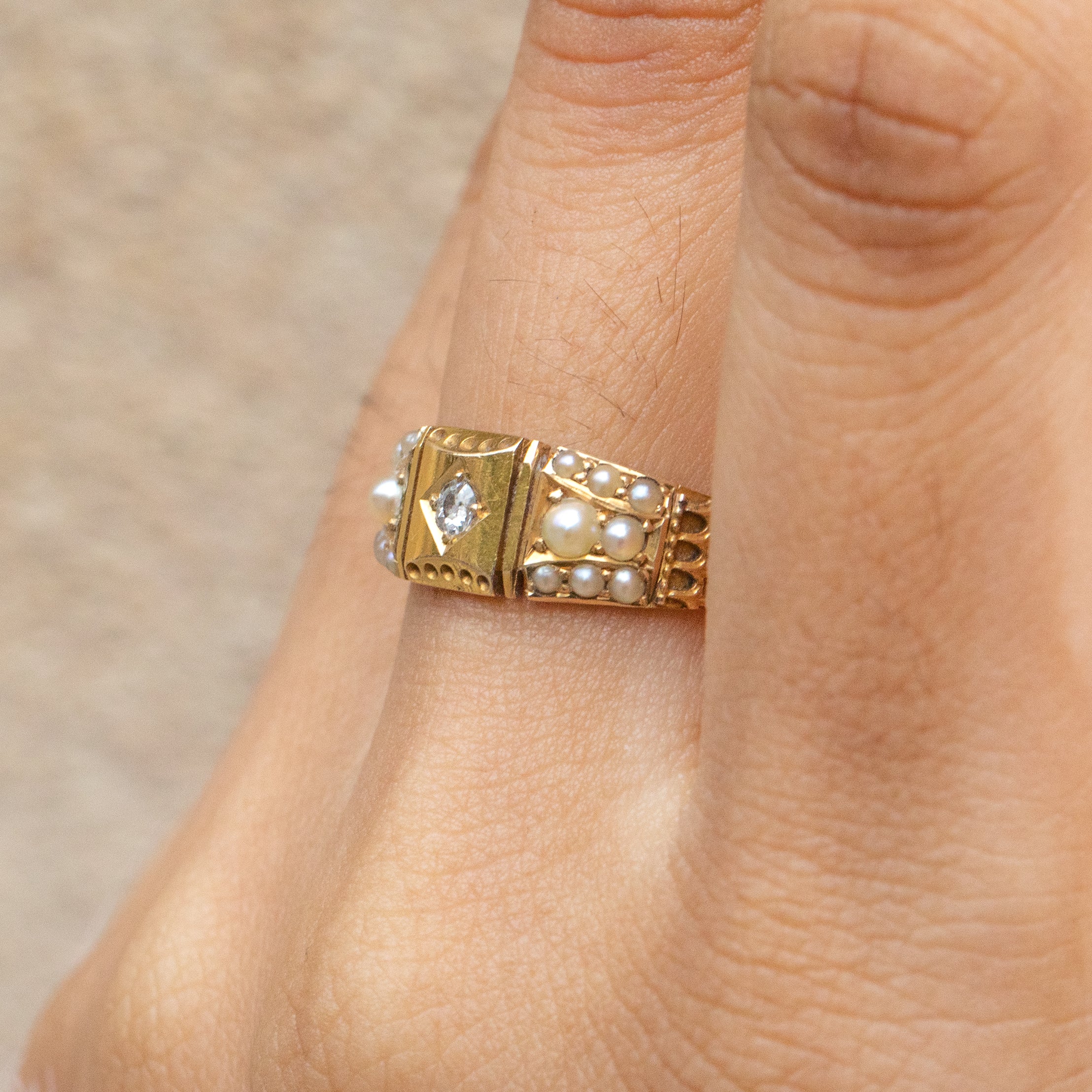 Oozing with refined elegance, this Victorian Gold ring will look superb as a standalone piece or stacked alongside your favourite bands. You won't be able to help but fall in love with the Diamond's sparkle, the buttery Gold, and luminous Pearls - a combination that pleases all!