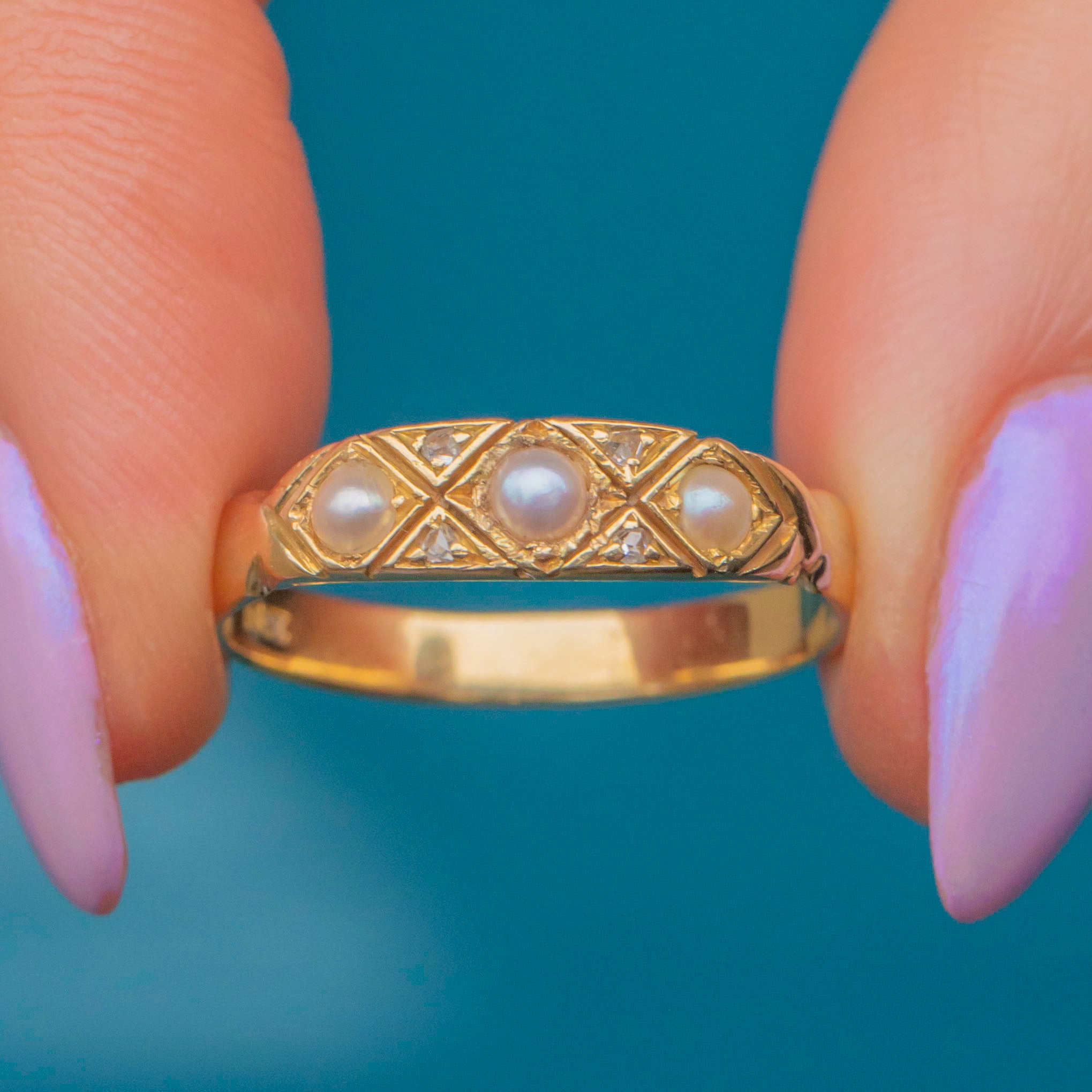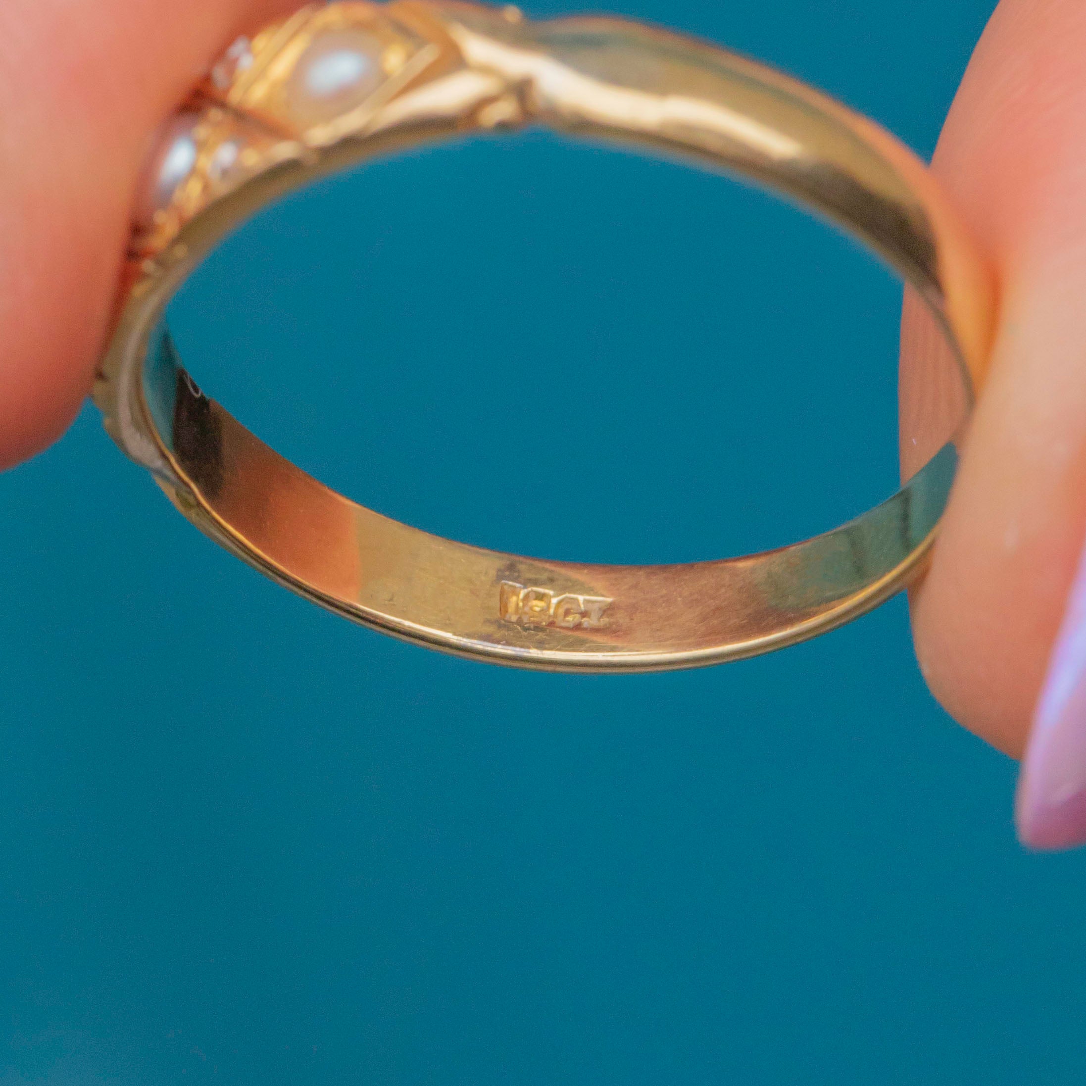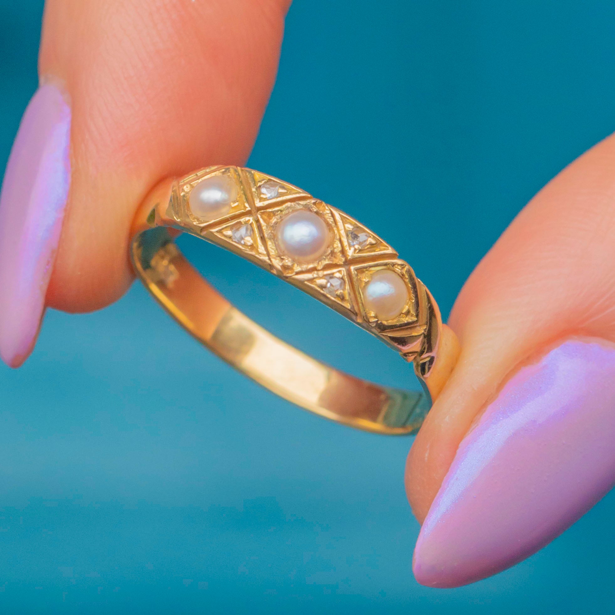This Victorian 18ct Gold Diamond Pearl ring is all things elegant! Inlaid with three iridescent Pearls and twinkling Diamond spacers, she would make a beautiful antique stacking ring.