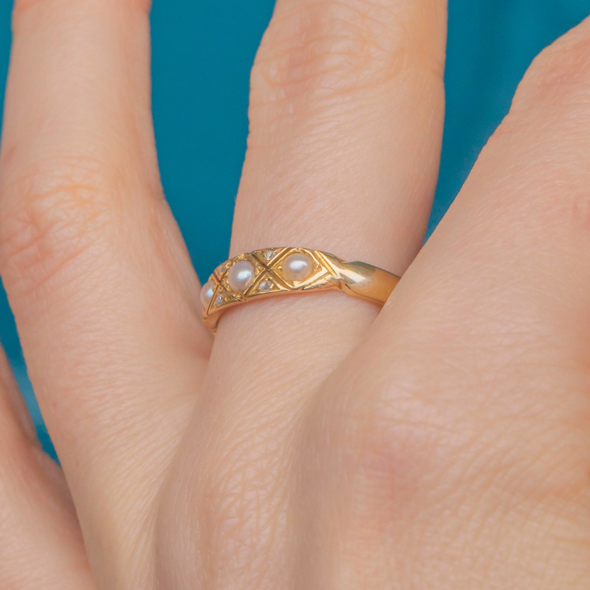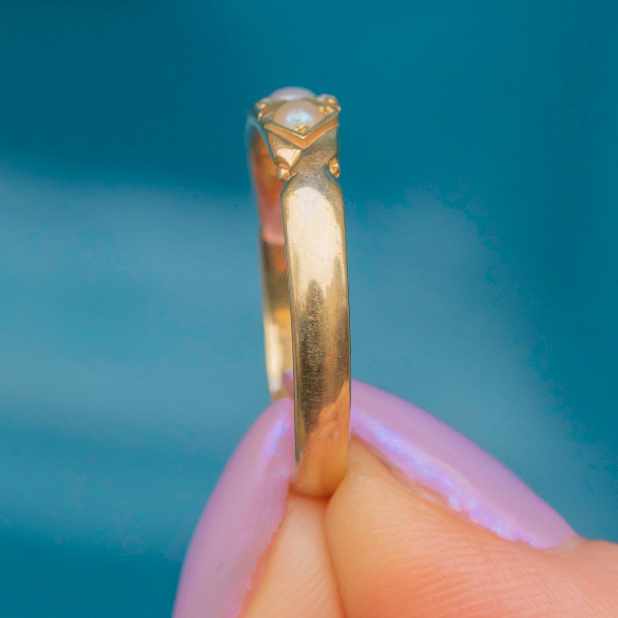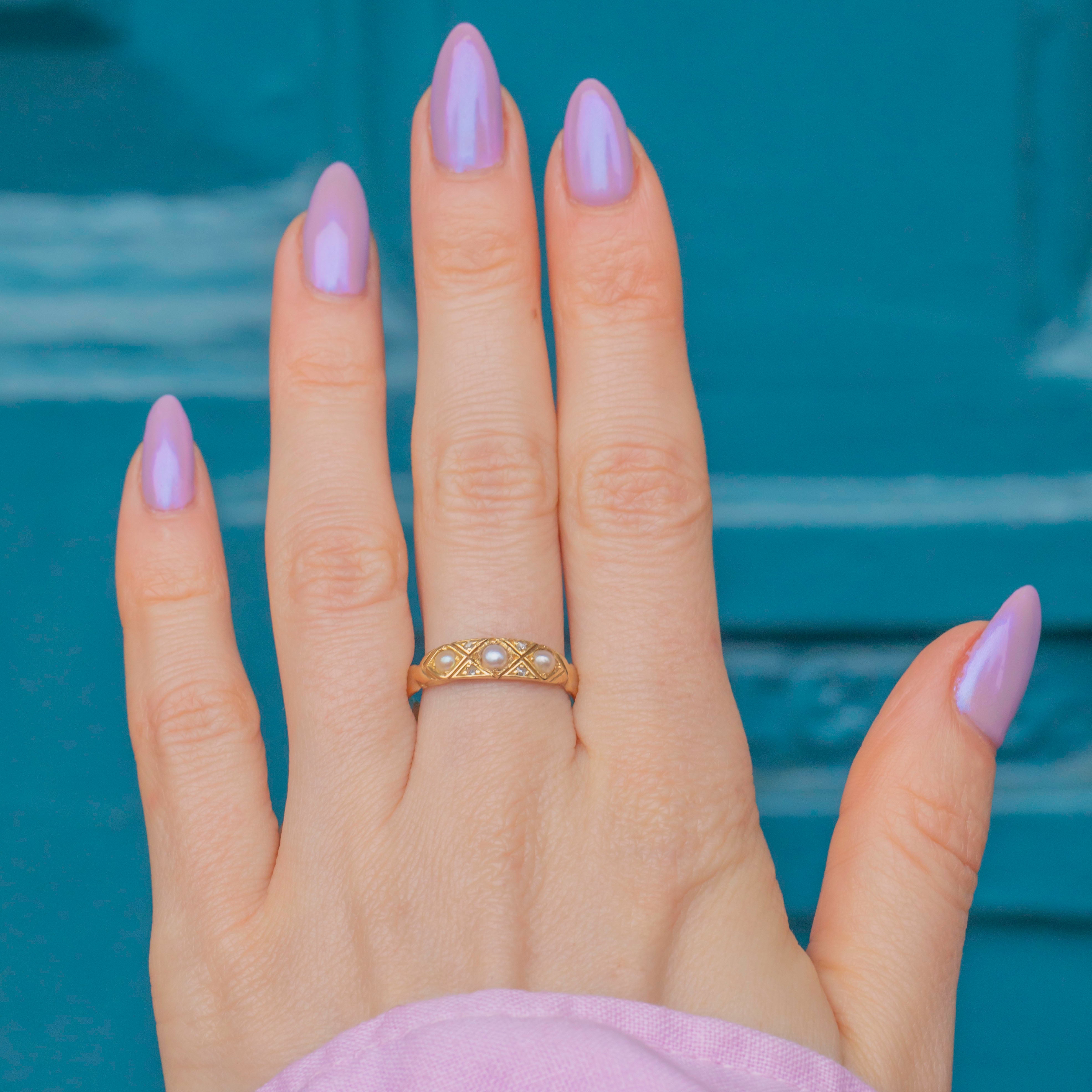 This Victorian 18ct Gold Diamond Pearl ring is all things elegant! Inlaid with three iridescent Pearls and twinkling Diamond spacers, she would make a beautiful antique stacking ring.