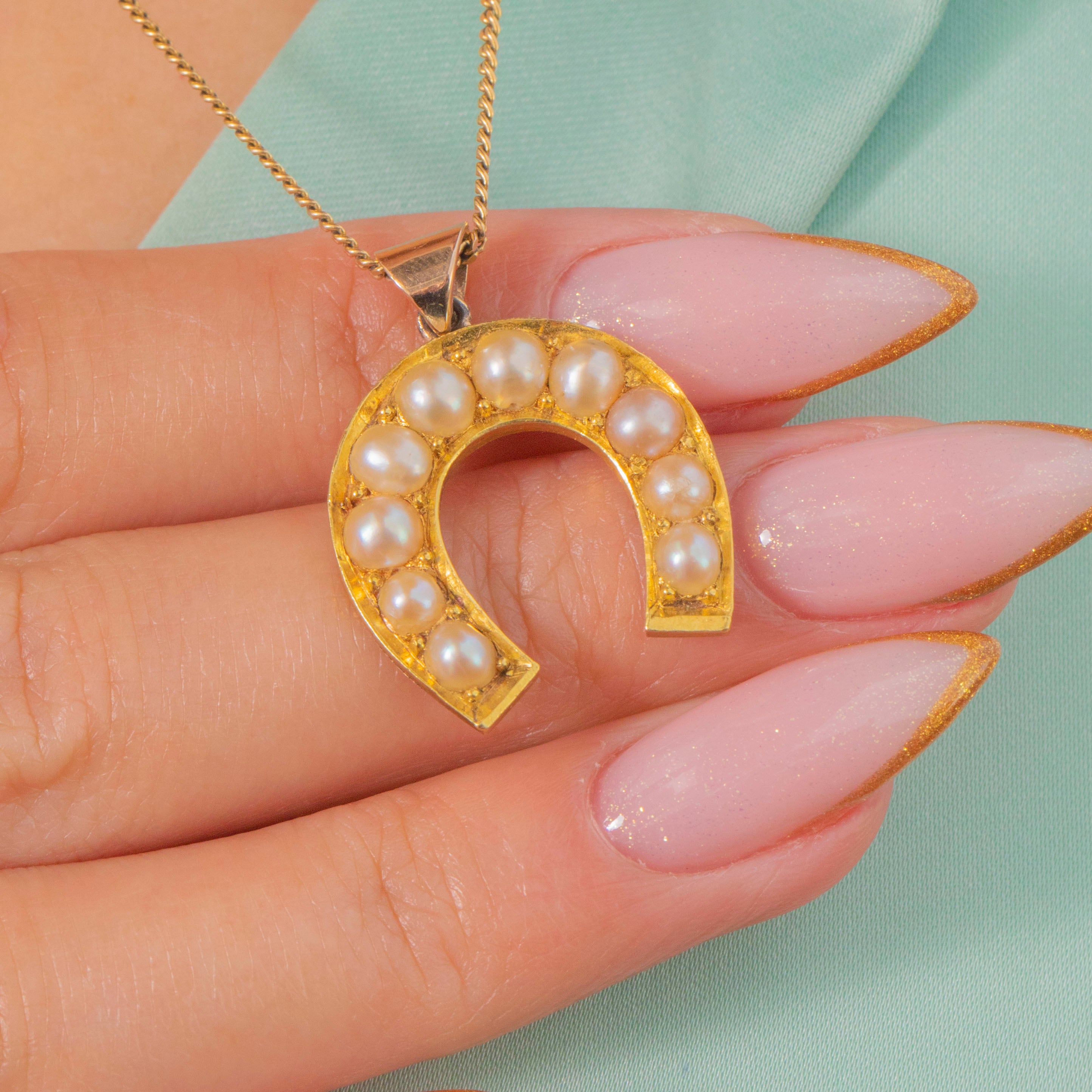 A charming Victorian Pearl horseshoe pendant, crafted in rich 18ct Yellow Gold. Each creamy Pearl is individually set and beautifully matched, their soft ivory tones shimmering with subtle blush and champagne overtones.