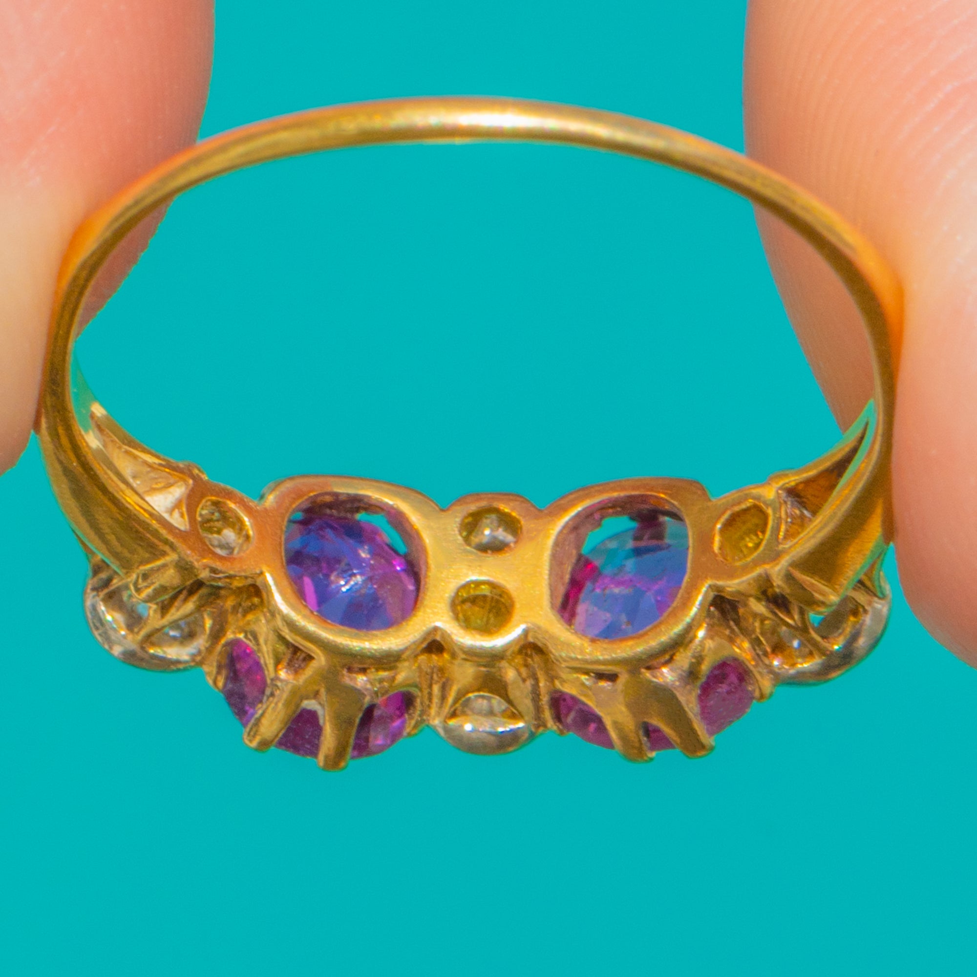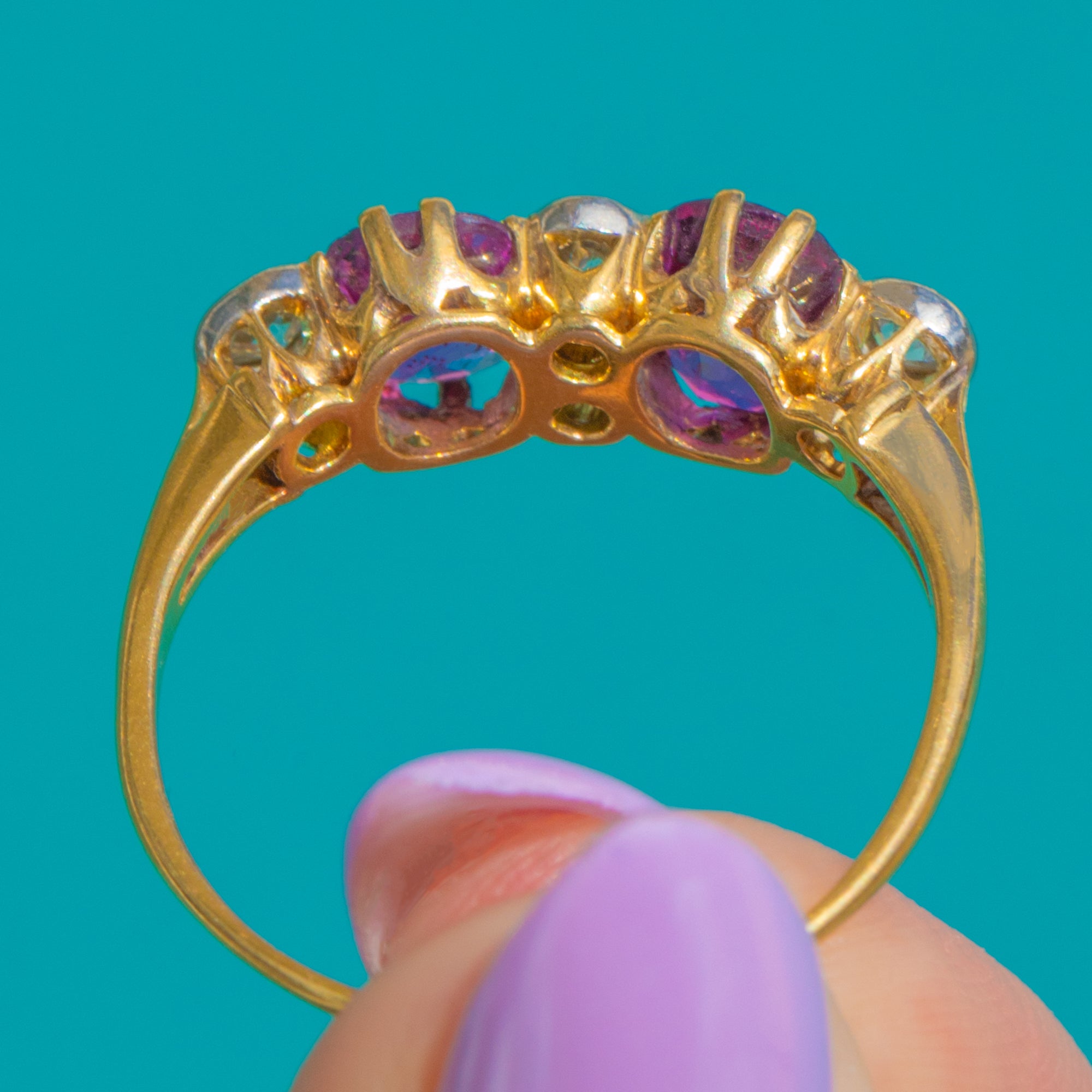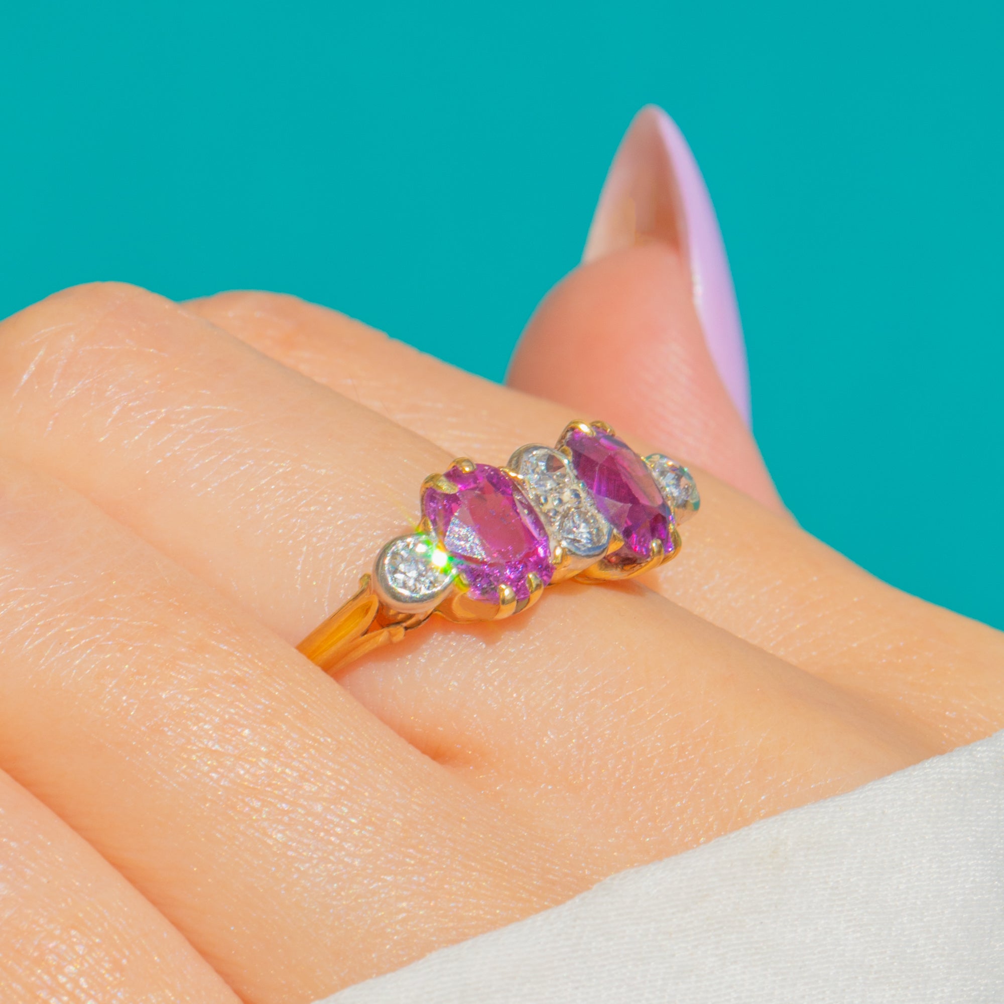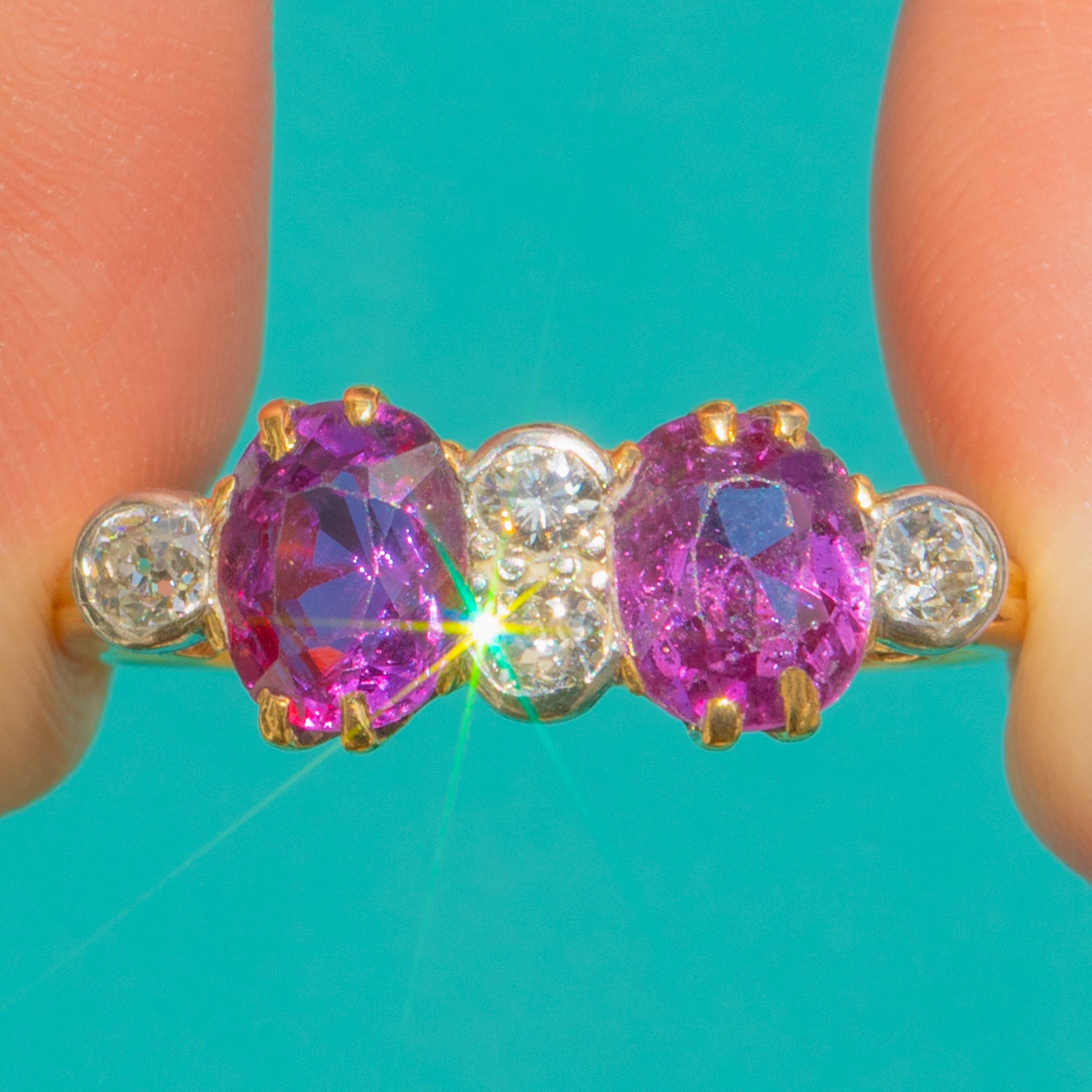 A romantic Victorian six-stone ring set with twin oval Pink Sapphires glowing a vivid pink-purple and accented by crisp, sparkling Diamonds. Crafted in rich 18ct Gold, the stones sit in a refined basket that invites the light to dance through each facet.