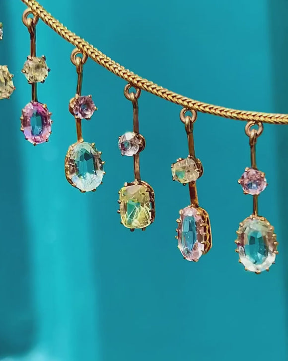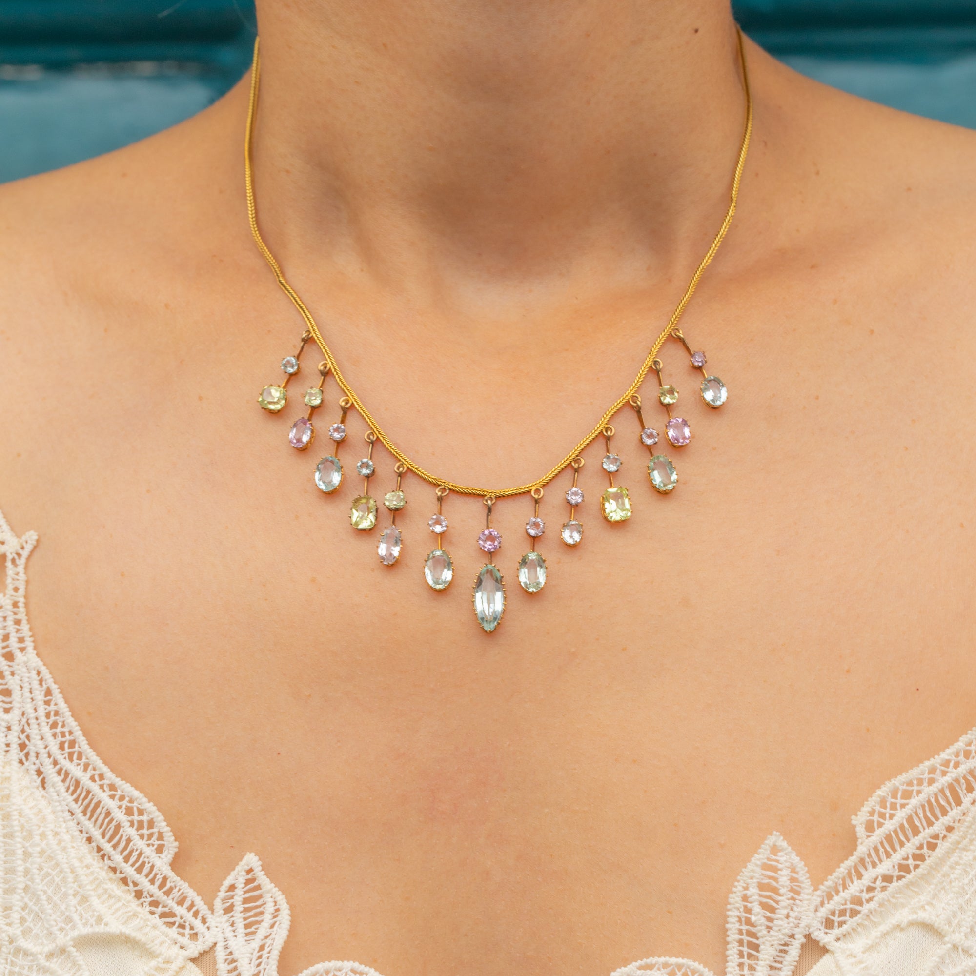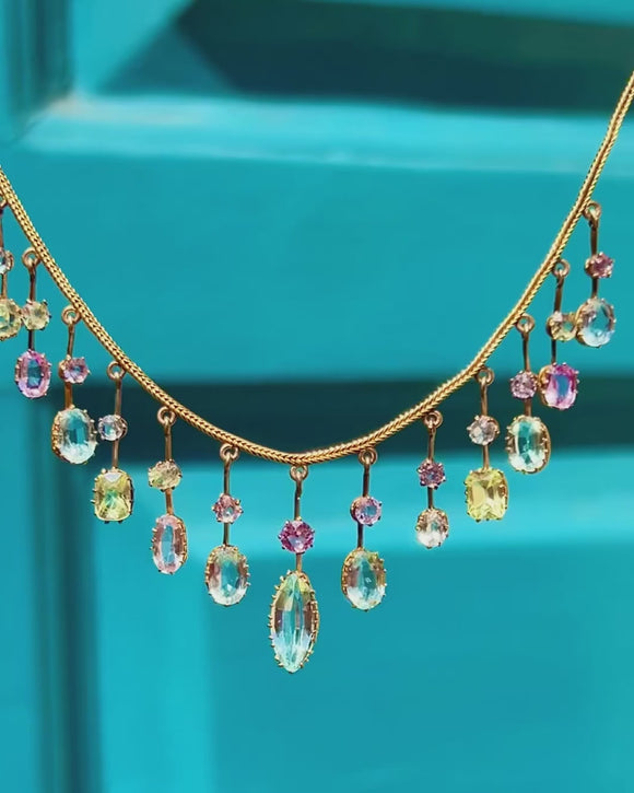 Antique 18ct Gold Pink Topaz, Aquamarine, Chrysoberyl Fringe Necklace