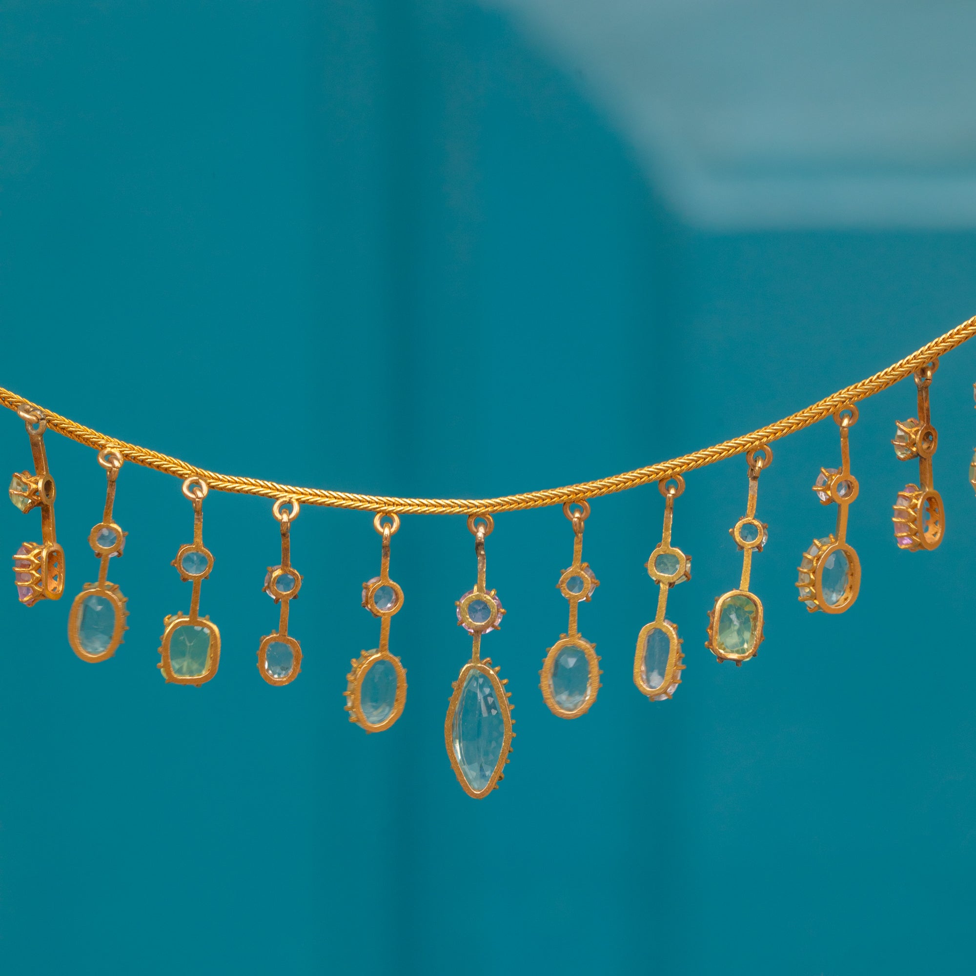 This resplendent Victorian necklace suspends a myriad of soft pastel gemstones, comprised of Pink Topaz with a soft lilac hue, icy blue Aquamarine, and cool chartreuse Chrysoberyl stones.
