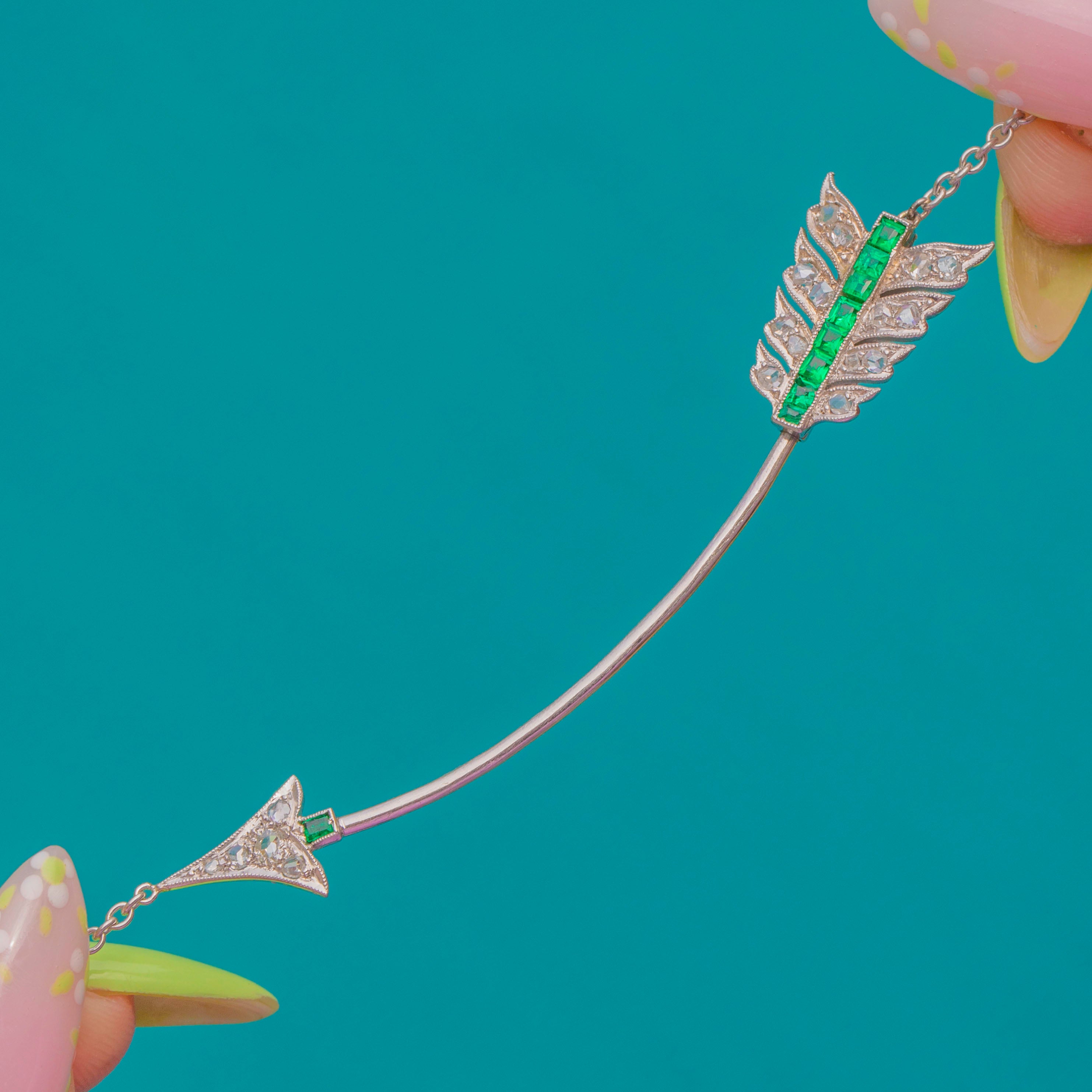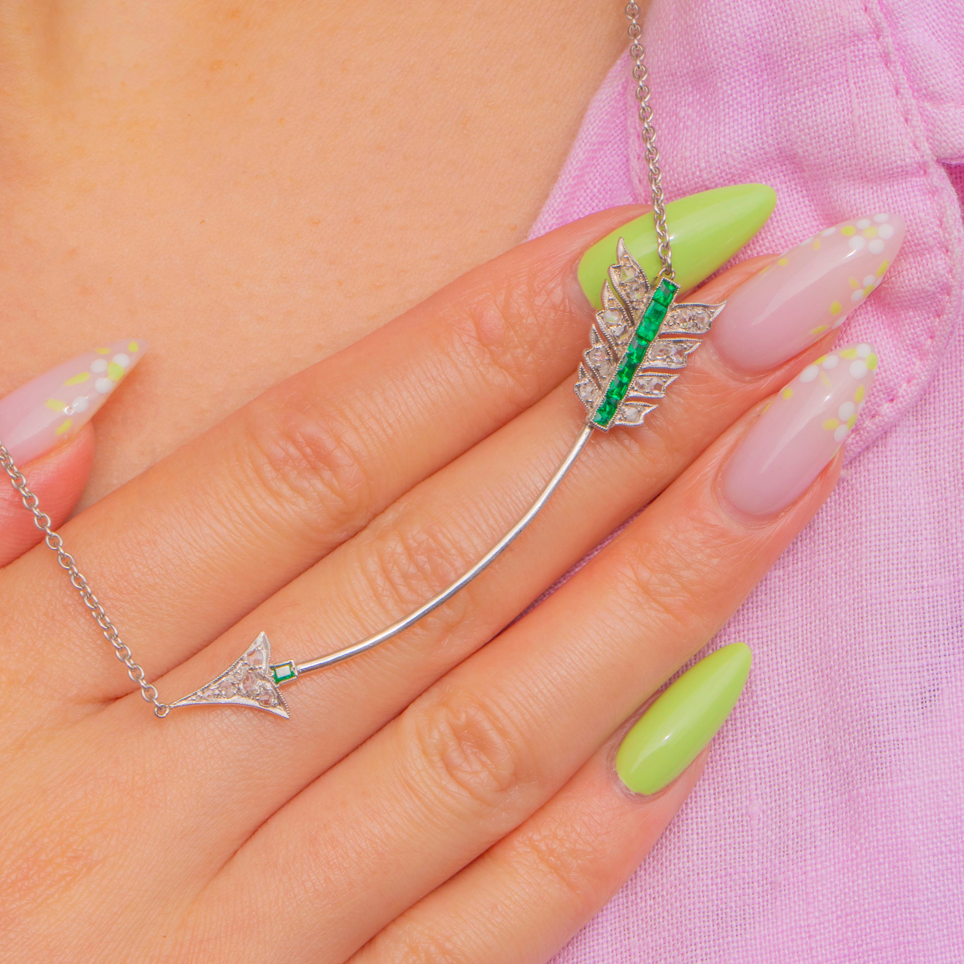 A rare and charming Edwardian treasure, this working Jabot Pin has been cleverly fashioned into a sleek arrow necklace. The arrow glides with vivid Emeralds through its centre and glitters with Diamond accents, framed by crisp milgrain and delicate openwork to the fletching and head. The refined pairing of Platinum and 18ct White Gold gives the piece its icy luminosity and elegant poise.