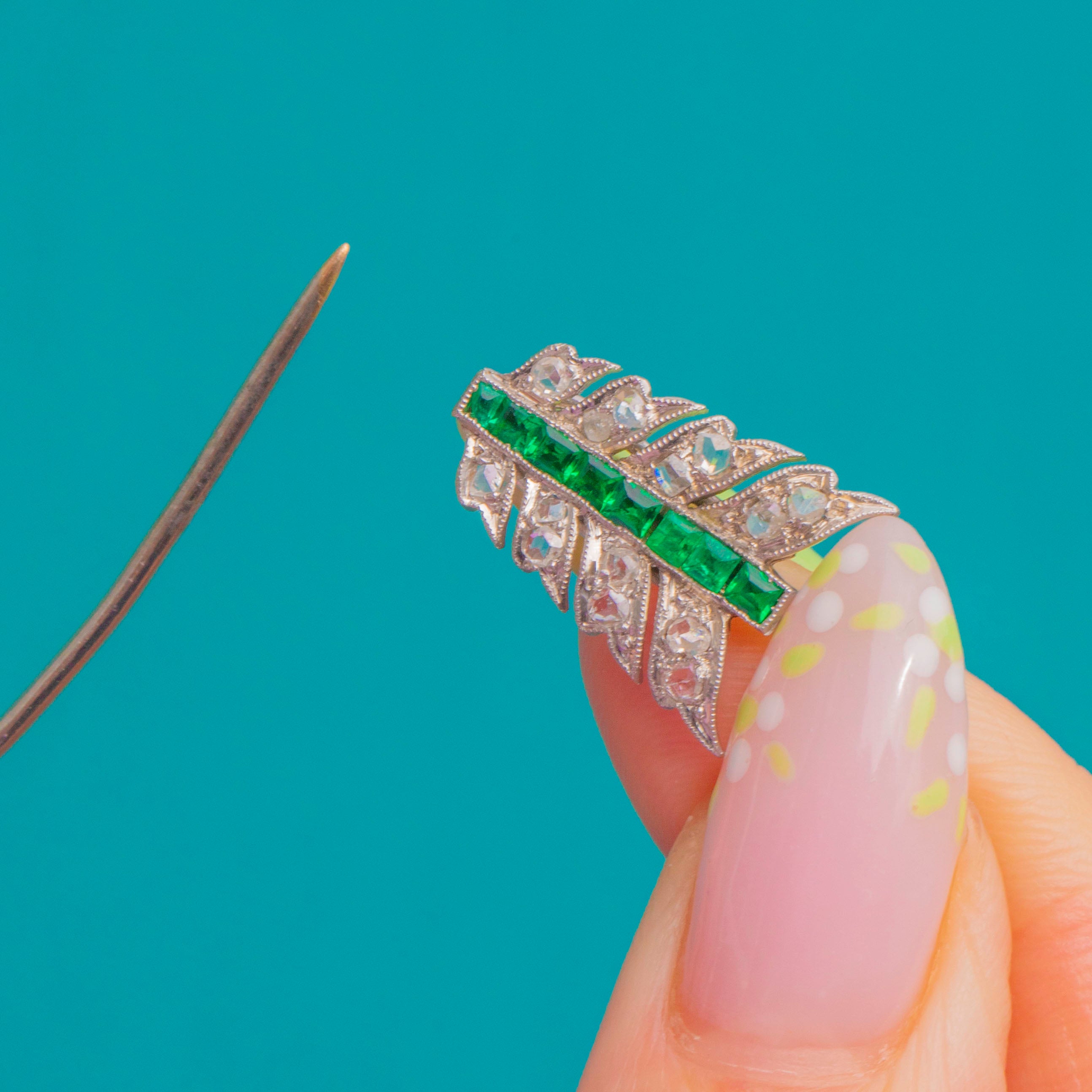 MATERIALS: Tests as Platinum (chain and pin), 18ct White Gold (arrow head and tail), Emerald, Diamond.