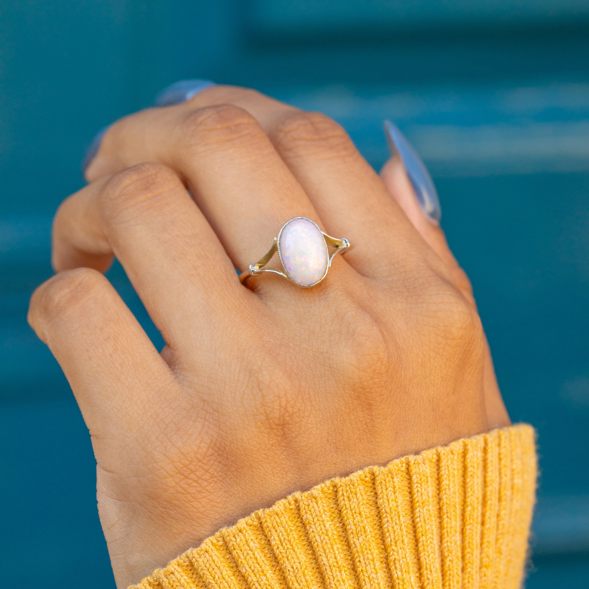 Crafted from 18ct Gold with Platinum settings, this Edwardian ring has elegant split shoulders that will flatter your fingers with her tapered curves. Providing you with excellent coverage, this antique Opal ring will captivate the attention of anyone lucky enough to lay eyes on her!