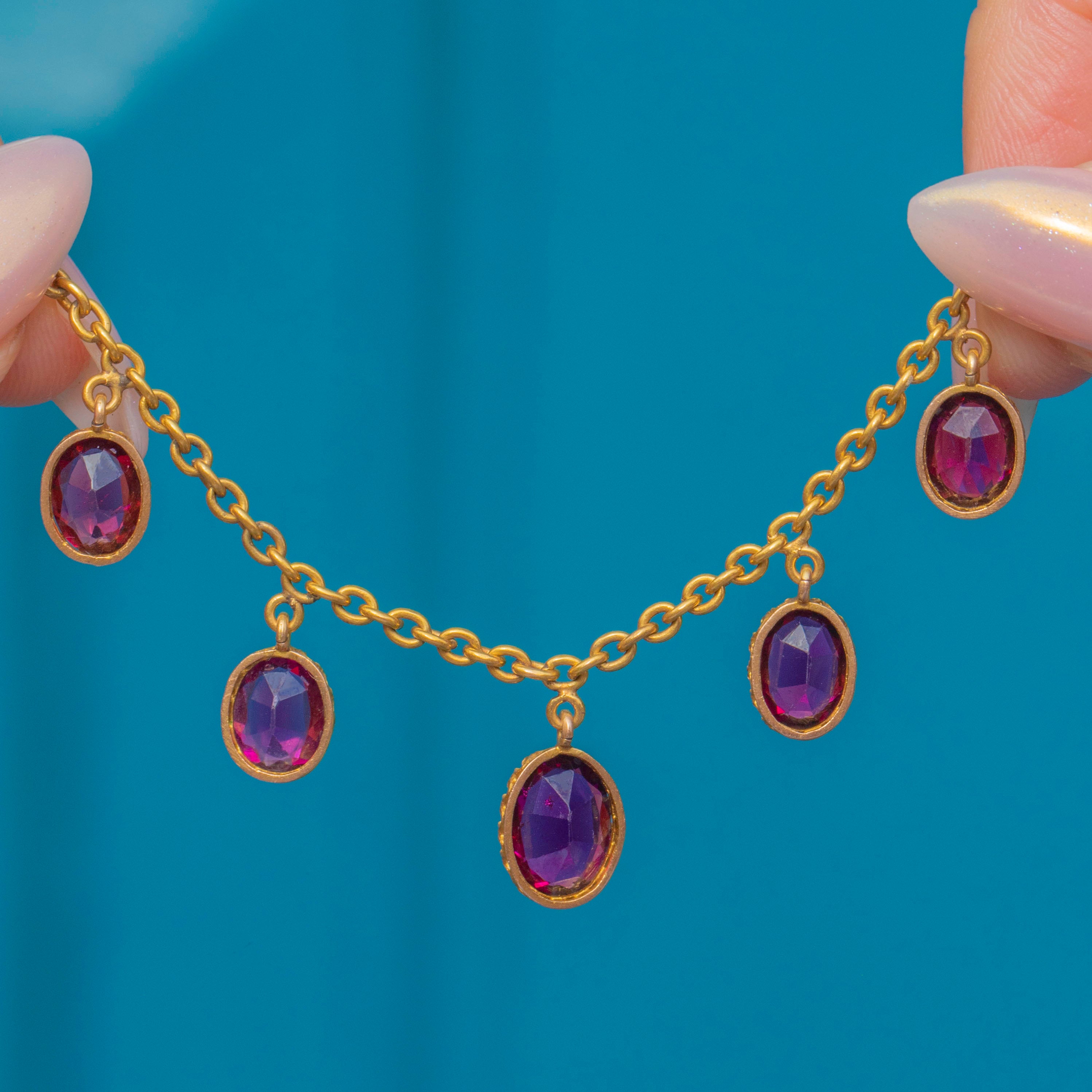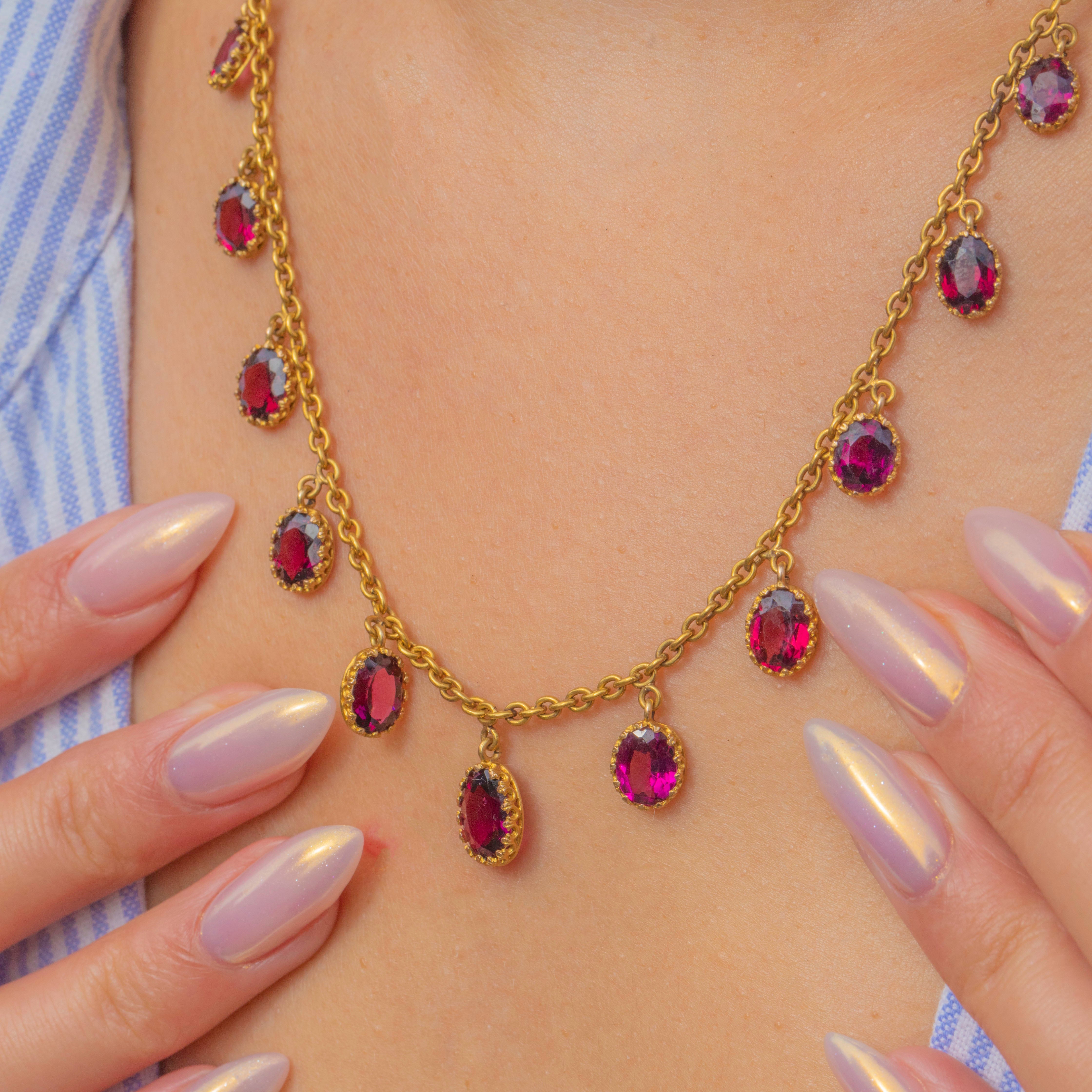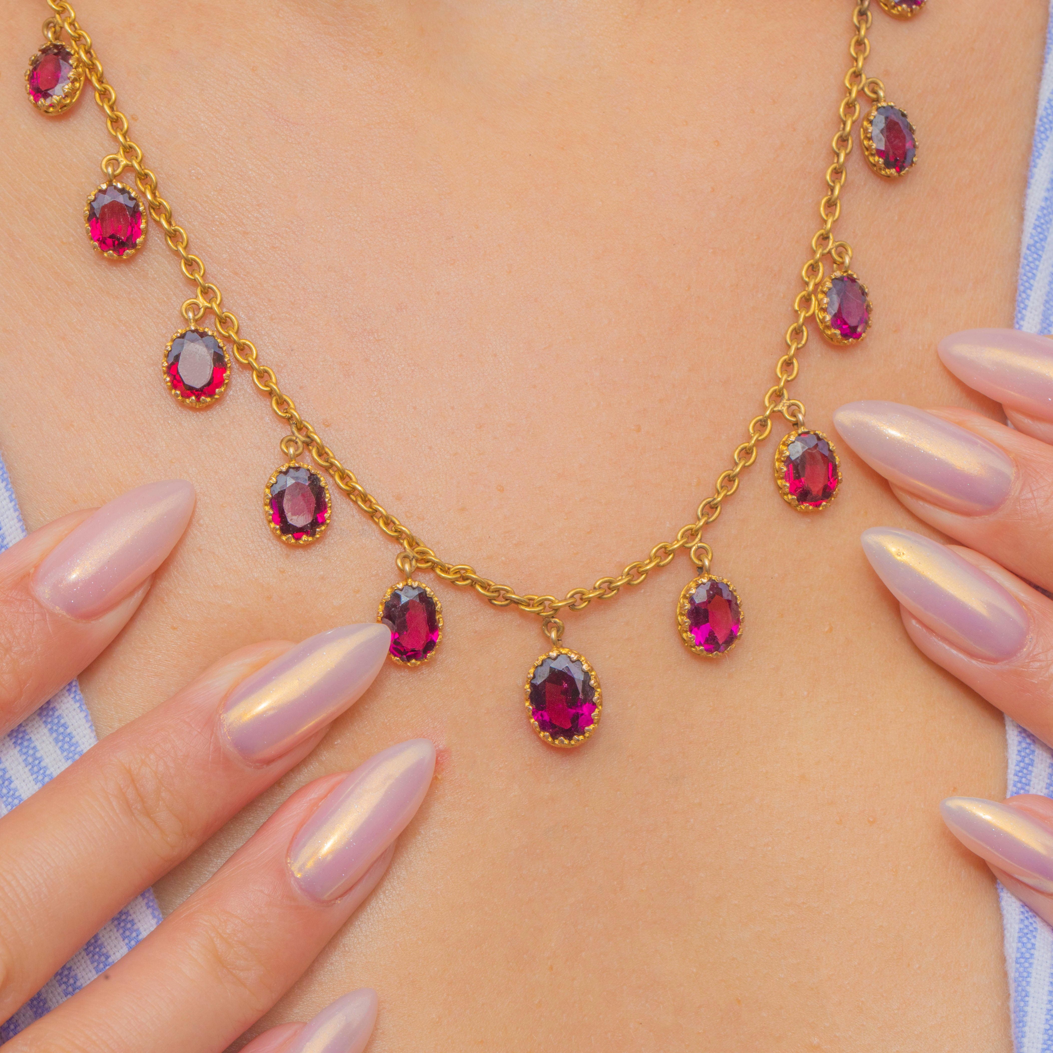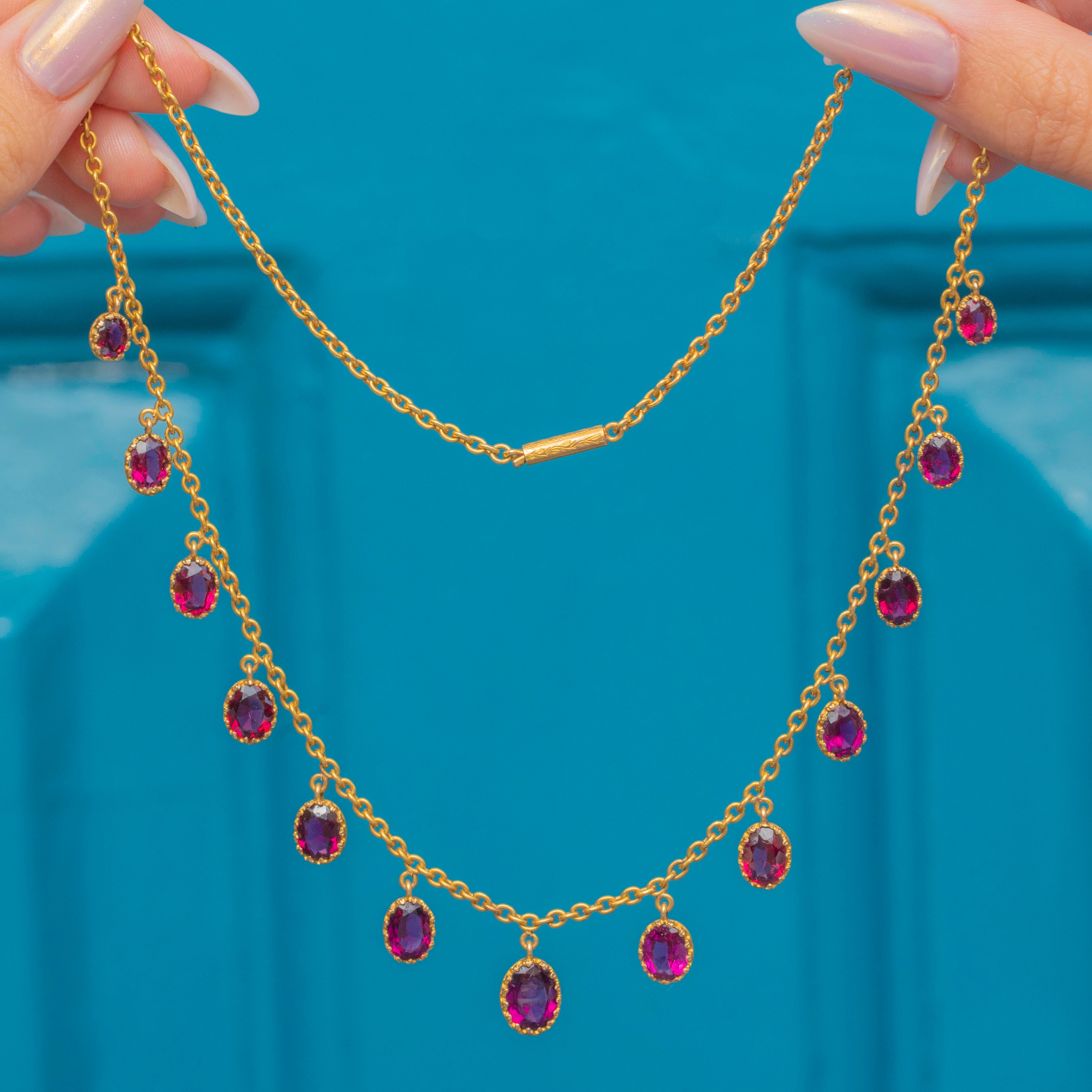 This exquisite Victorian fringe necklace is crafted in rich 18ct Gold and set with glowing Rhodolite Garnets and a gorgeous engraved original antique clasp!