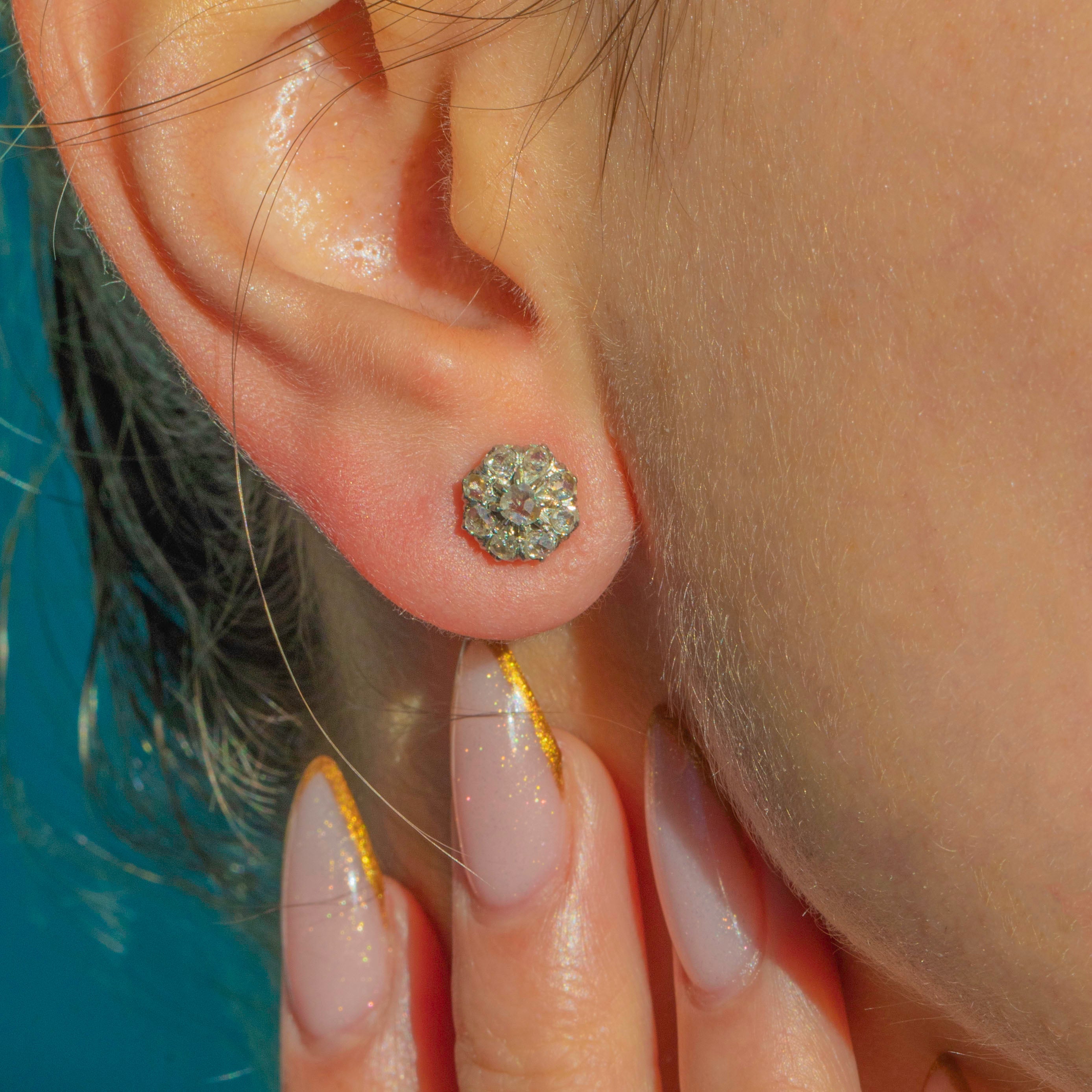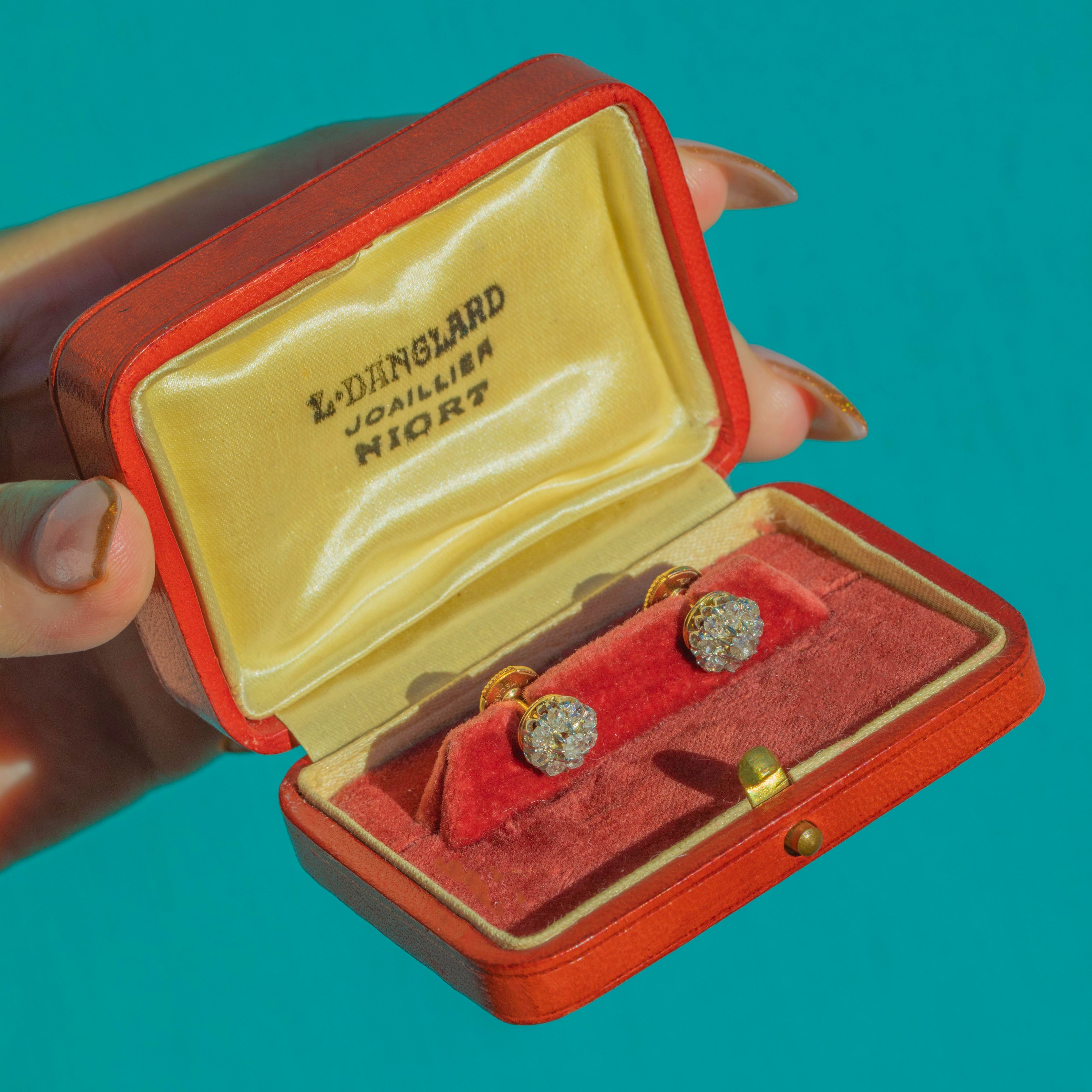 The rose-cut Diamonds have that romantic antique glow, with glittering facets that catch the light beautifully. They are well-matched in colour and cut, giving a harmonious, balanced look on the ear. The studs come presented in an antique French leather earring box for that extra touch of old-world luxury.