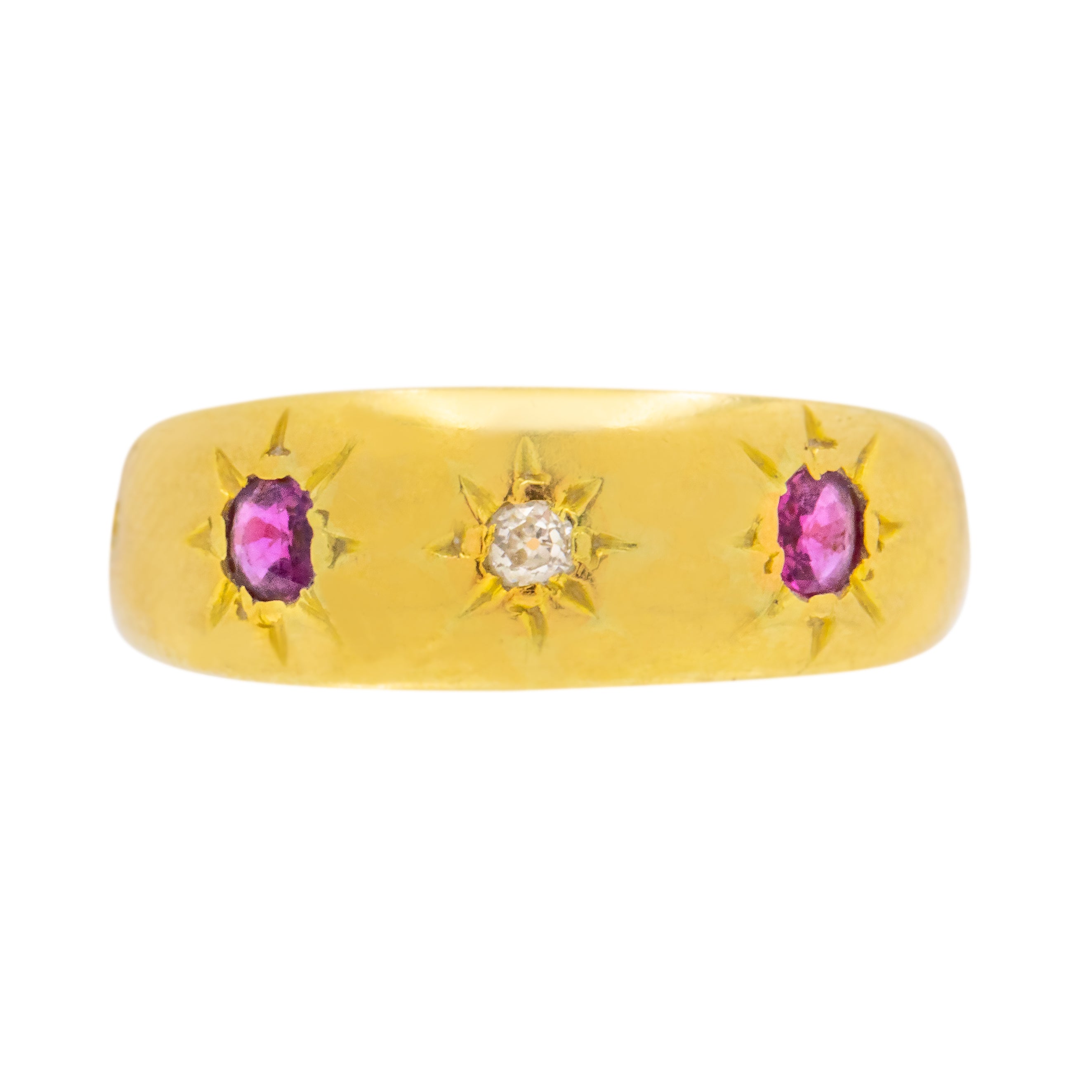 This Victorian gypsy ring will satisfy your penchant for celestial jewels, boasting three star-set gemstones in her centre. With Rubies akin to juicy raspberries flanking a twinkling white Diamond, this ring is a timeless piece of Victorian jewellery that you will treasure forever.