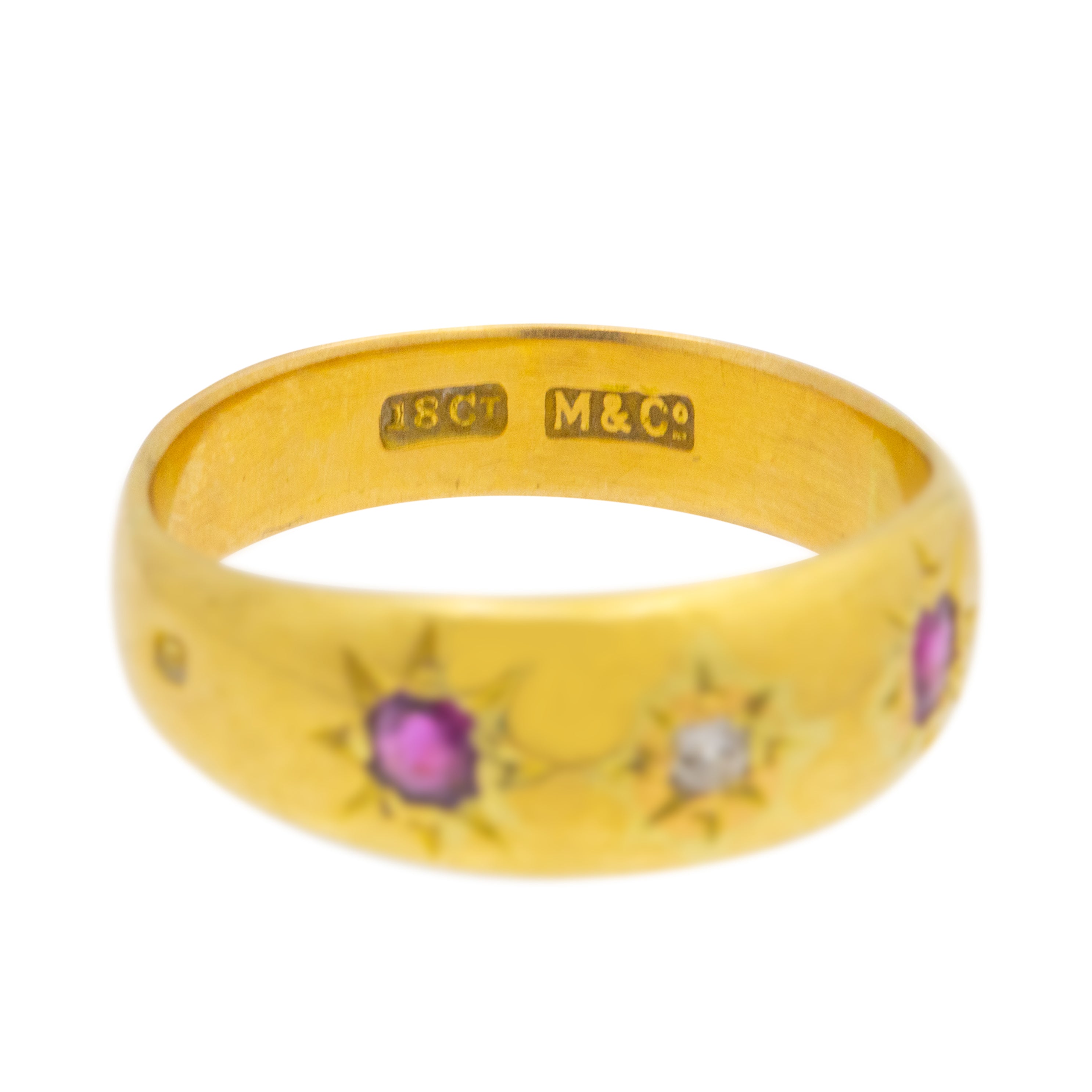 EXCELLENT. This exquisite antique 18ct Gold Diamond Ruby star set gypsy ring is in excellent condition. The Gold is bright and sleek throughout, and the gemstones are securely set with no fleabites to note!