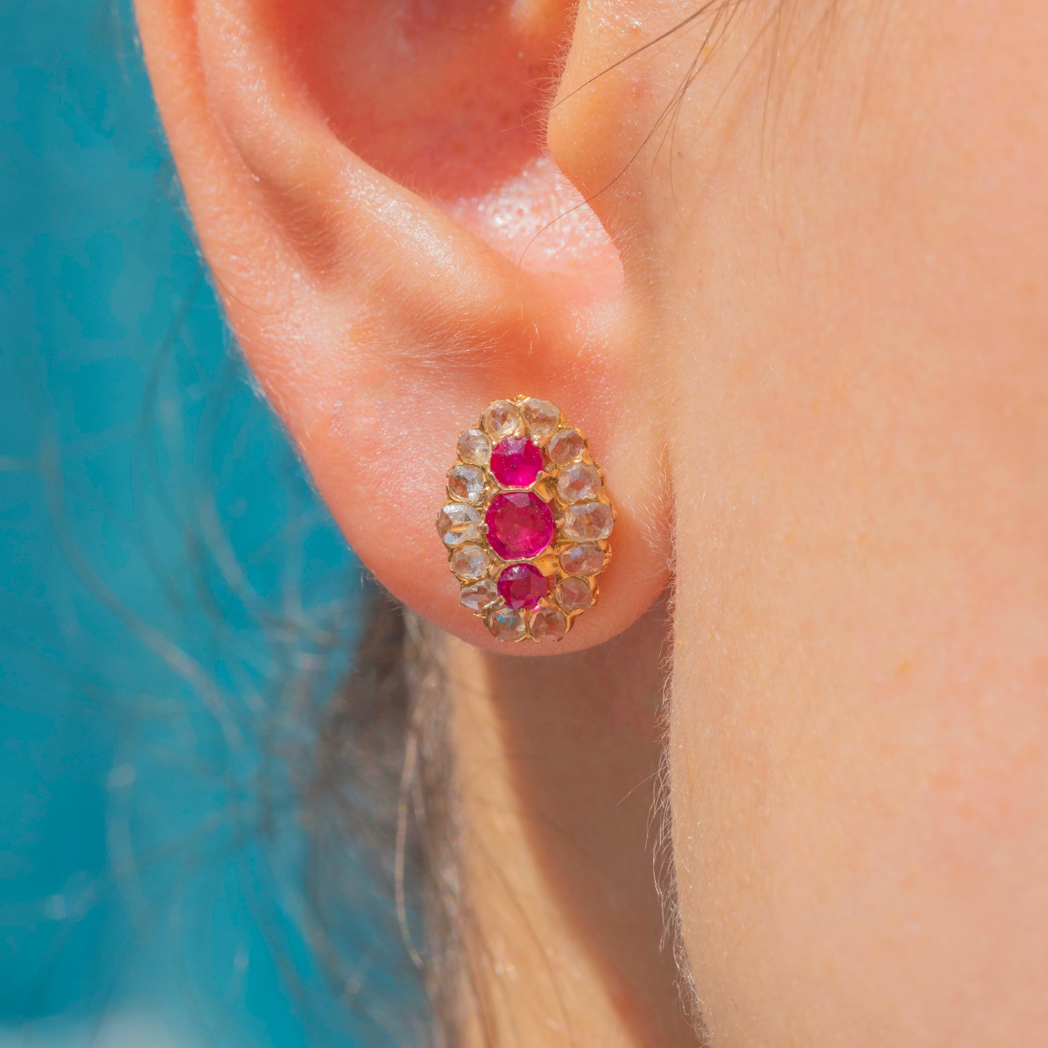 VERY GOOD-EXCELLENT. These antique 18ct Gold rose-cut Diamond cluster stud earrings are in fab condition. The Diamonds and Rubies are secure and super fiery, even to this day! The only thing to note is that the butterfly backs are not perfectly matched; it's likely that one was lost over the years, so a replacement has been used. However, the main thing is that they keep the pair secure in the ear, and you won't notice this difference when you wear them! What a stunning pair!