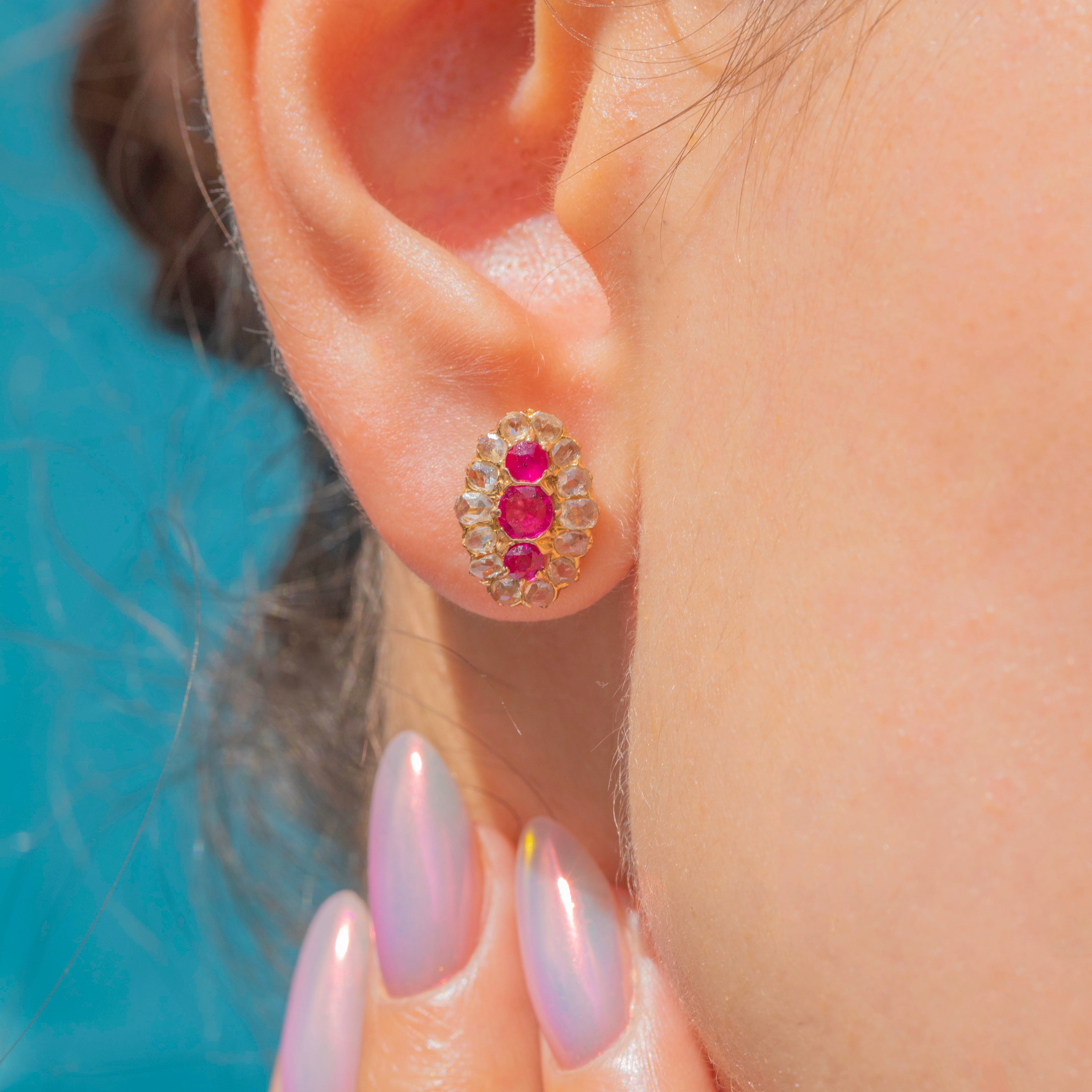 These antique 18ct Gold Ruby rose-cut Diamond cluster stud earrings are a marvel! Set in 18ct Gold are a total of twenty-eight scintillating Diamonds and six berry red Rubies, culminating in a gemstone cluster that leaves nothing more to be desired!
