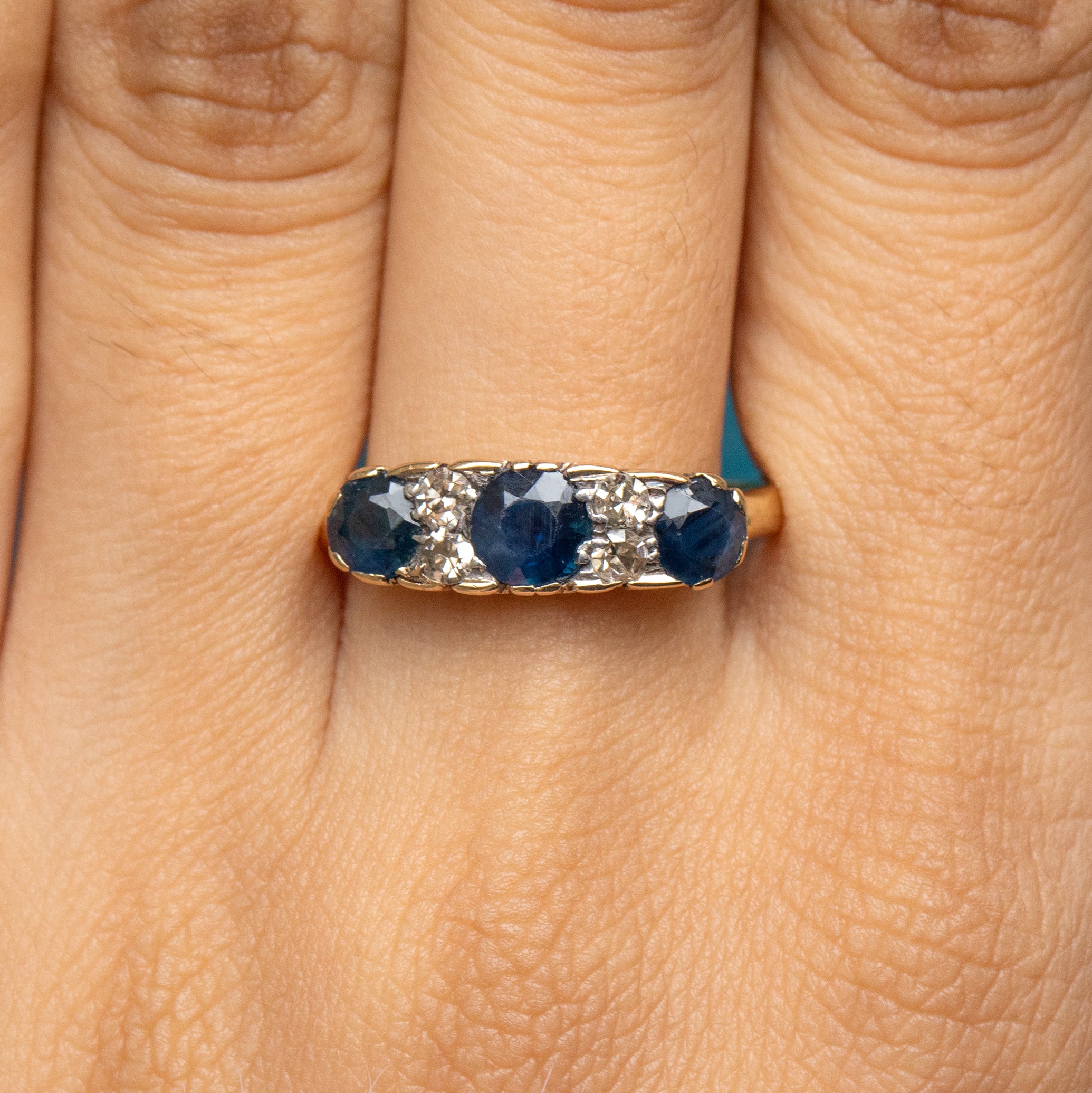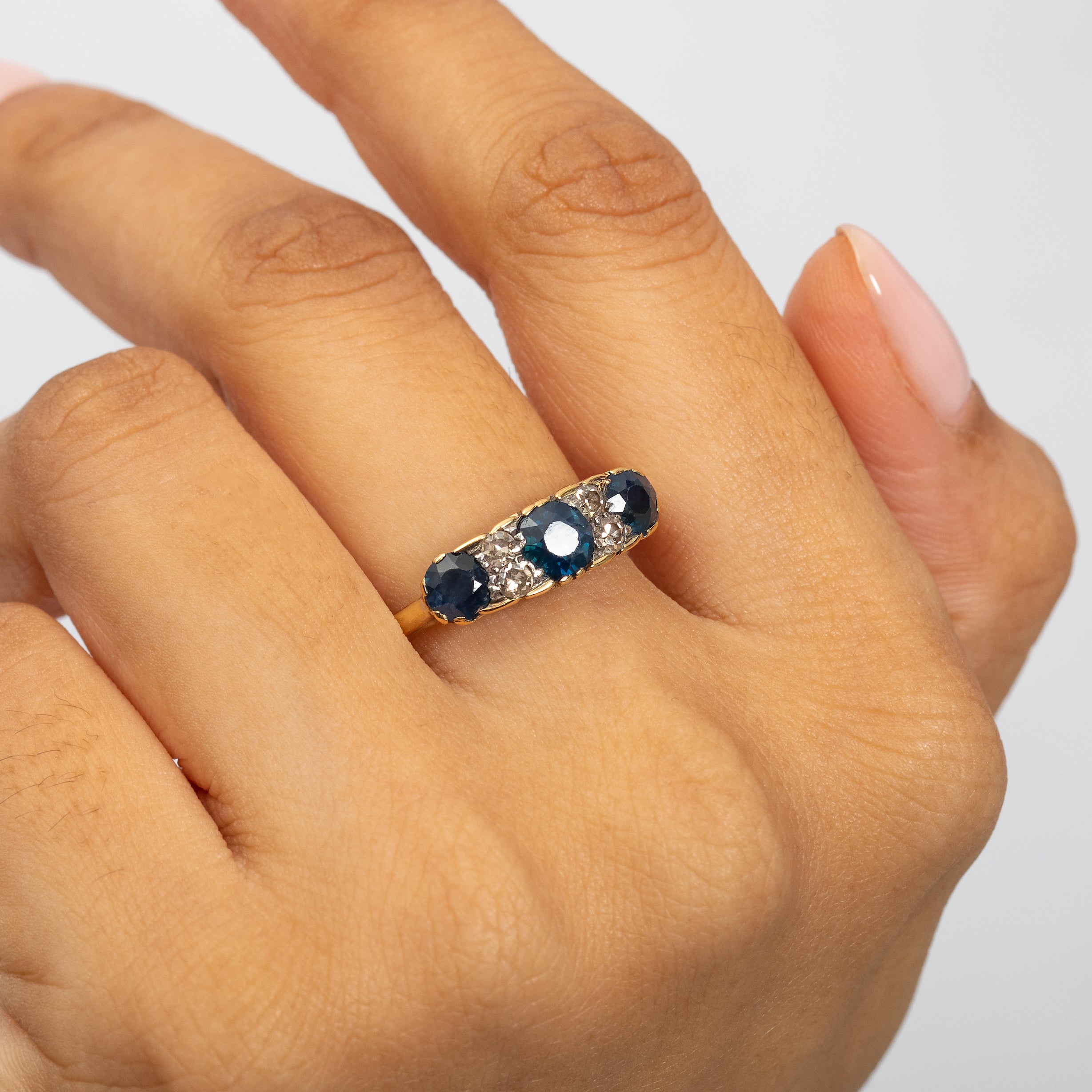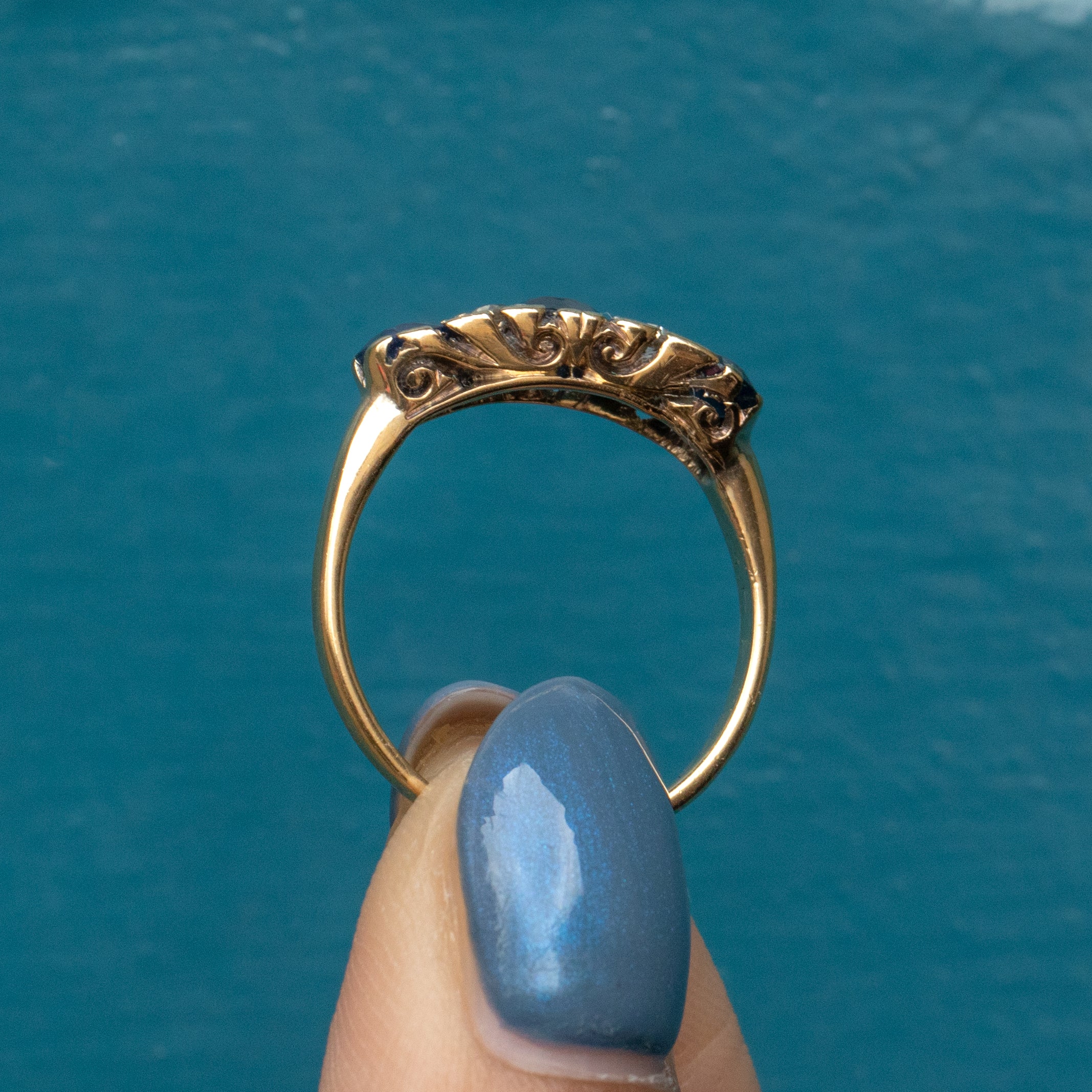 The deep royal natural blue Sapphires, with a total weight of 1.00ct, are accompanied by a sprinkling of old European-cut Diamonds for a timeless antique finish. The gallery of the ring is typically Victorian, and we adore its wispy and flowing form; they just don't make rings quite like this anymore!