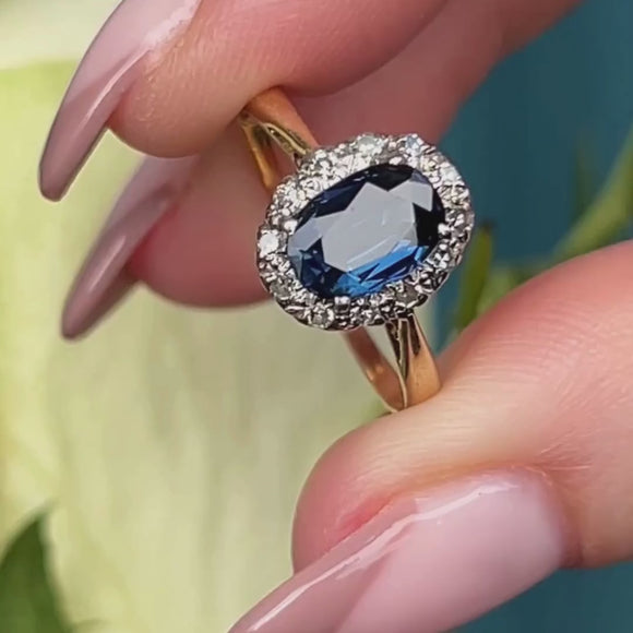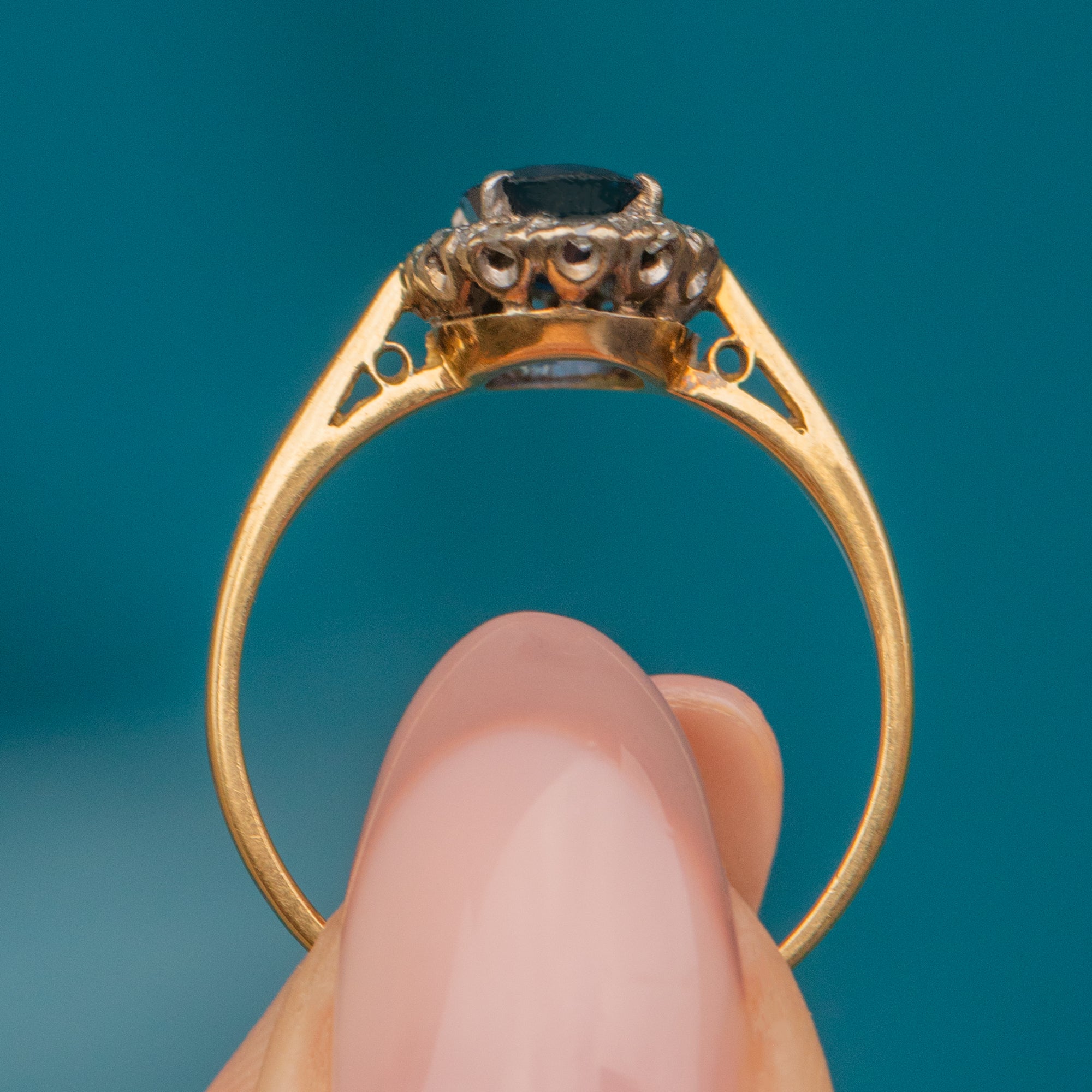 Perfect for everyday wear, this antique 18ct Gold Sapphire Diamond cluster ring would make a fabulous choice for a unique engagement ring! The 0.92ct Sapphire will instantly grab your attention, with its midnight blue hue and crisp catches that reveal glimmers of cobalt as they catch the light.