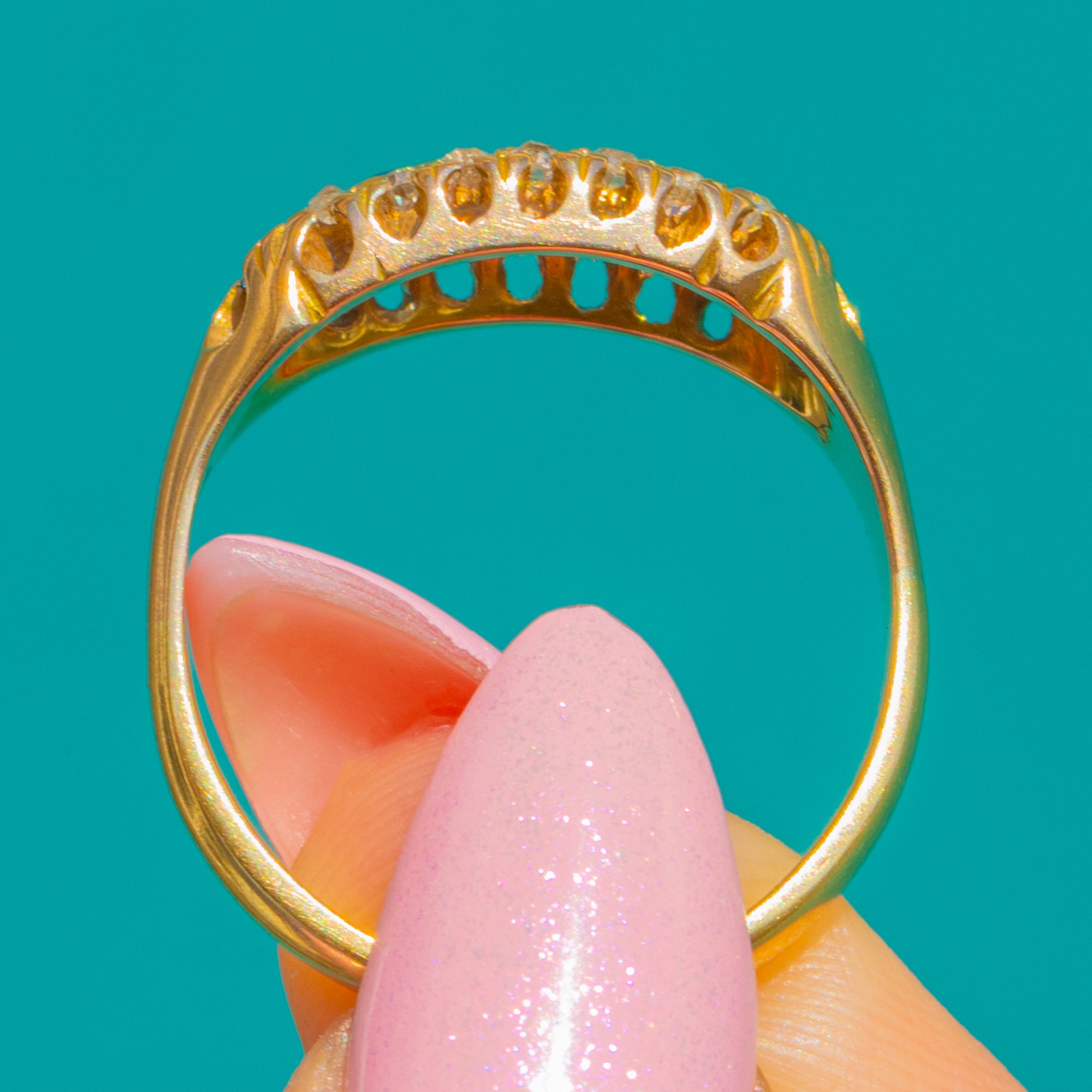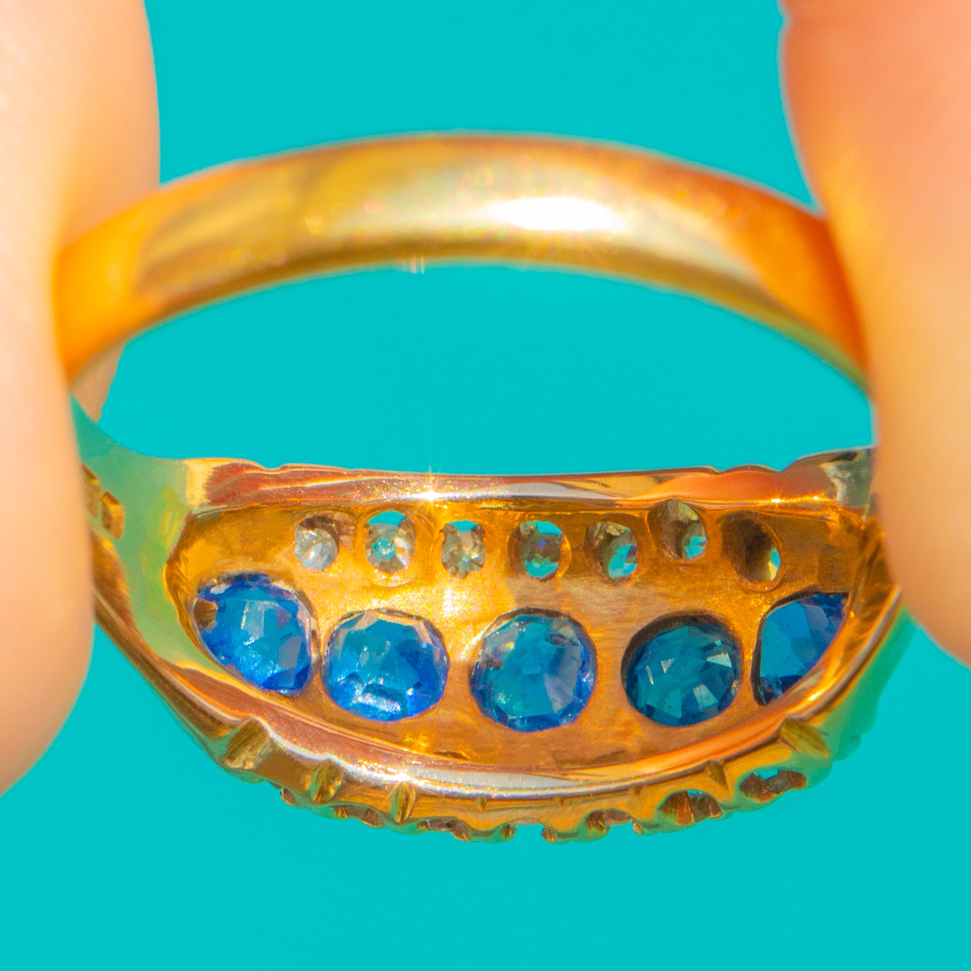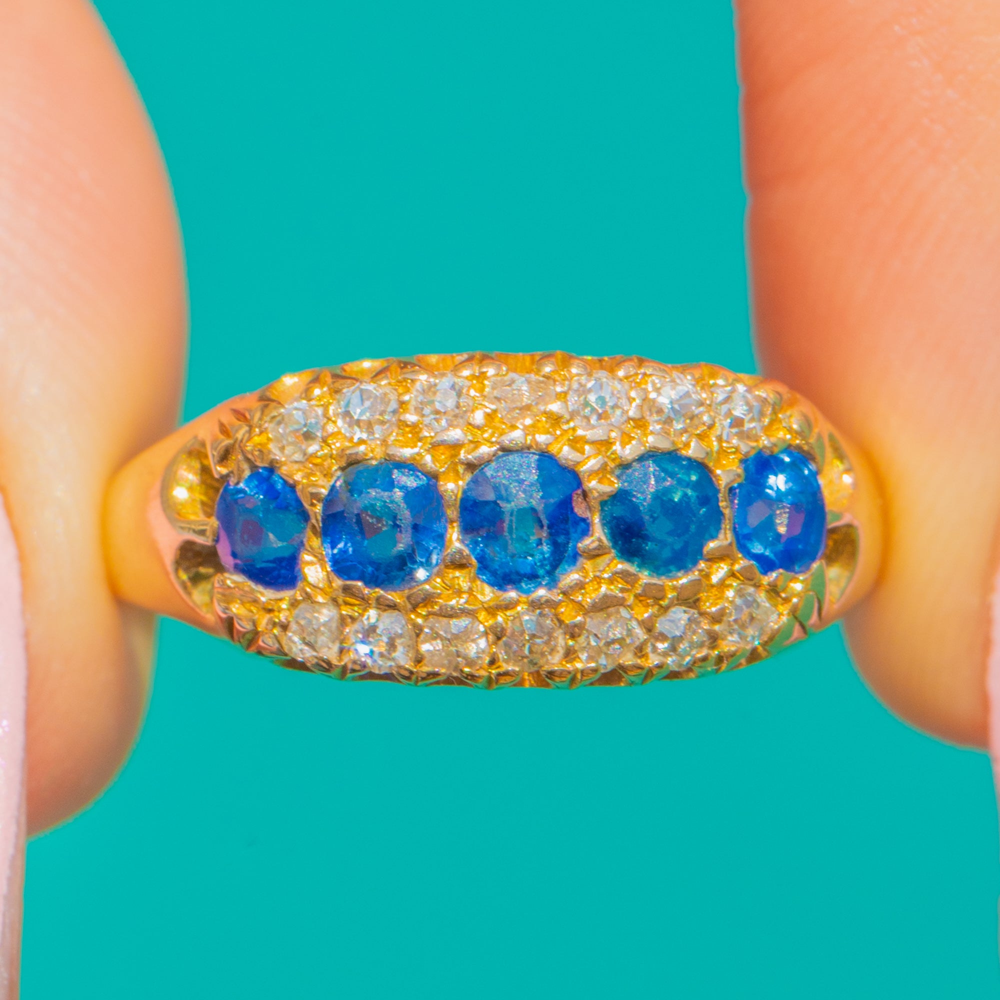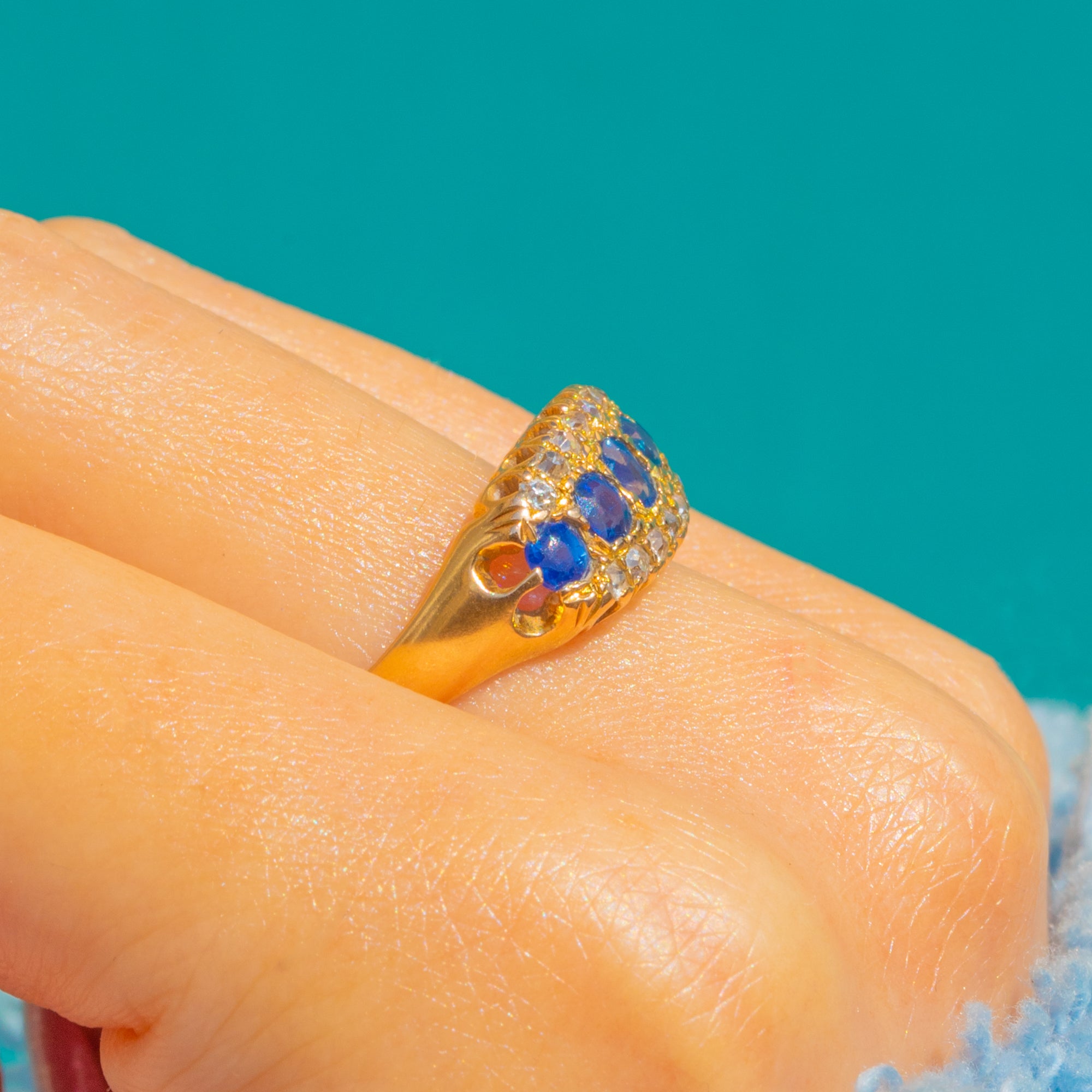 EXCELLENT: Bright, lively Sapphires and sparkling old mine cut Diamonds with no missing stones. The 18ct Gold shows minimal surface wear consistent with age, and the settings are secure and well-preserved. The shank remains strong with no evidence of restoration or resizing marks.