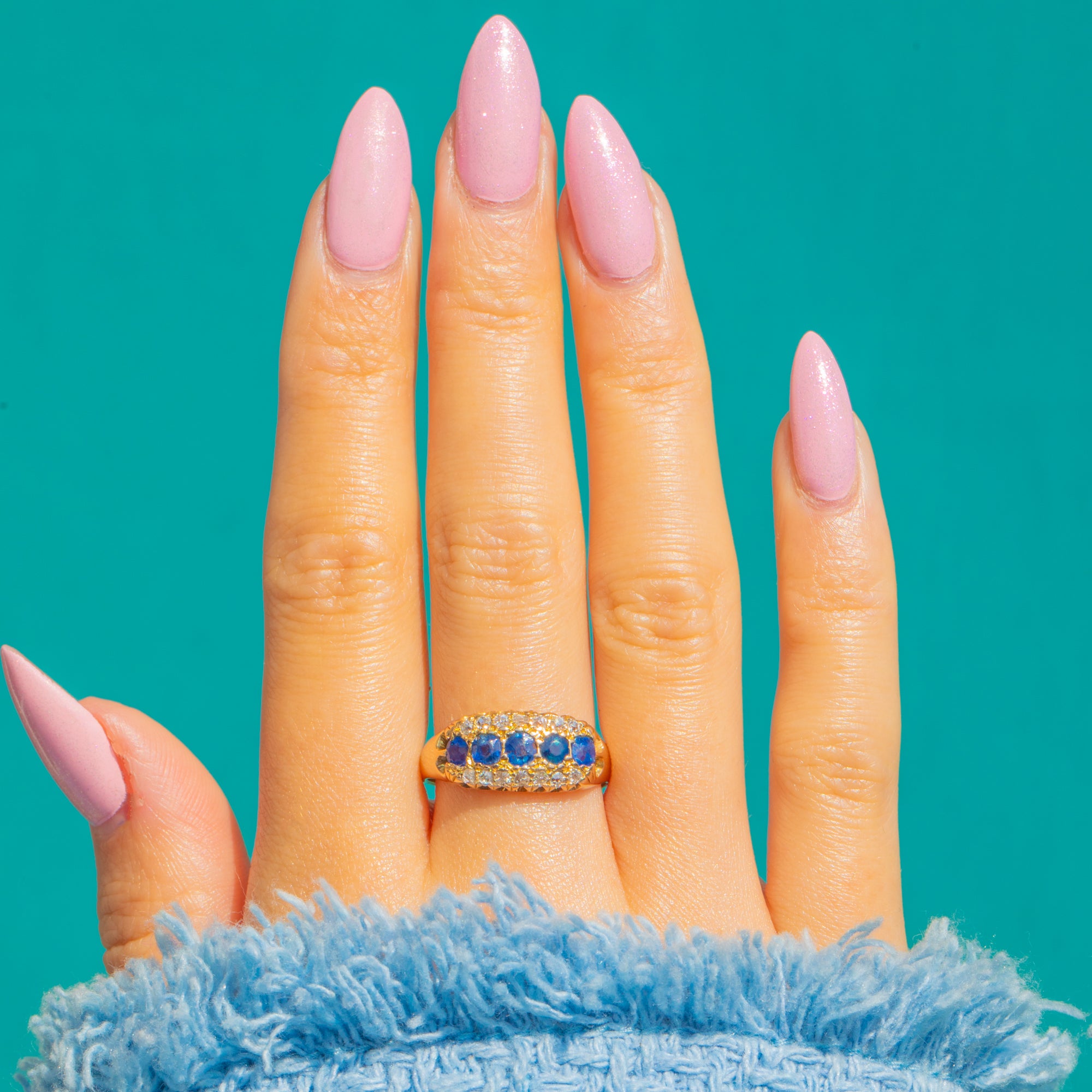 Brimming with Victorian charm, this 18ct Gold cluster stacking ring pairs velvety Cornflower Blue Sapphires with a scintillating halo of antique old mine cut Diamonds. The vivid blue of the Sapphires sings against the warm Gold, while the Diamond accents add a fine, twinkling brilliance that feels elegant from every angle.
